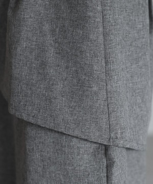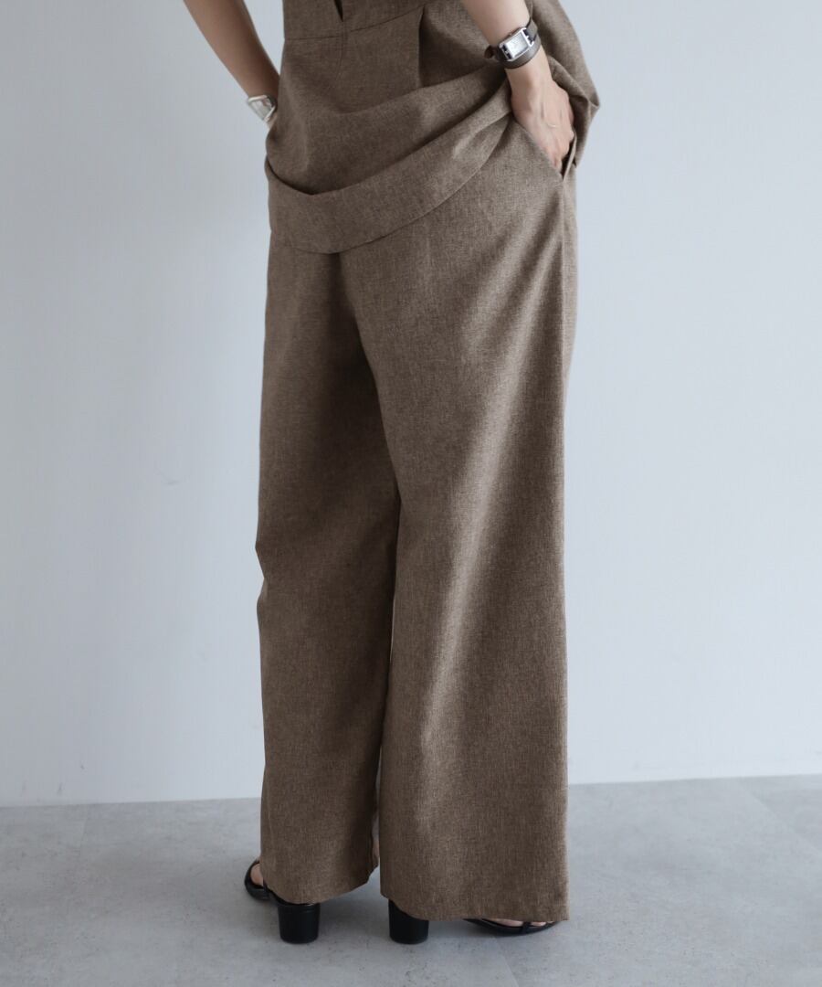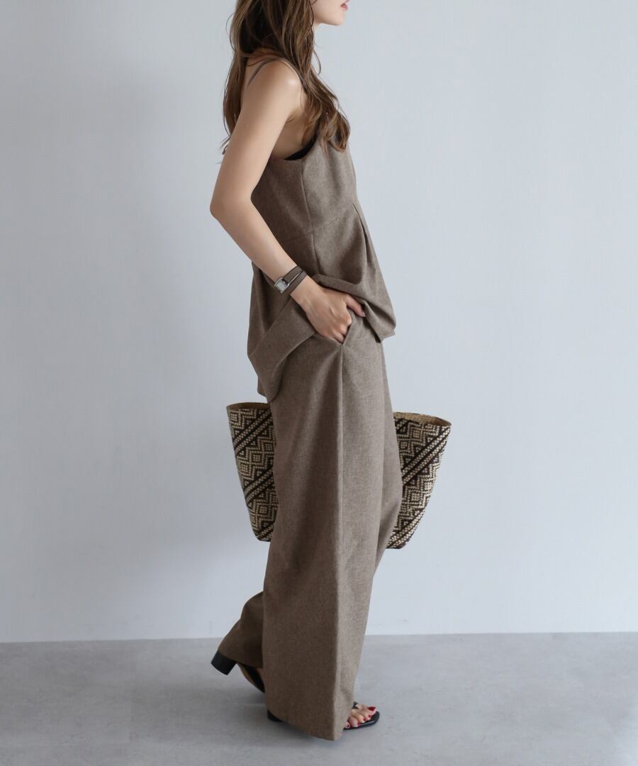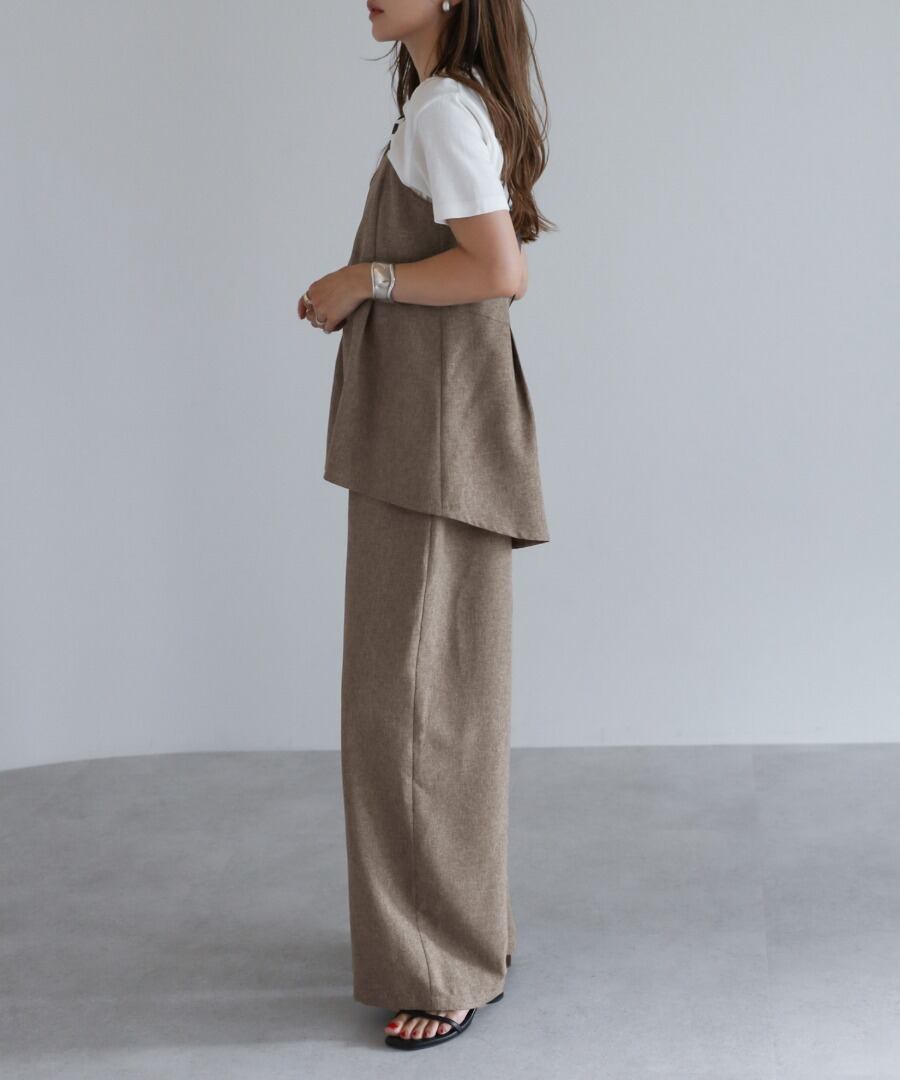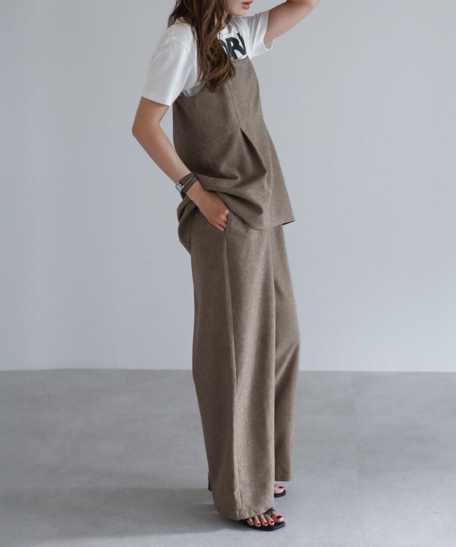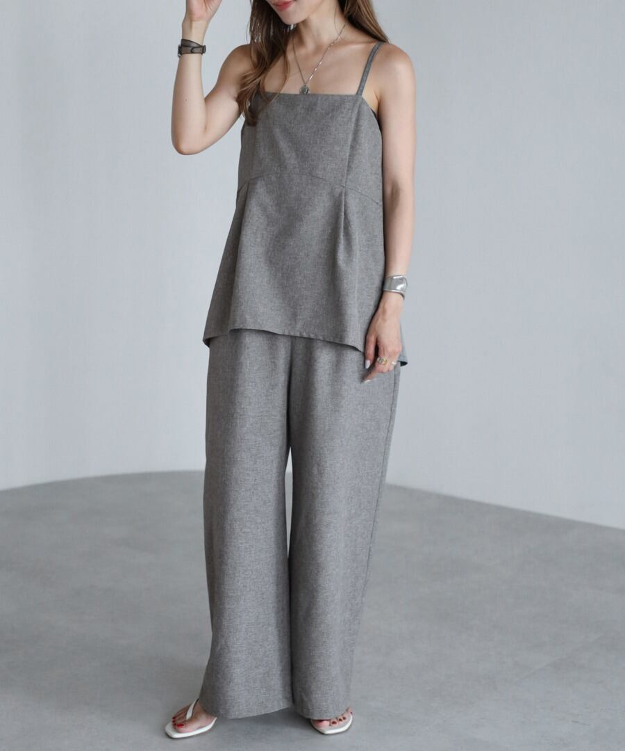 ペプラムキャミソール型の上身頃に、ストレートパンツのワイドシルエットになっています。