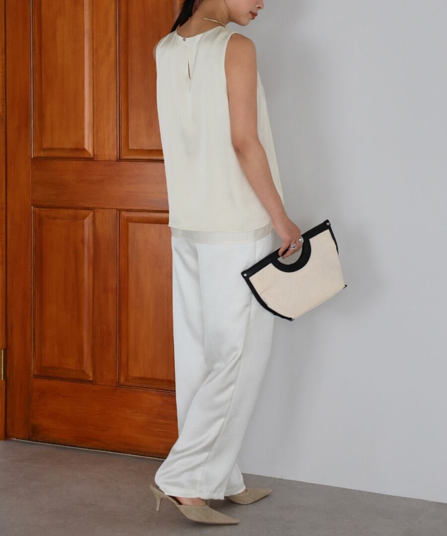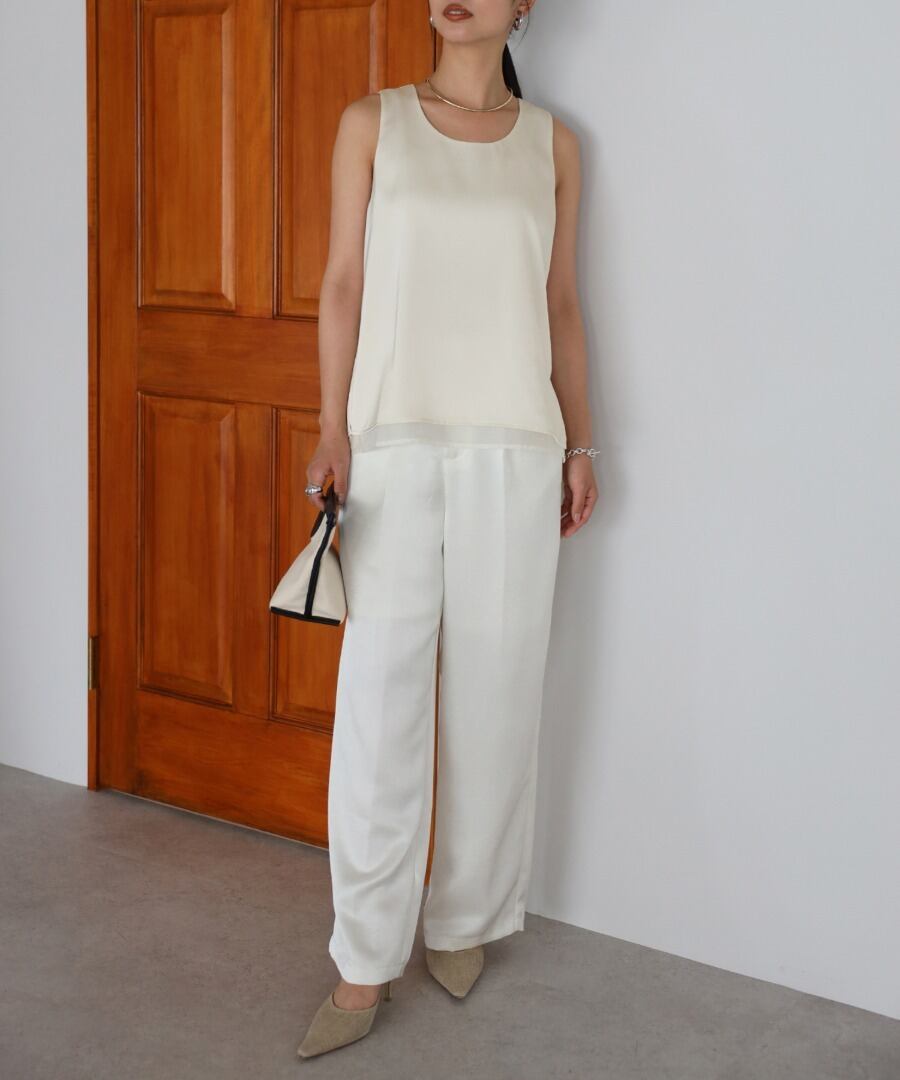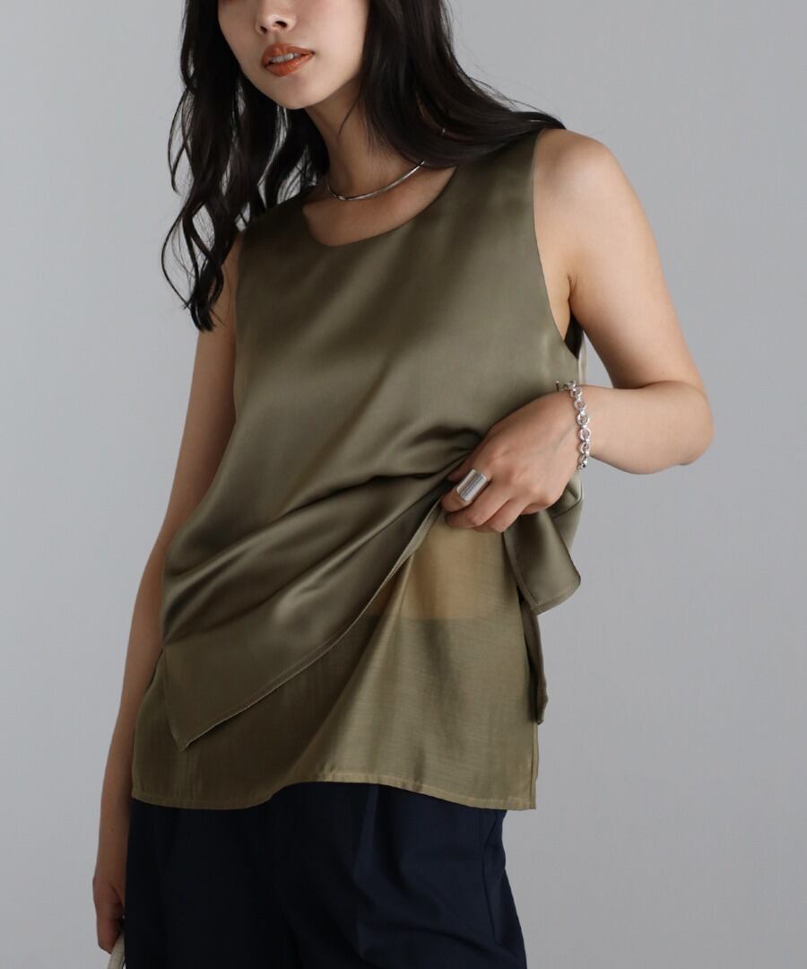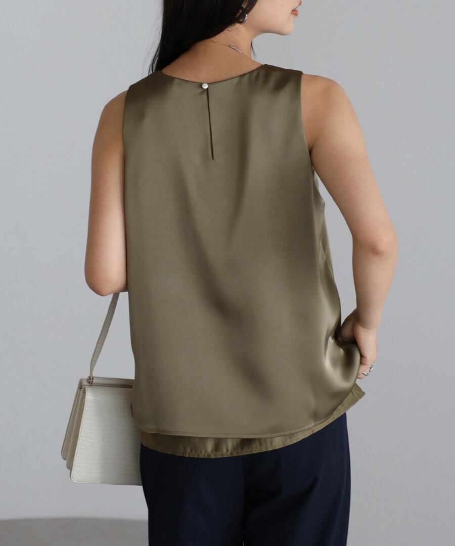 程よい光沢感のあるサテン素材が、上品で華やかな印象のノースリーブトップス。