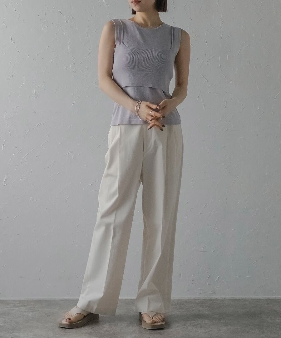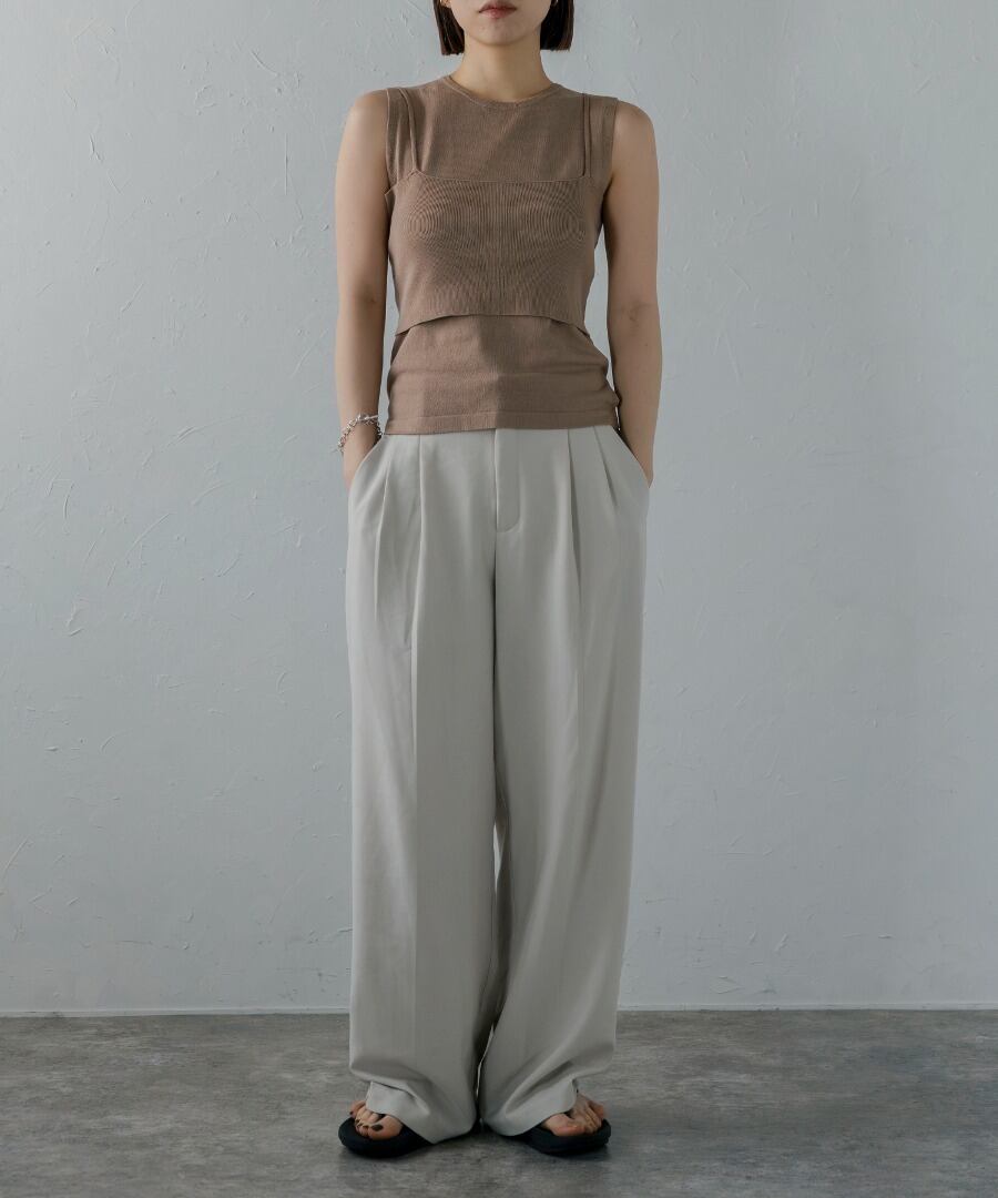 キャミとトップスを重ねて、トレンドライクなレイヤードスタイルが完成。