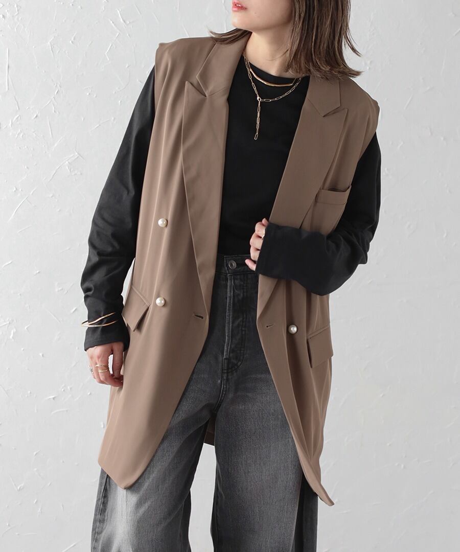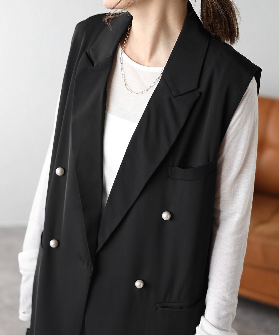 ダブルボタンデザインがクラシックな印象を与え、パールボタンが華やかさをプラスします。