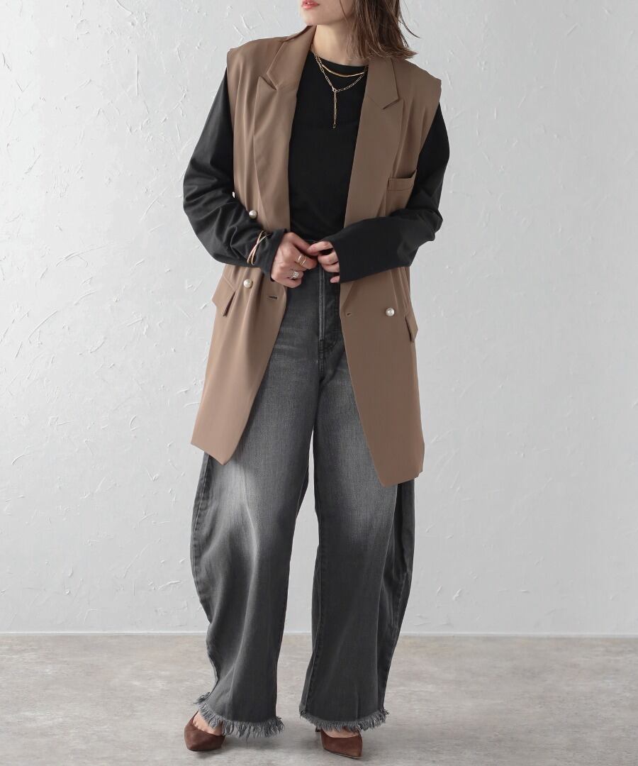 シーズン問わず使える万能アイテムで、大人のレイヤードスタイルを楽しめます。