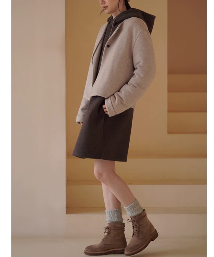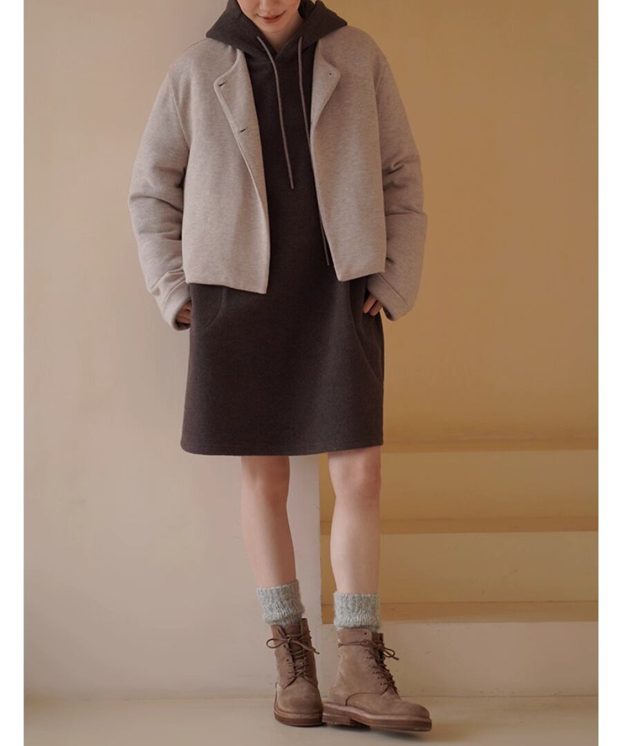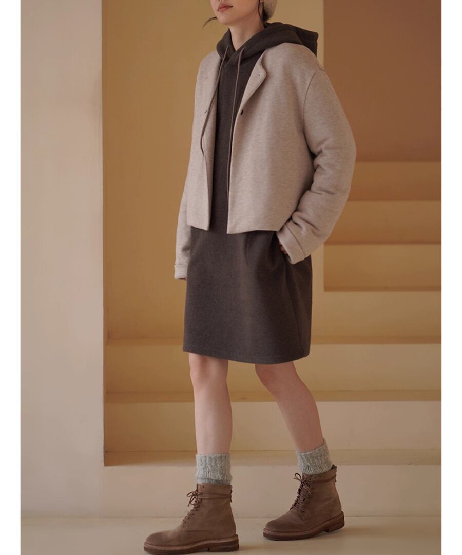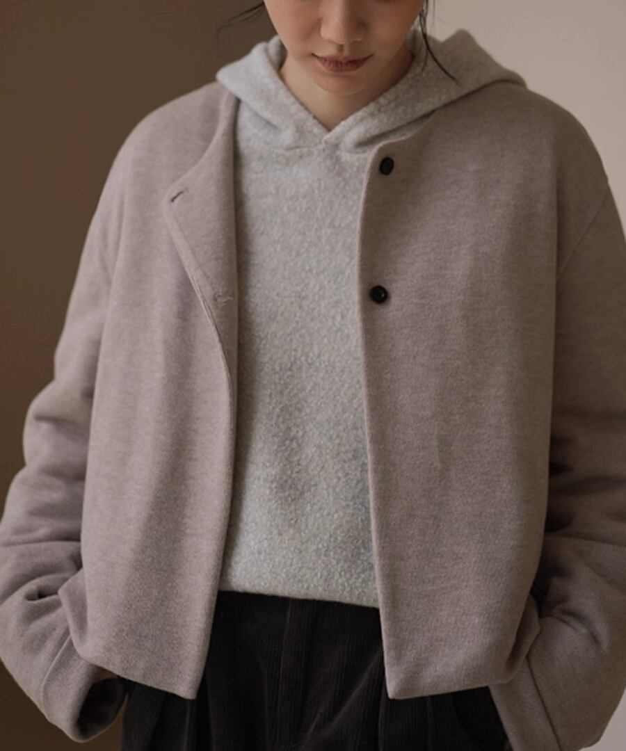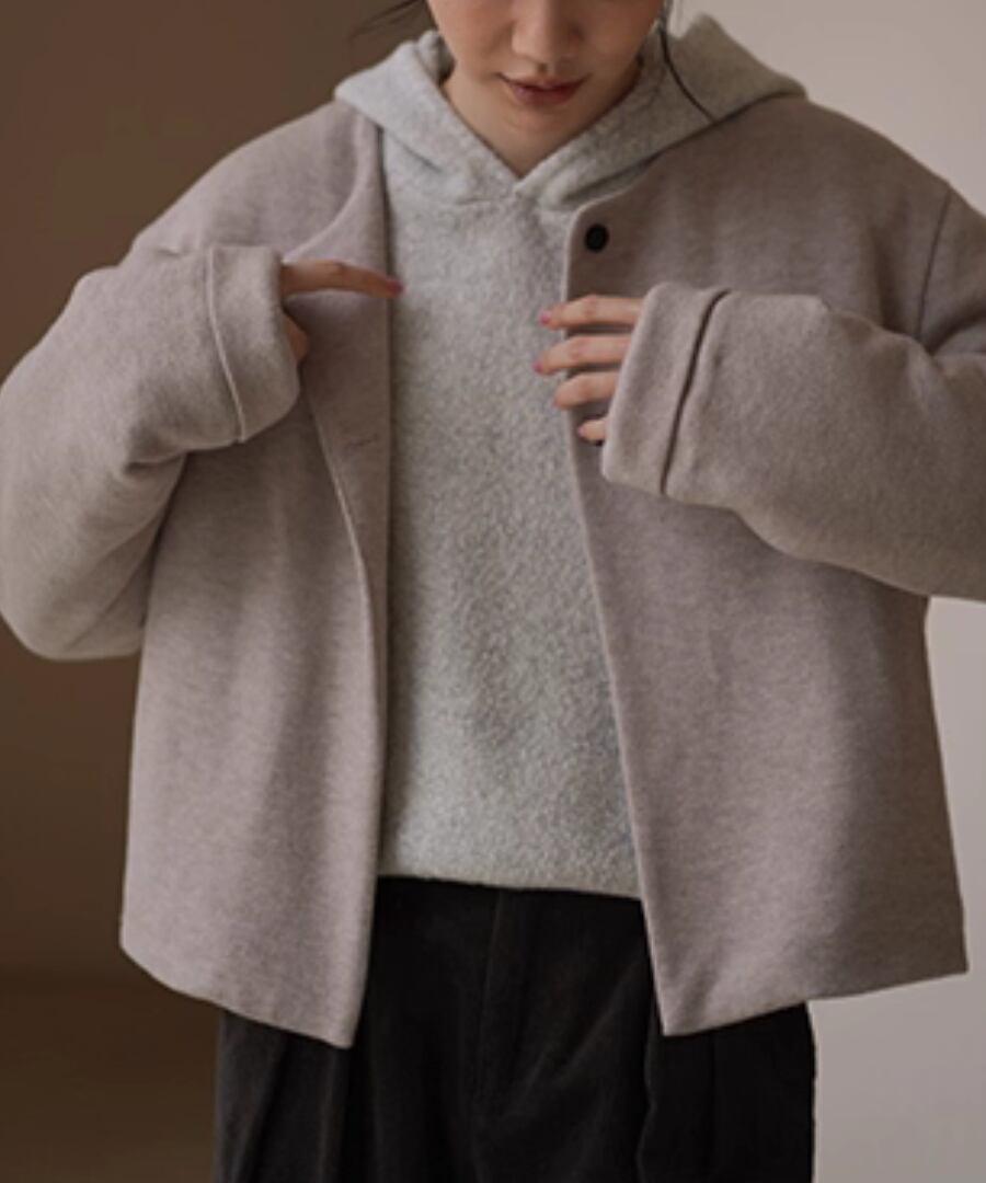 ショート丈のノーカラーコートはすっきりときれいめな印象。