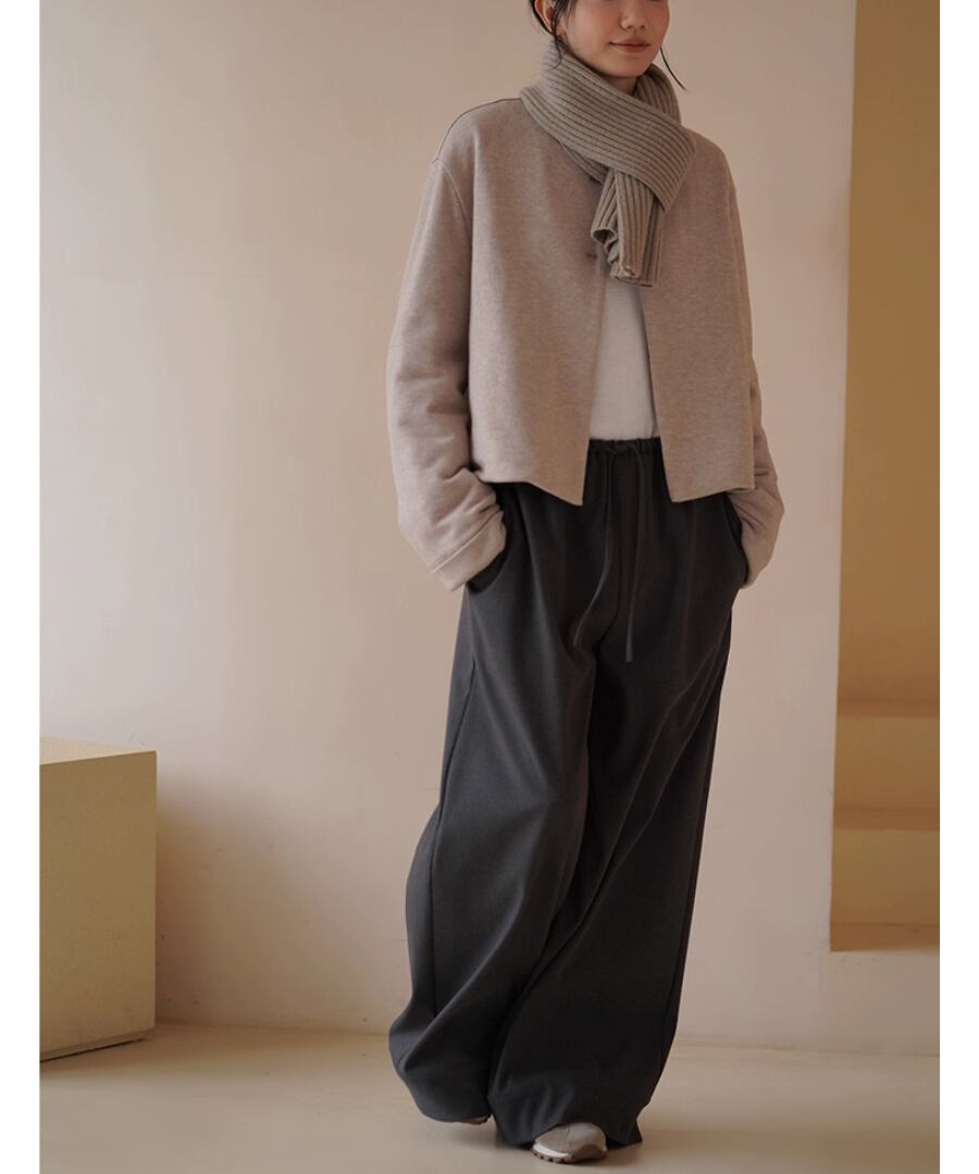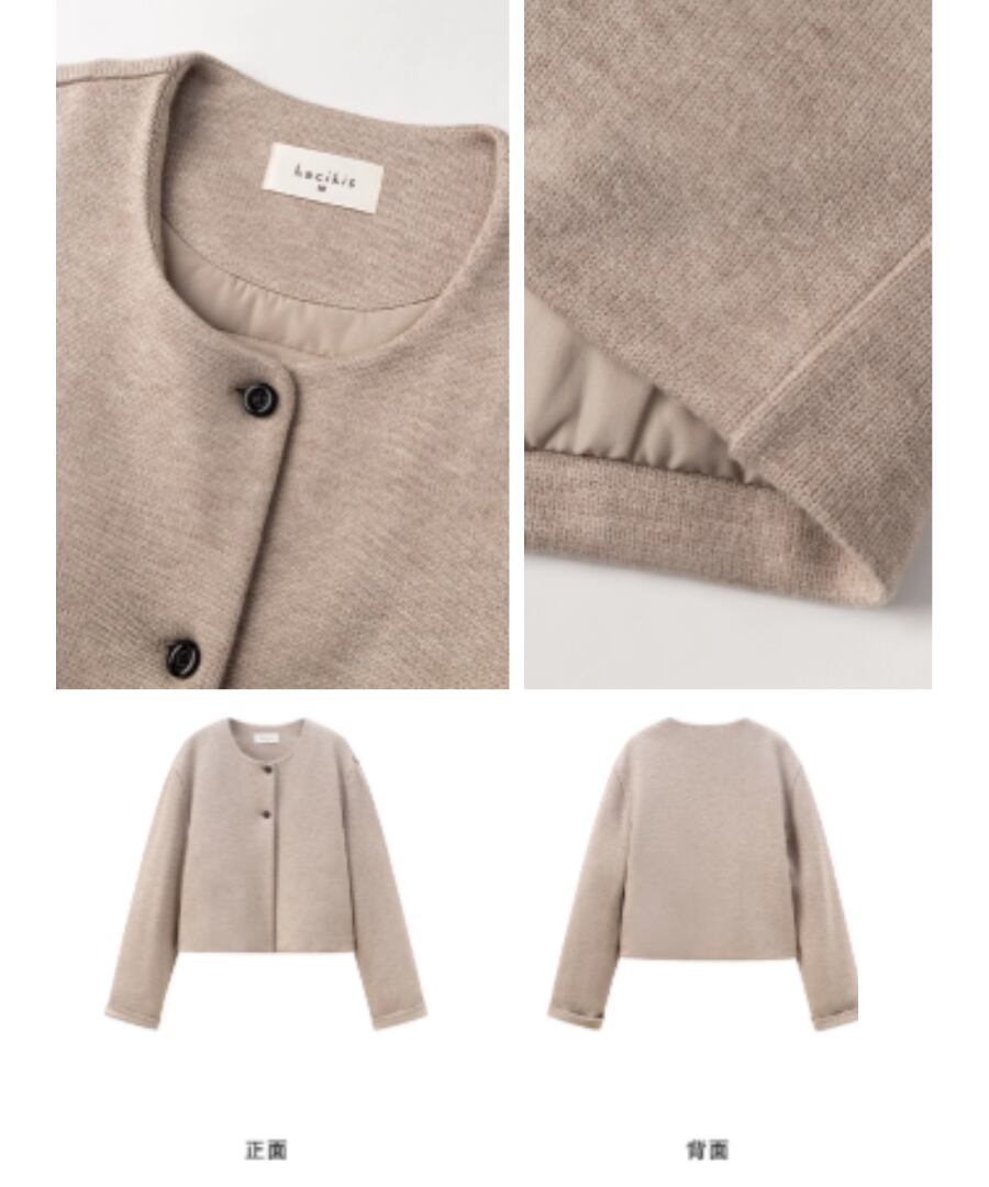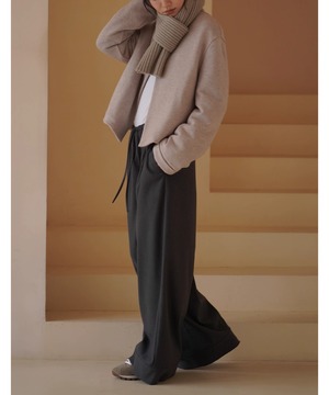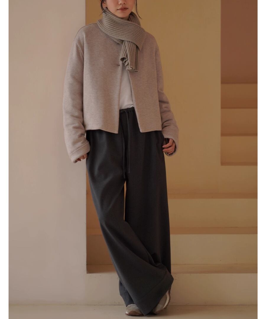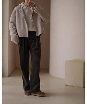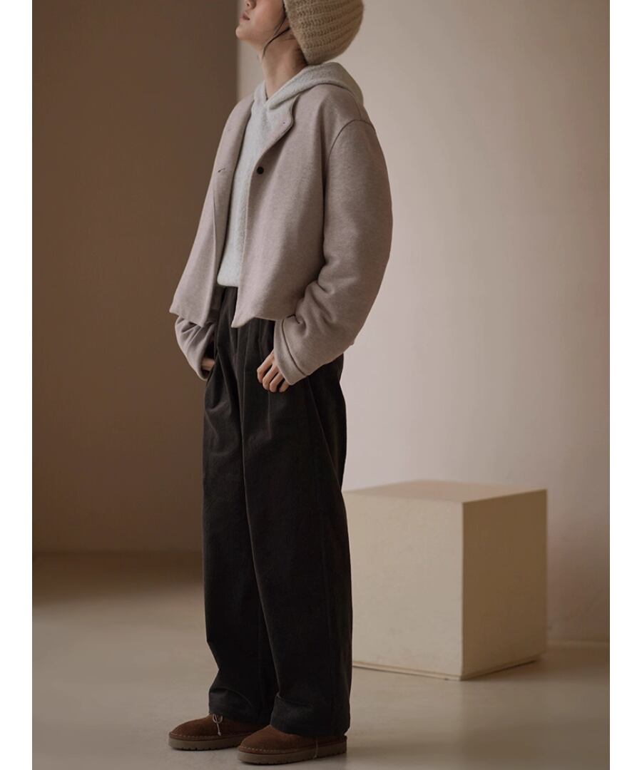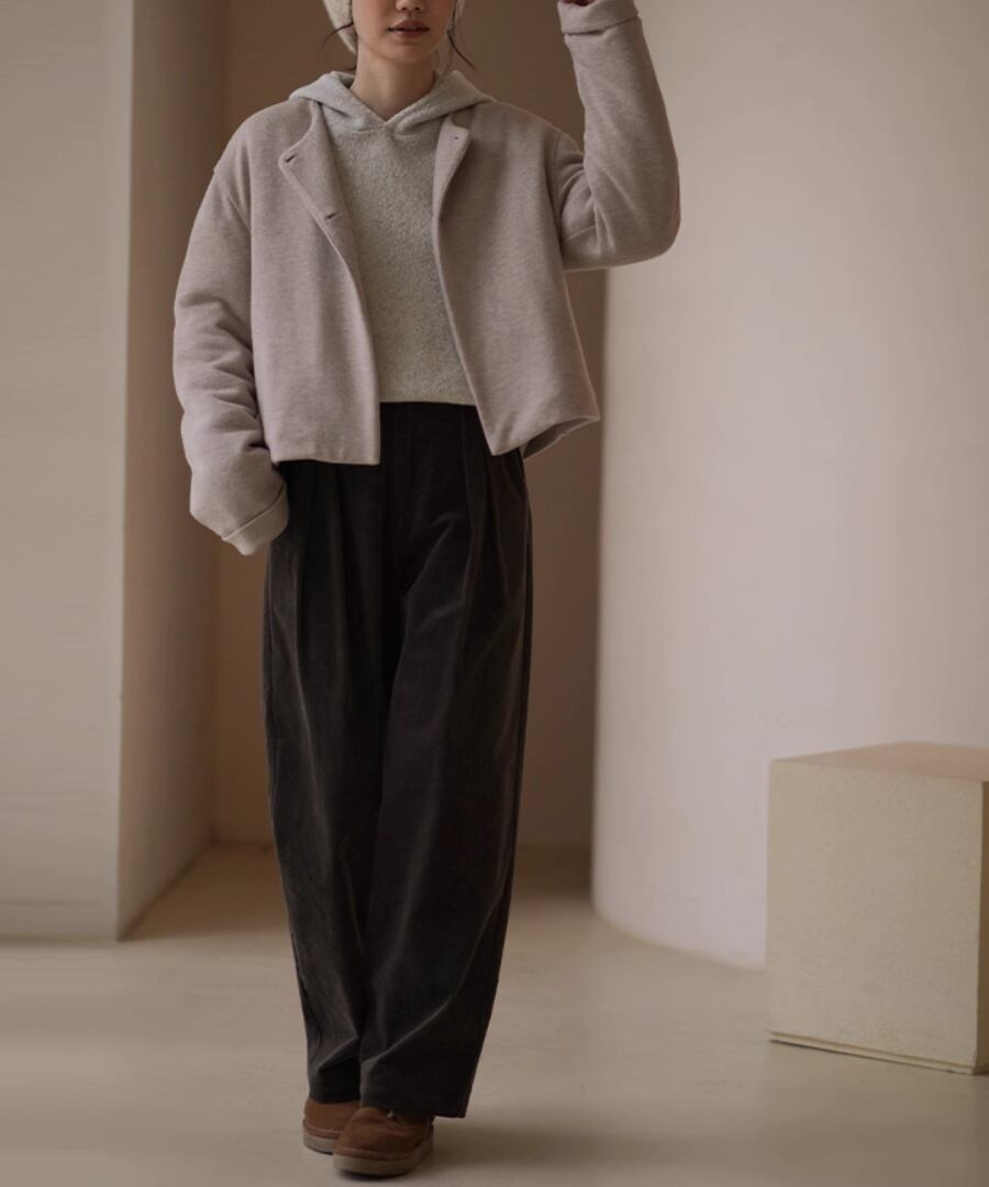 ショート丈のノーカラーコートはすっきりときれいめな印象。
