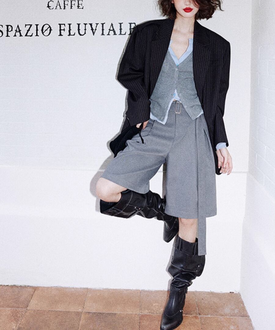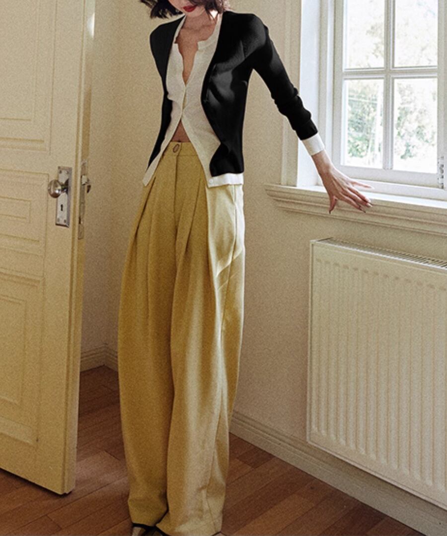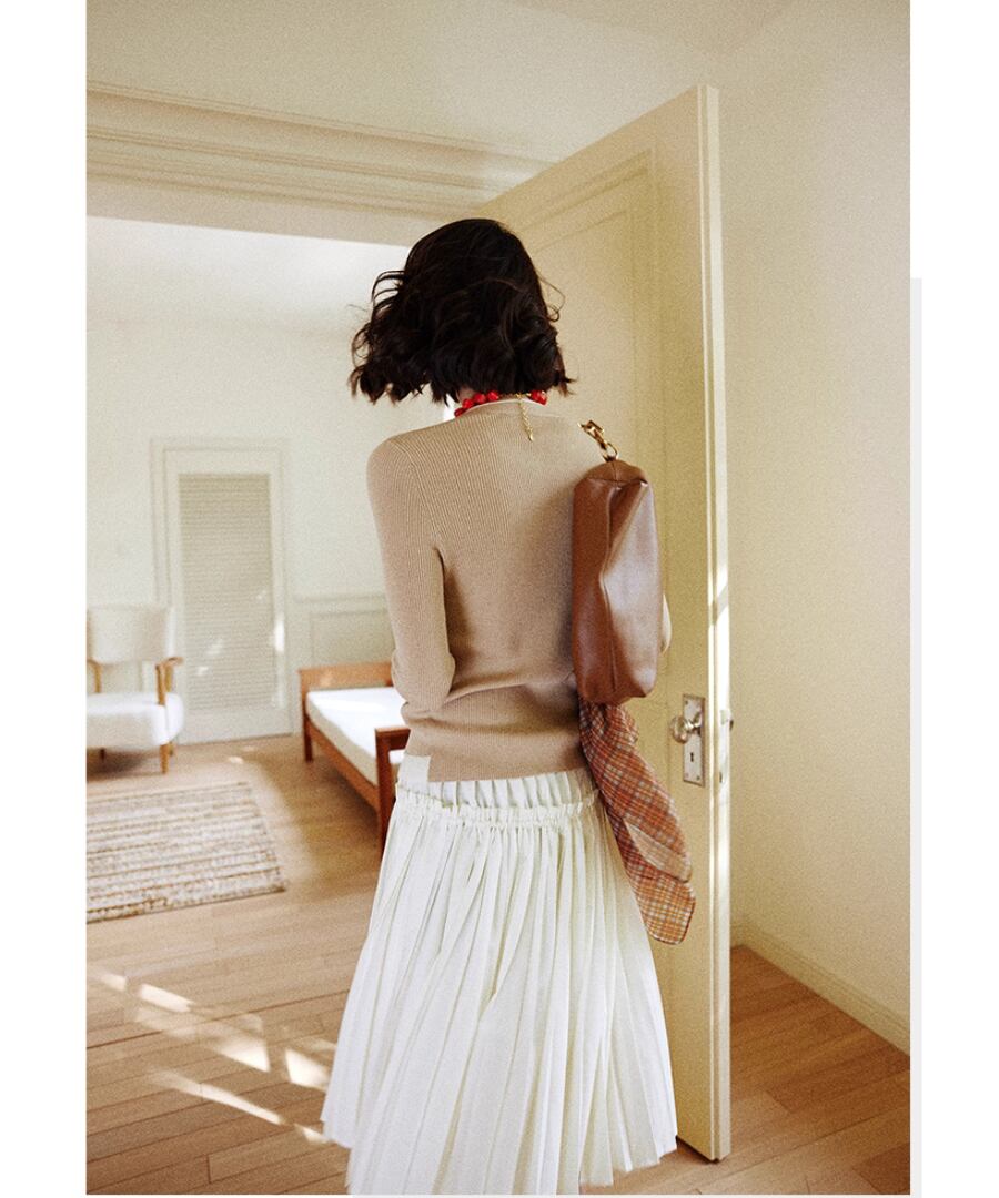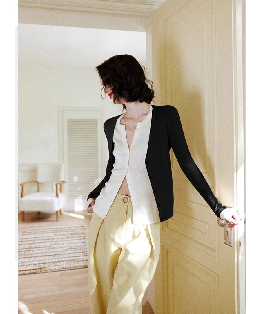 レイヤード風のデザインと、襟元や袖口の差し色がコーディネートのアクセントに。