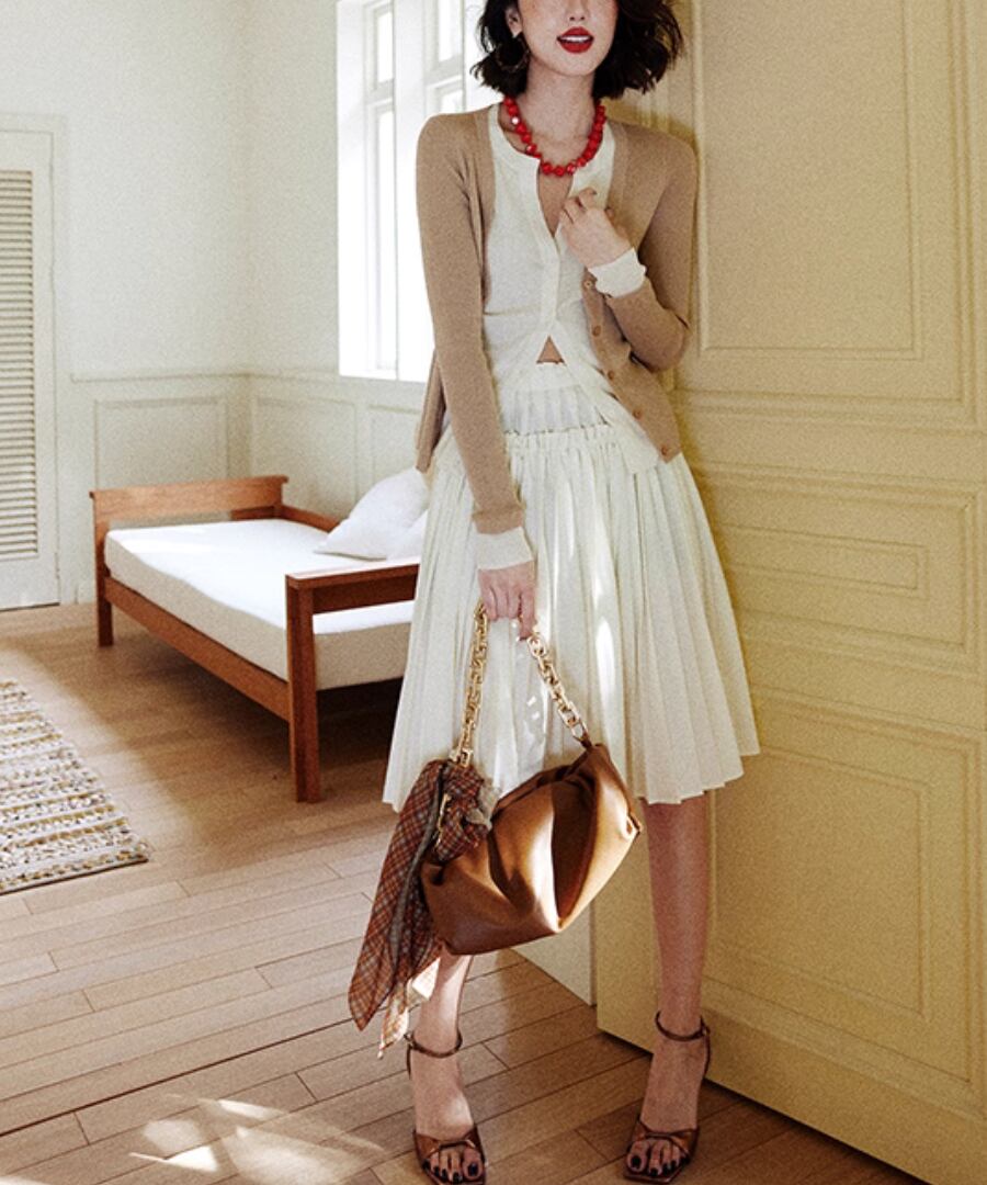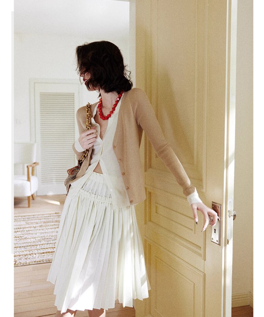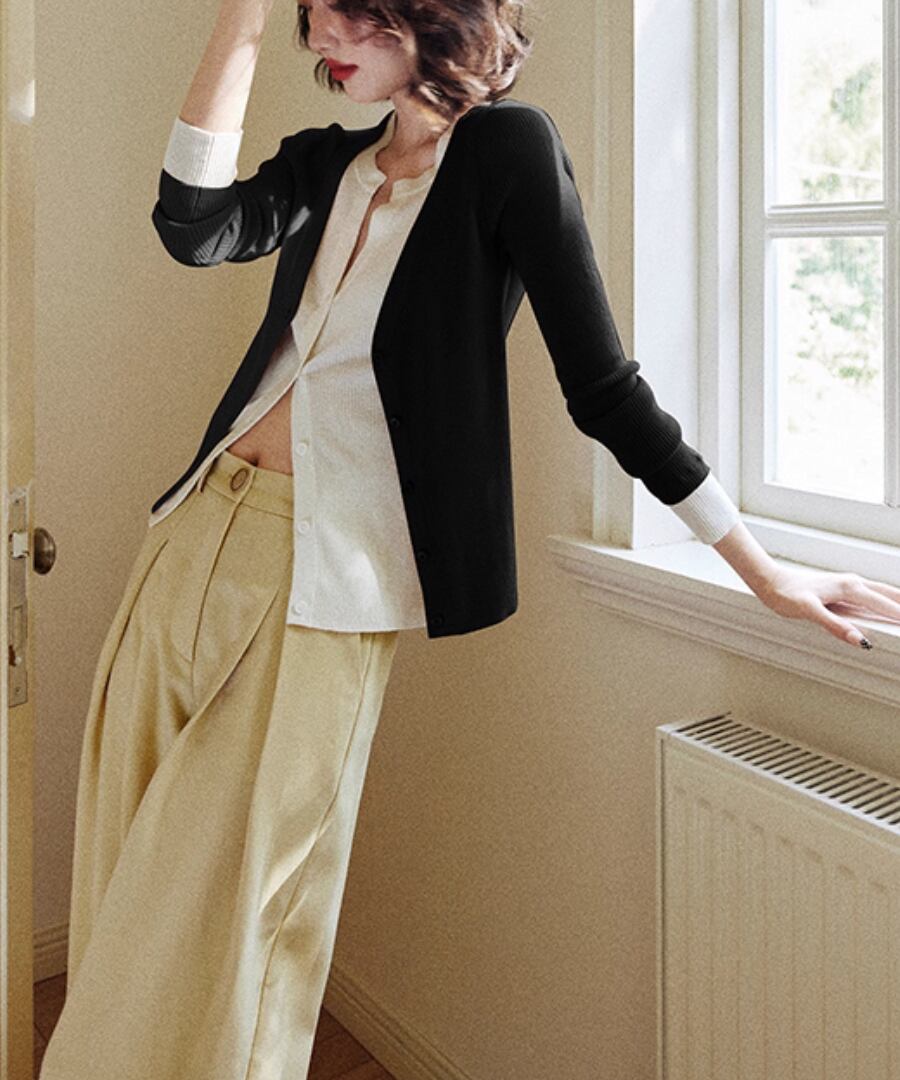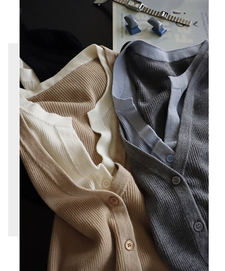 上品な雰囲気を演出するVネック長袖カーディガン。