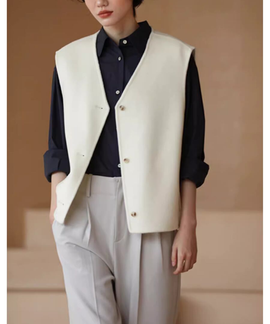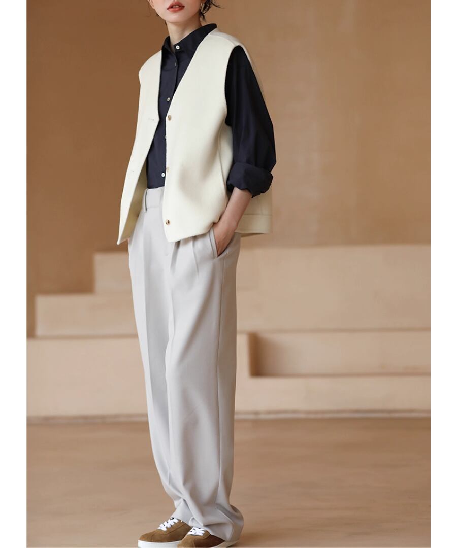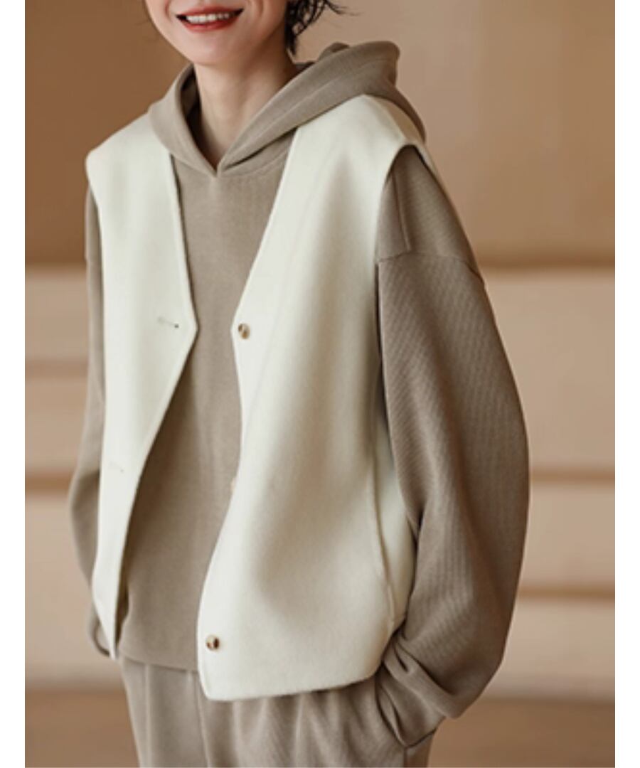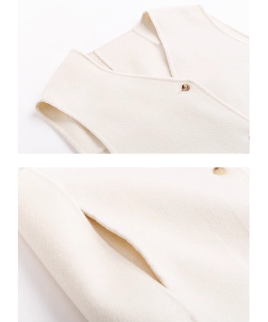 シンプルかつエレガントなデザインのウールベストは、上品なホワイトカラーが特徴。