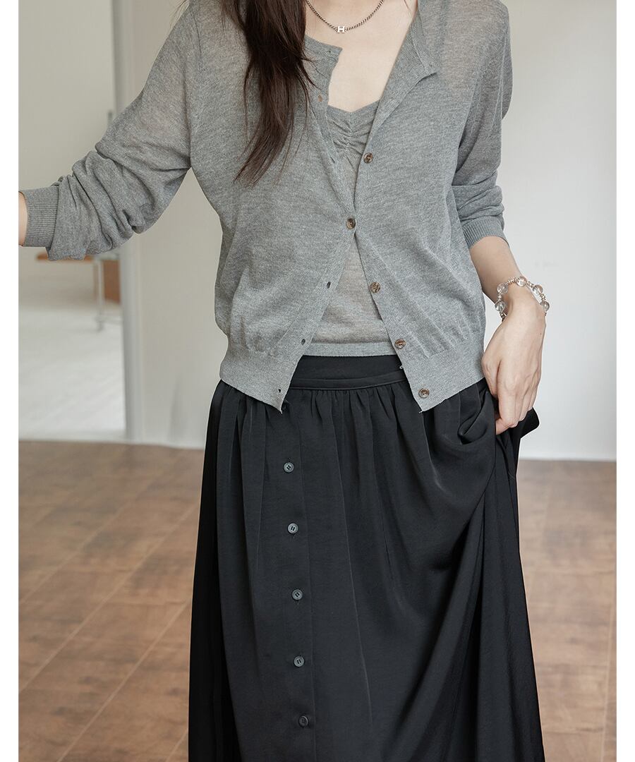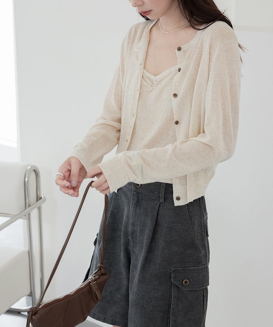 軽やかな素材感が魅力のカーディガン&タンクトップのツーピースセット。