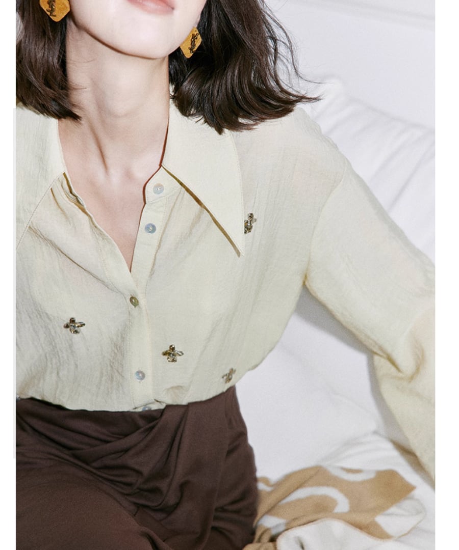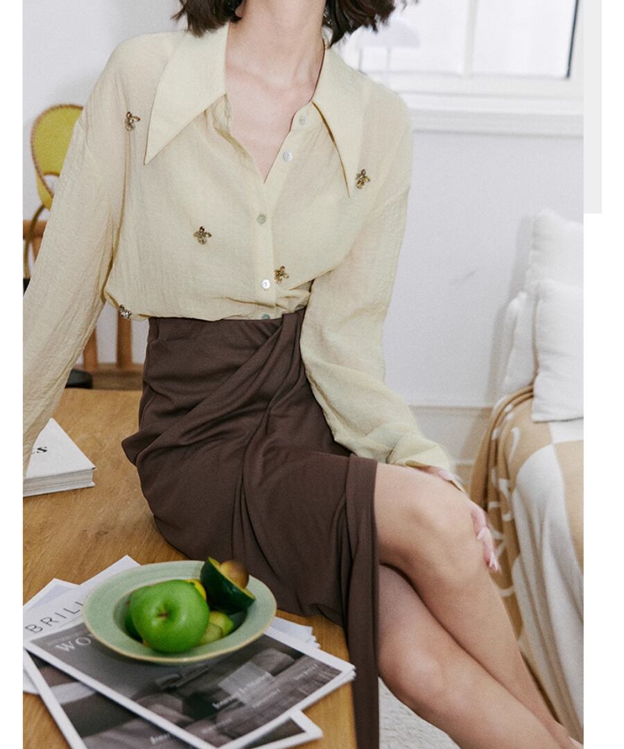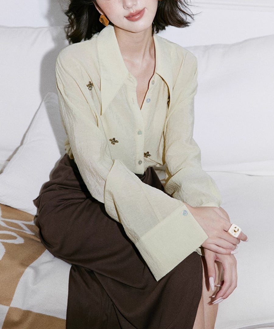 ソフトイエローが目を引くブラウスは、取り外し可能なアクセサリーが魅力です。