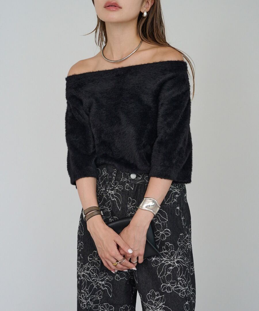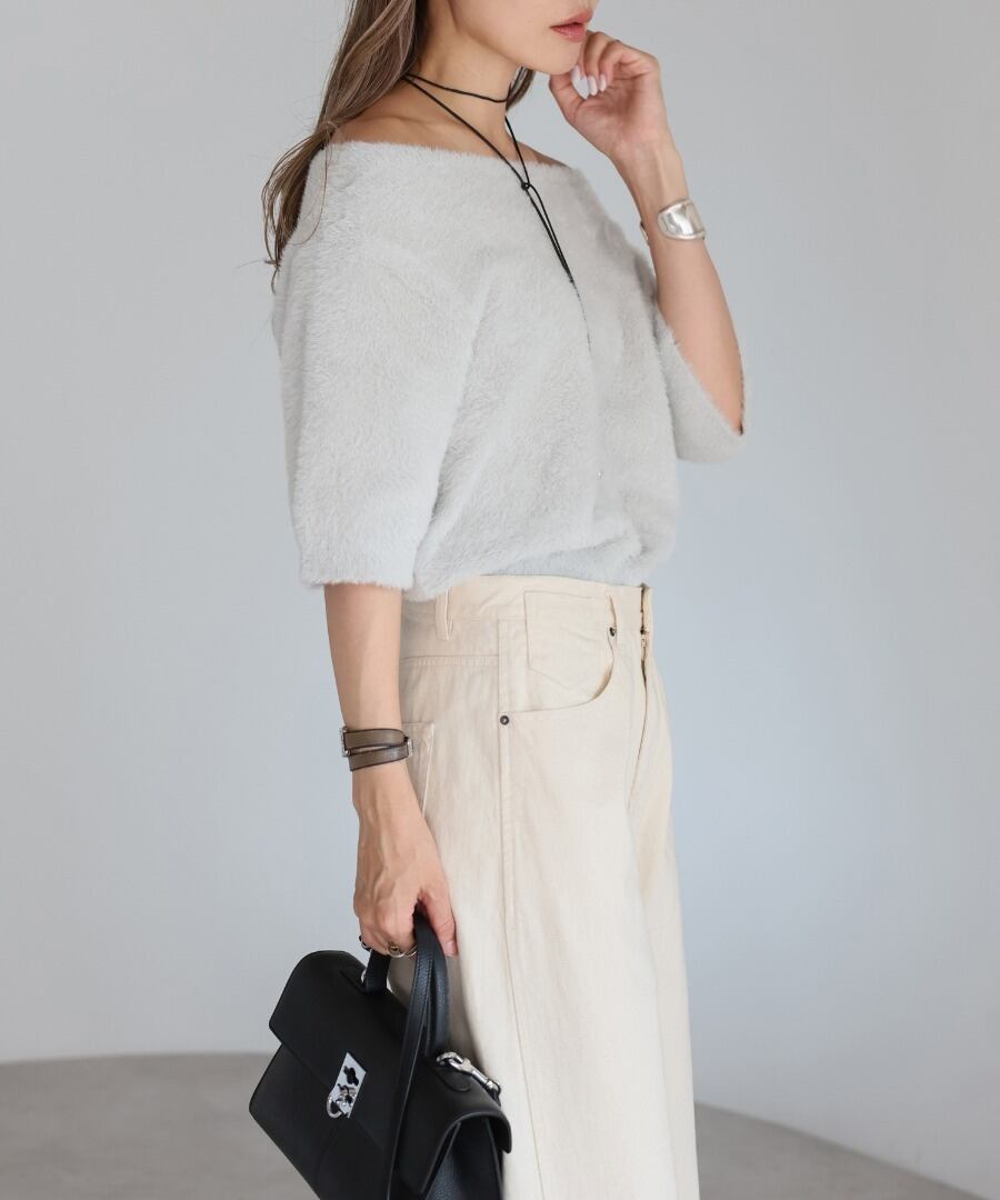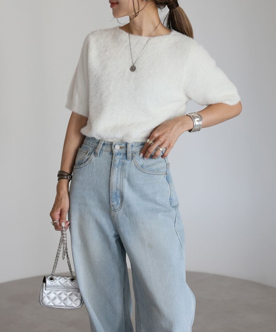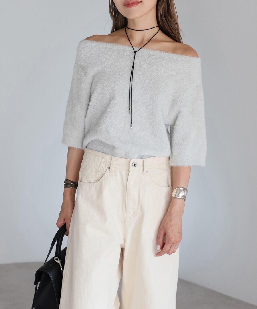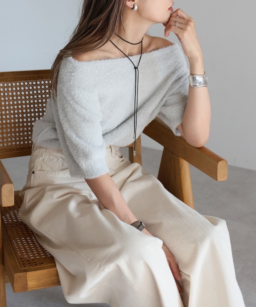 毛足のある素材感が、トレンドライクなフェザーニットの魅力を際立てます。