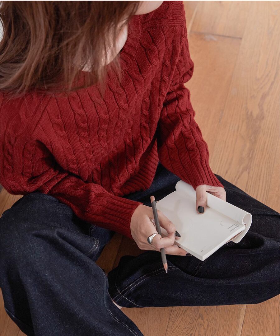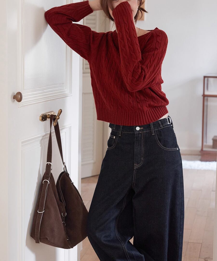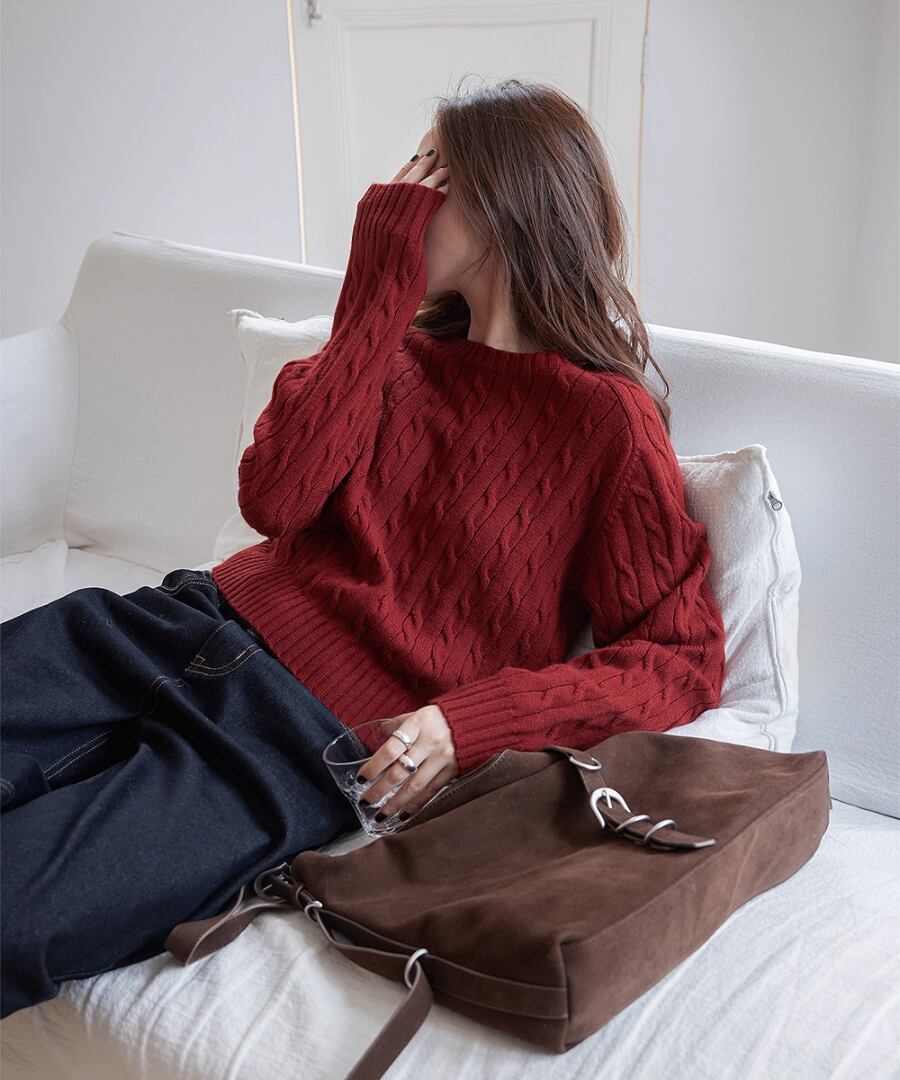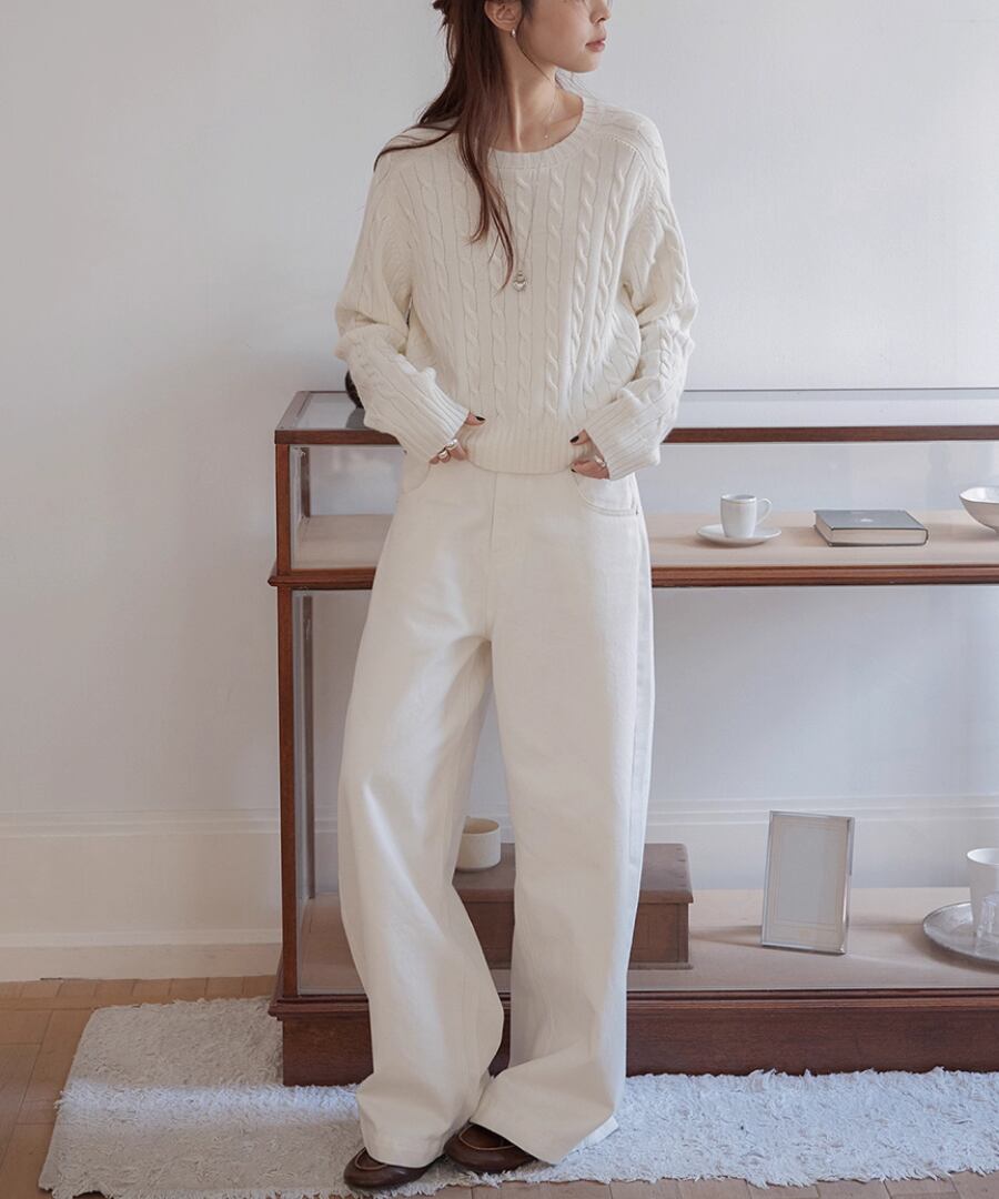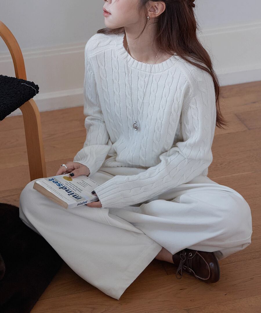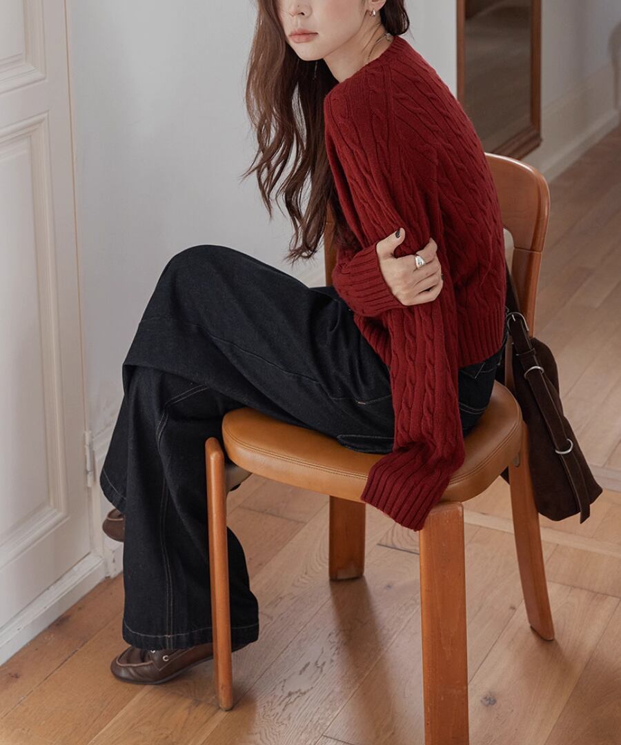 立体的なケーブル編みが、シンプルなコーディネートに奥行きをもたらし、コーディネートをぐっと引き締めます。