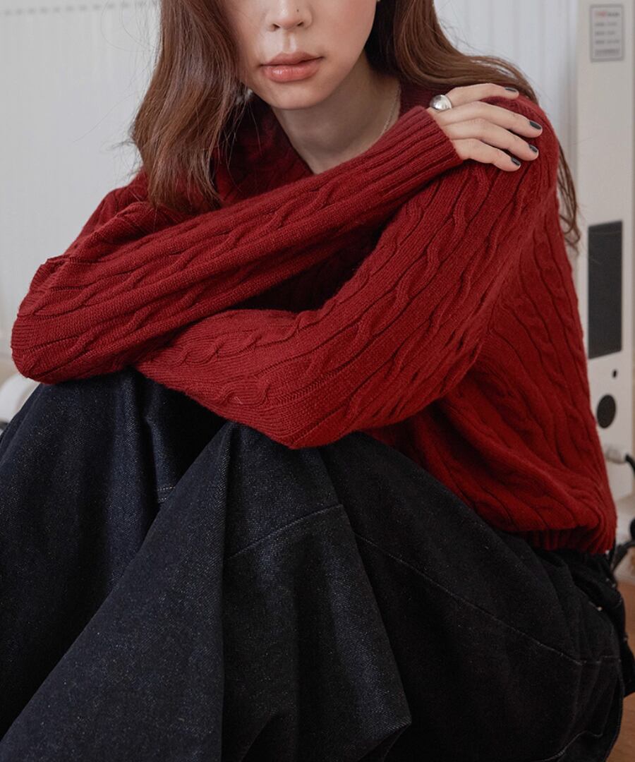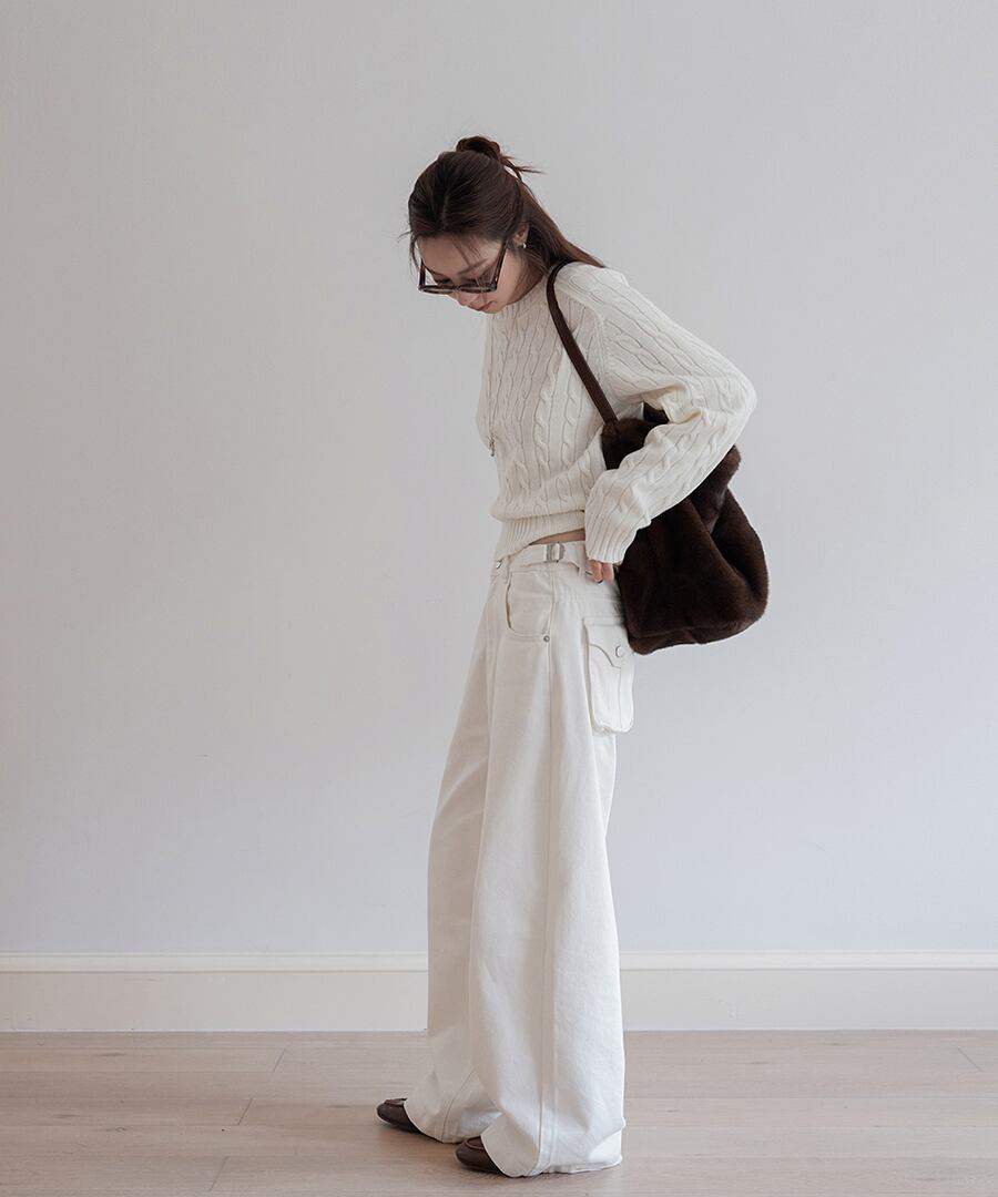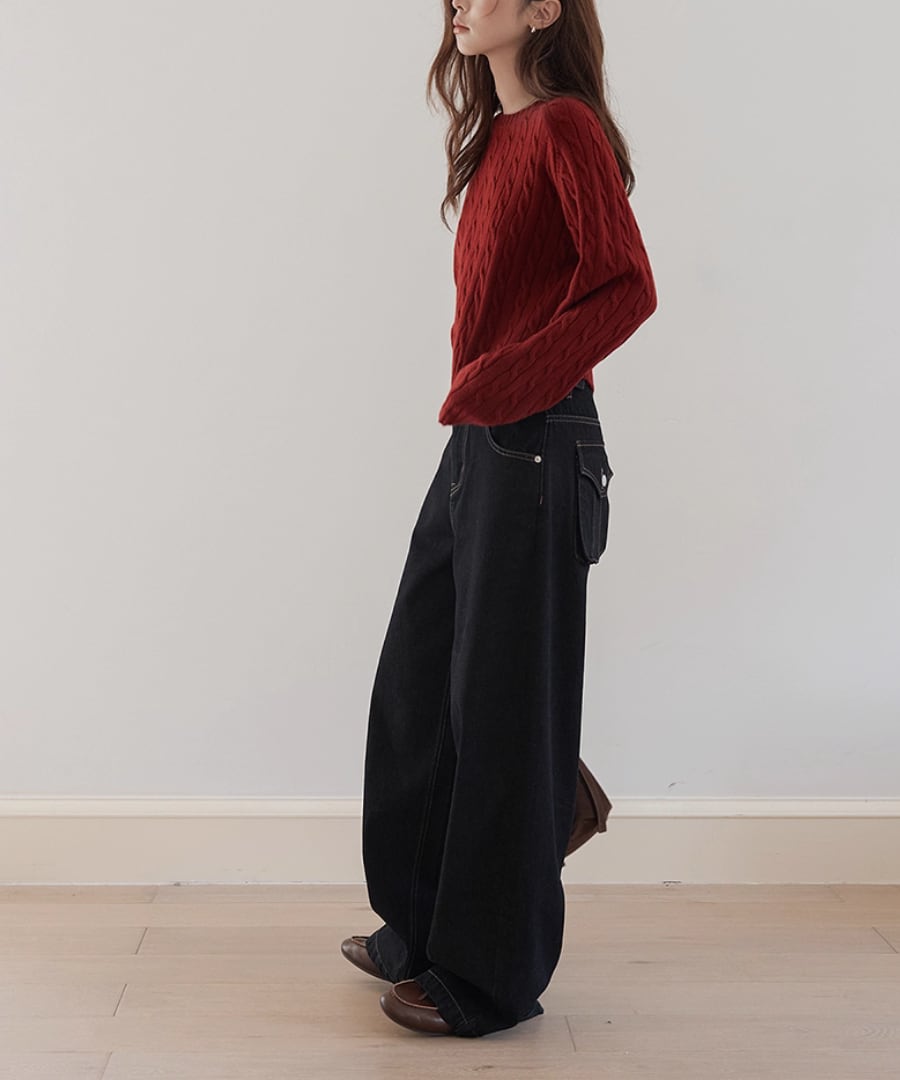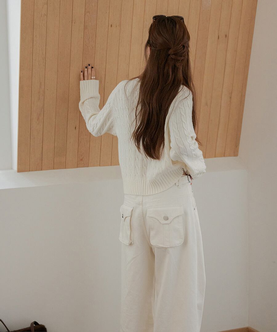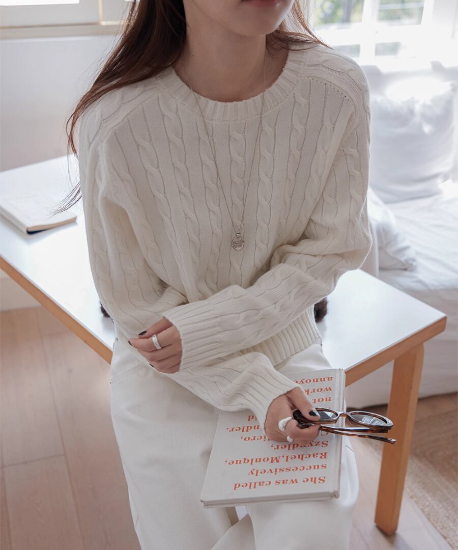 立体的なケーブル編みが、シンプルなコーディネートに奥行きをもたらし、コーディネートをぐっと引き締めます。