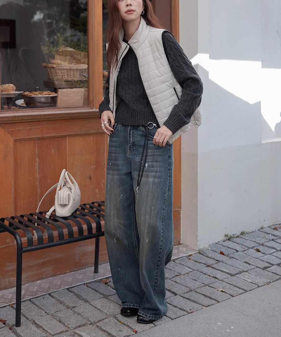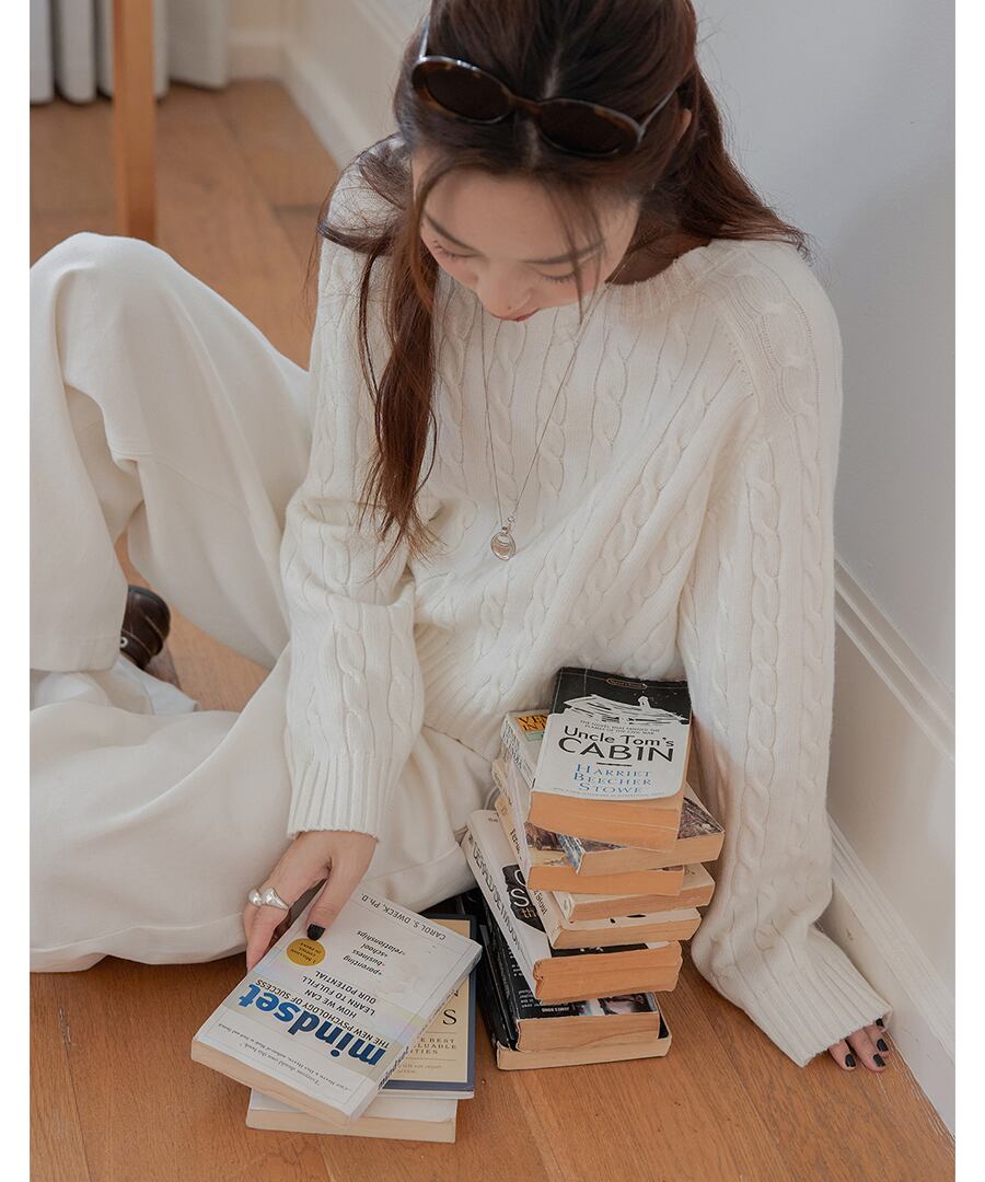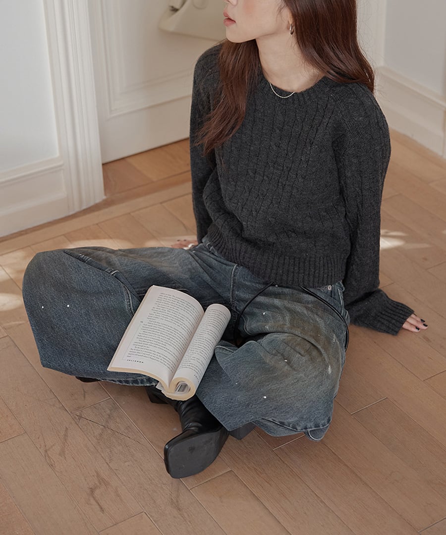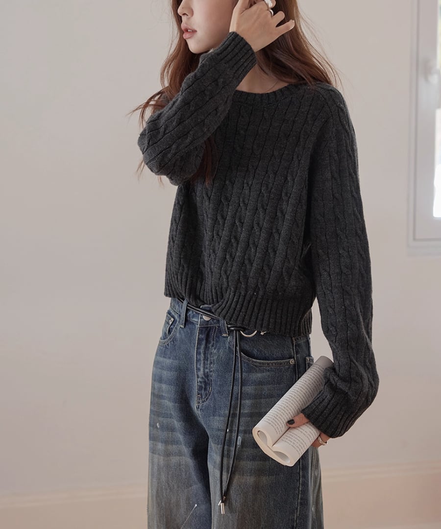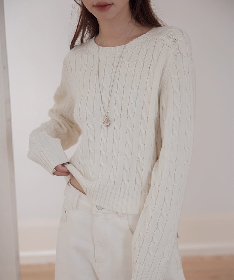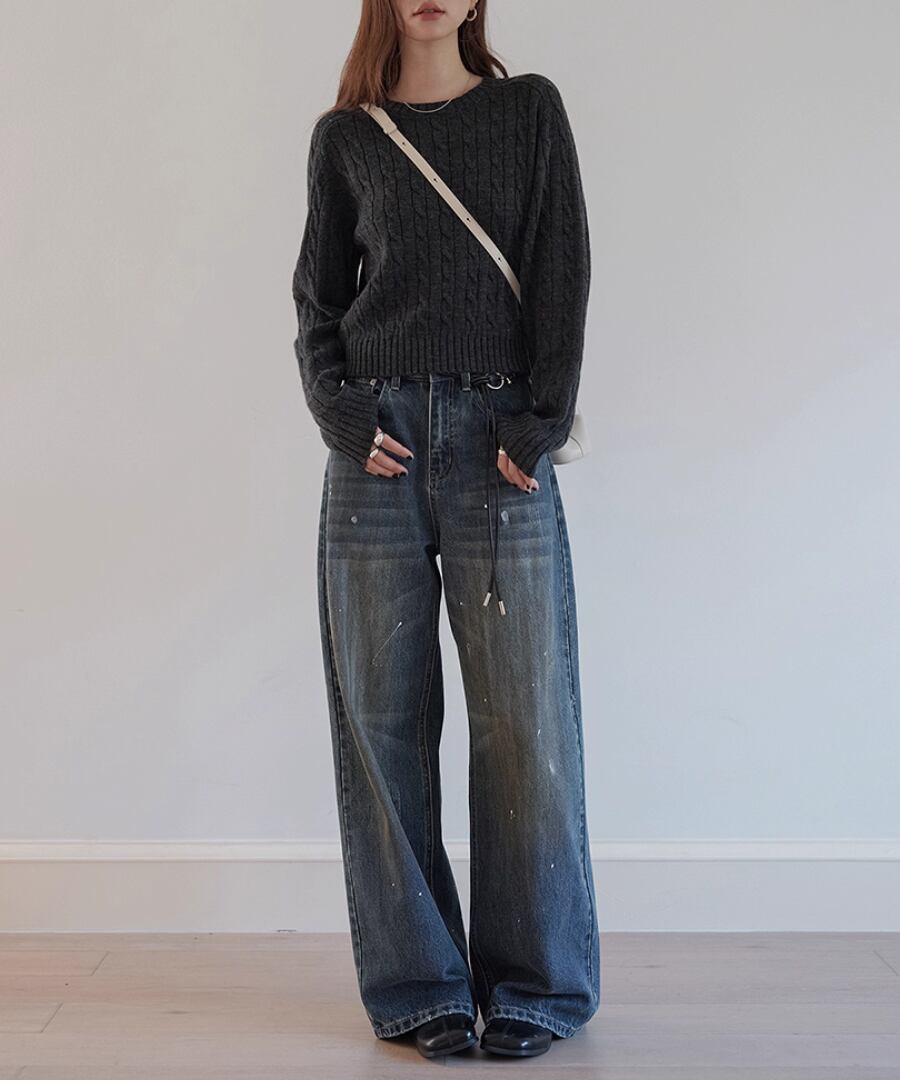 立体的なケーブル編みが、シンプルなコーディネートに奥行きをもたらし、コーディネートをぐっと引き締めます。
