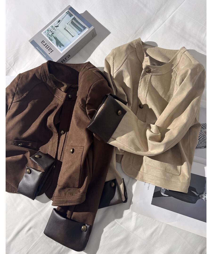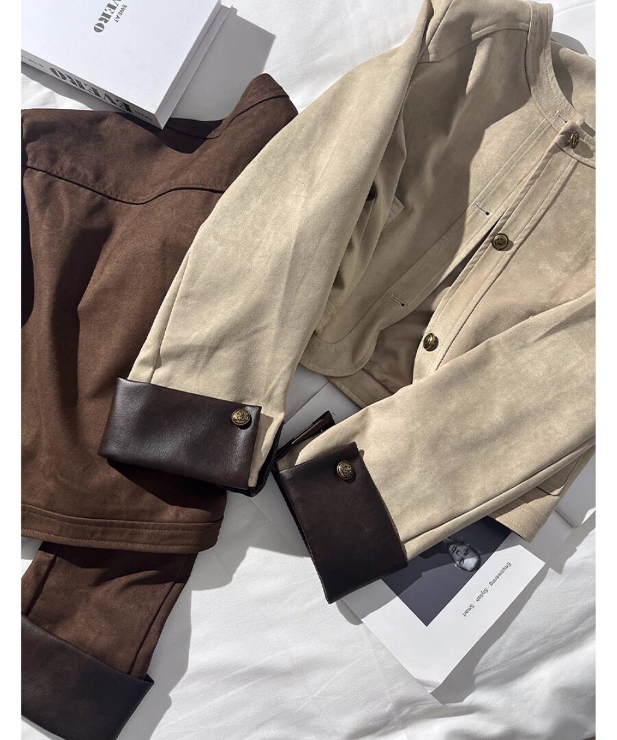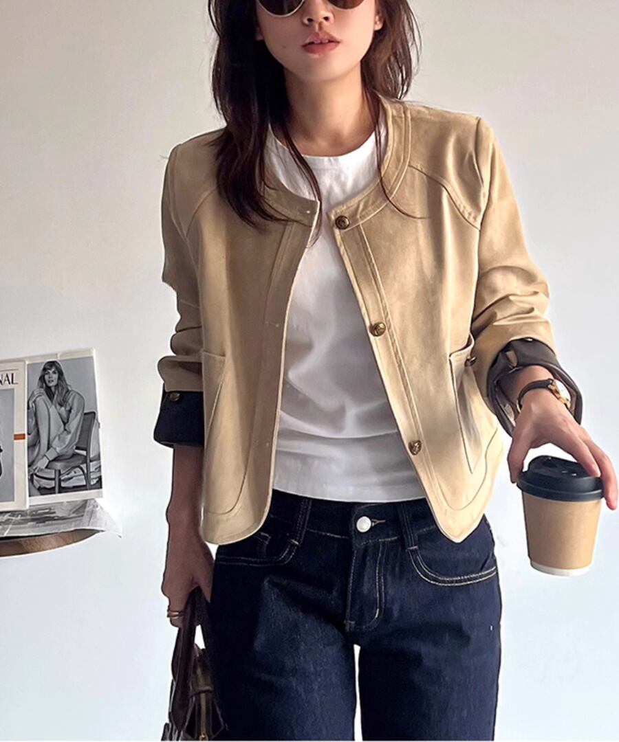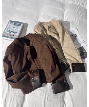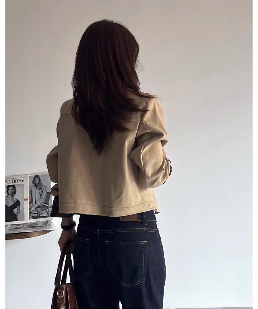 柔らかな合成スエード素材を使用した、スタイリッシュなショート丈ジャケット。