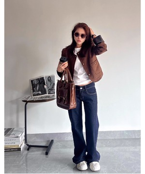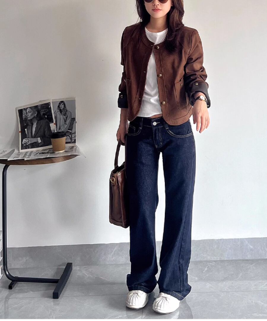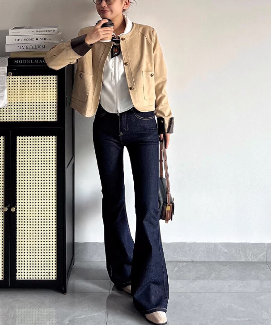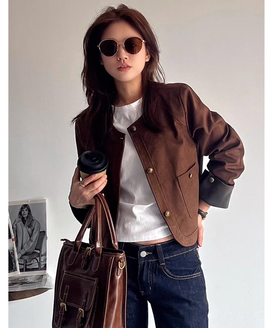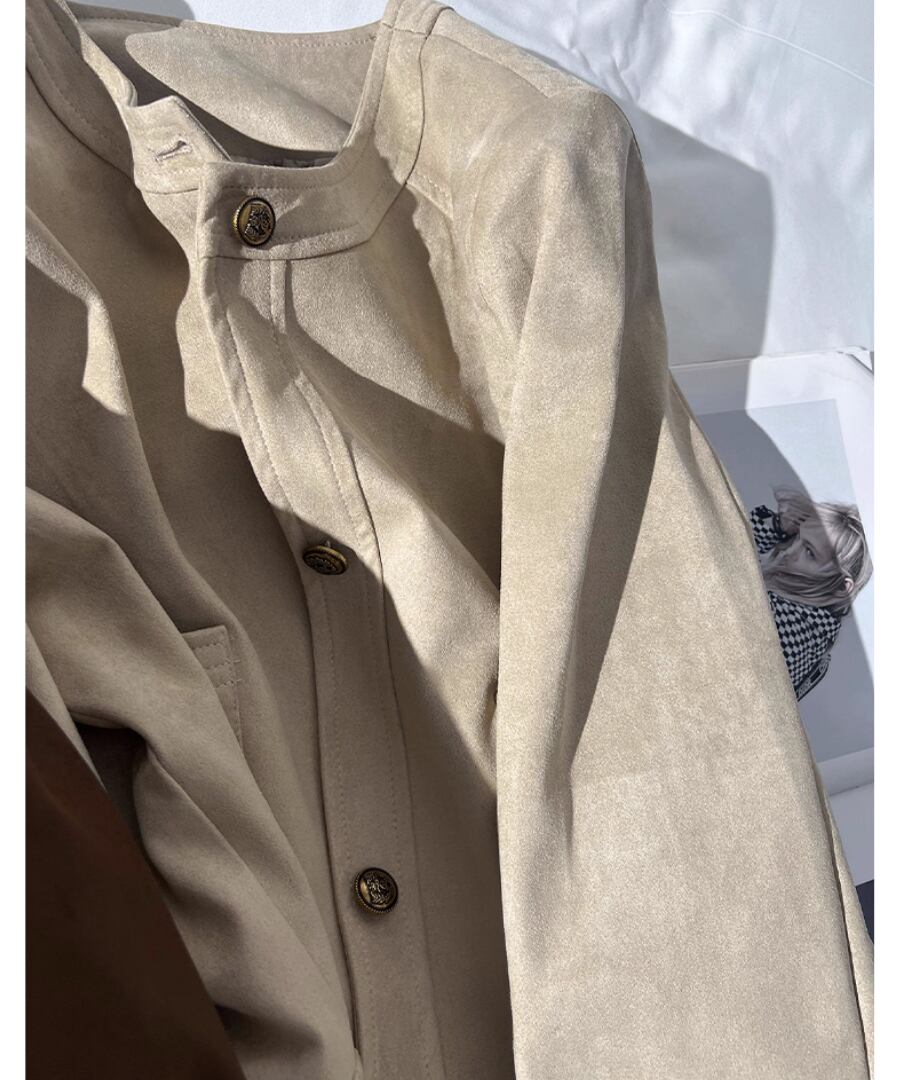 柔らかな合成スエード素材を使用した、スタイリッシュなショート丈ジャケット。