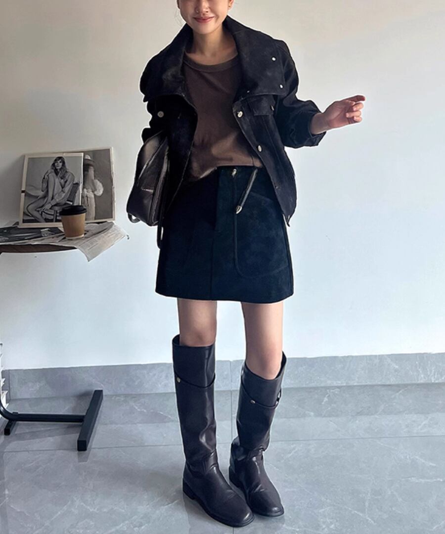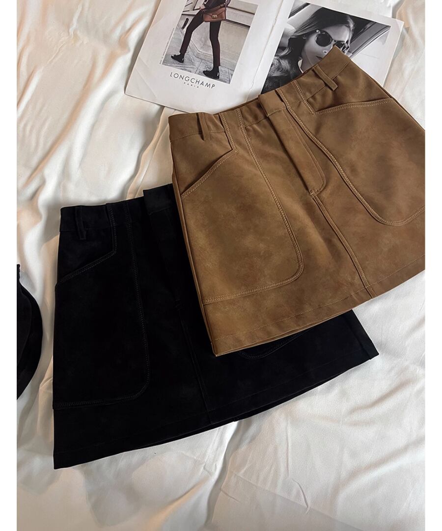 スタイリッシュな印象を与える、合成スエードのミニスカート。