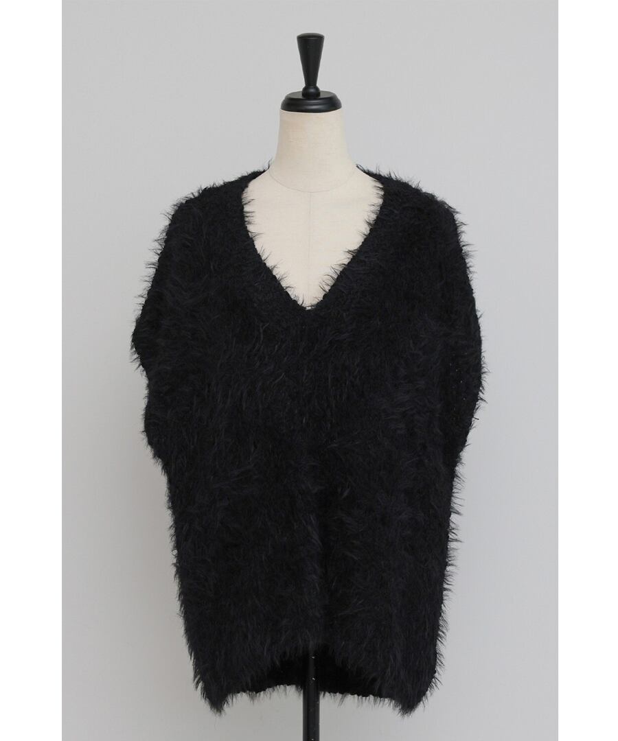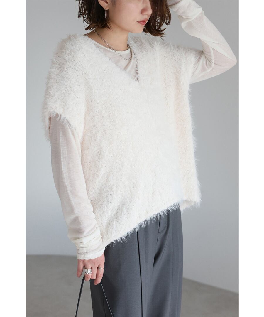 毛足の長いシャギーヤーンを使用した、存在感のあるニットベスト。
