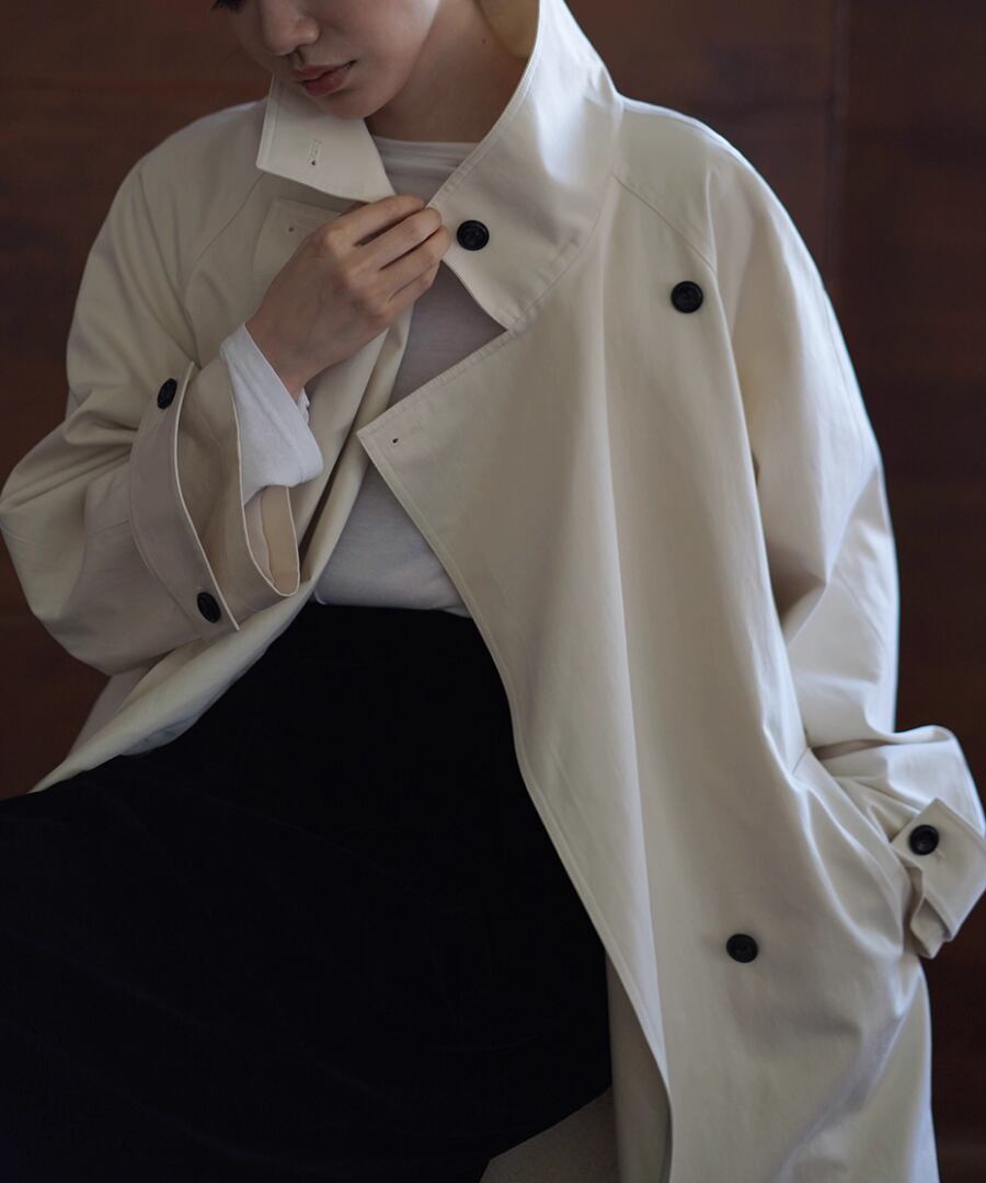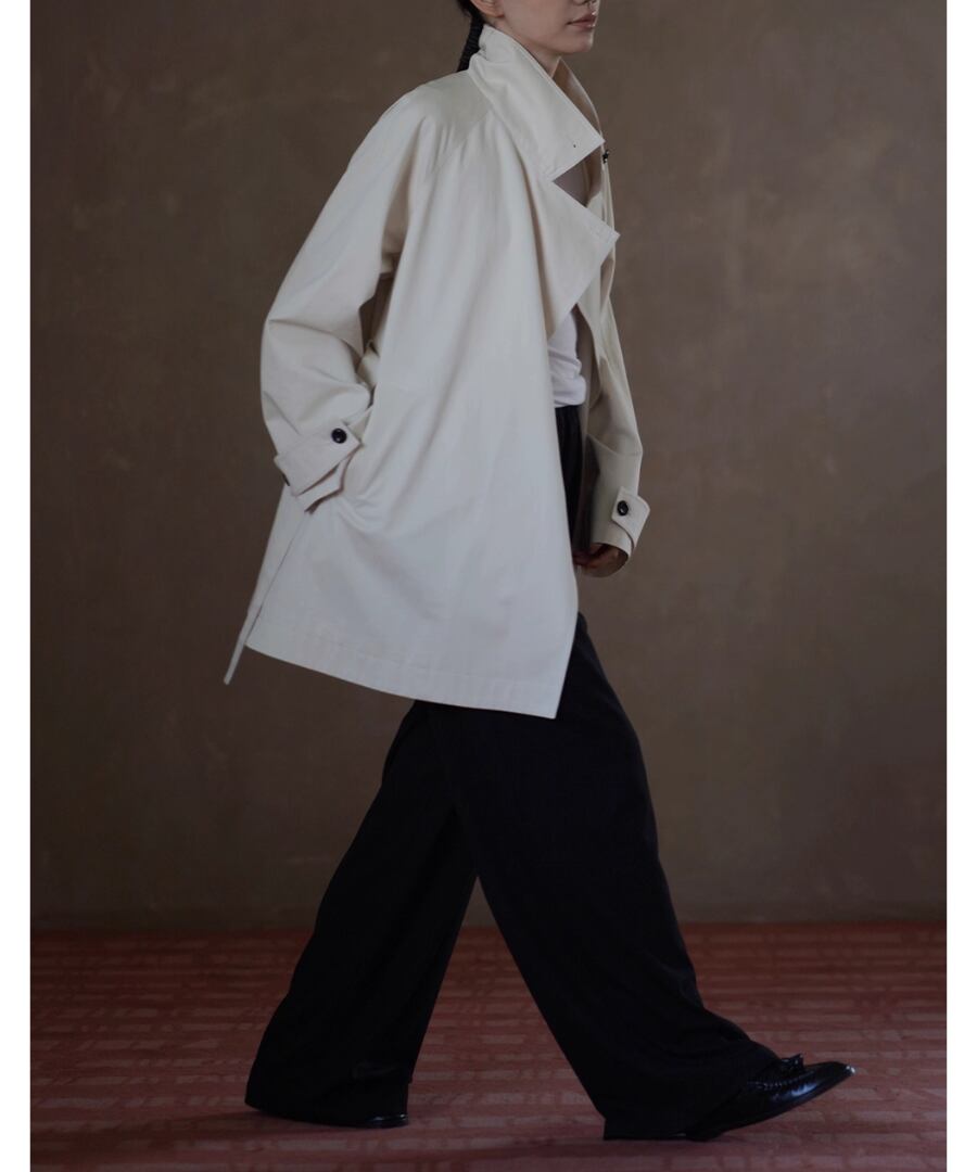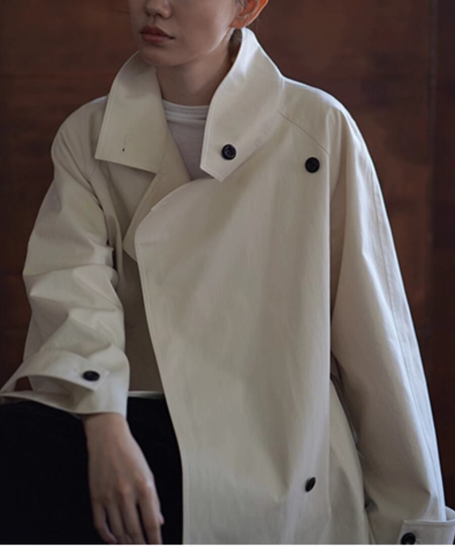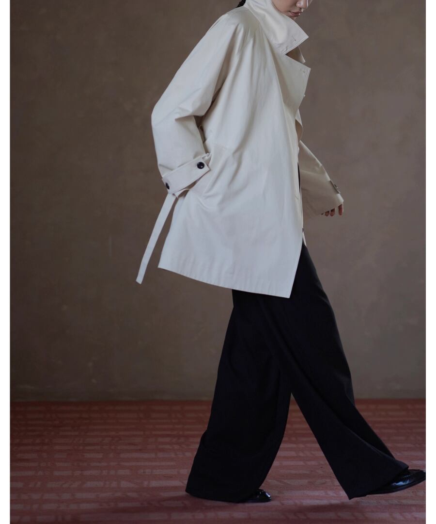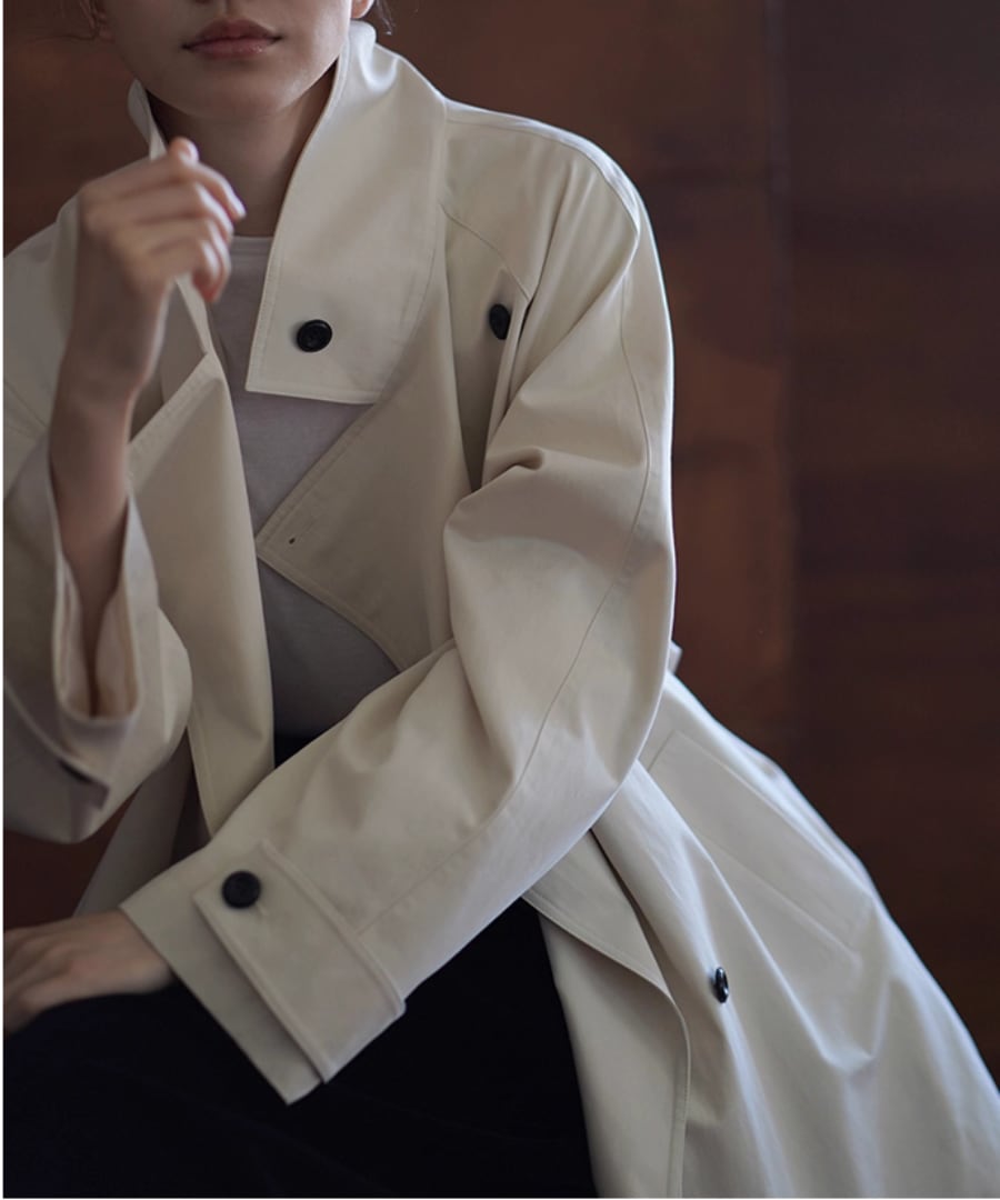 エレガントなシルエットと、トレンチコートならではのディテールが施されており、上質なファッションセンスを感じさせます。