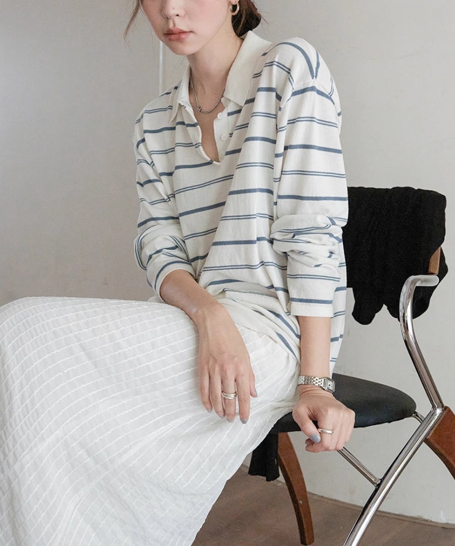 ポロネックラインにより、首元をすっきりと美しく見せます。