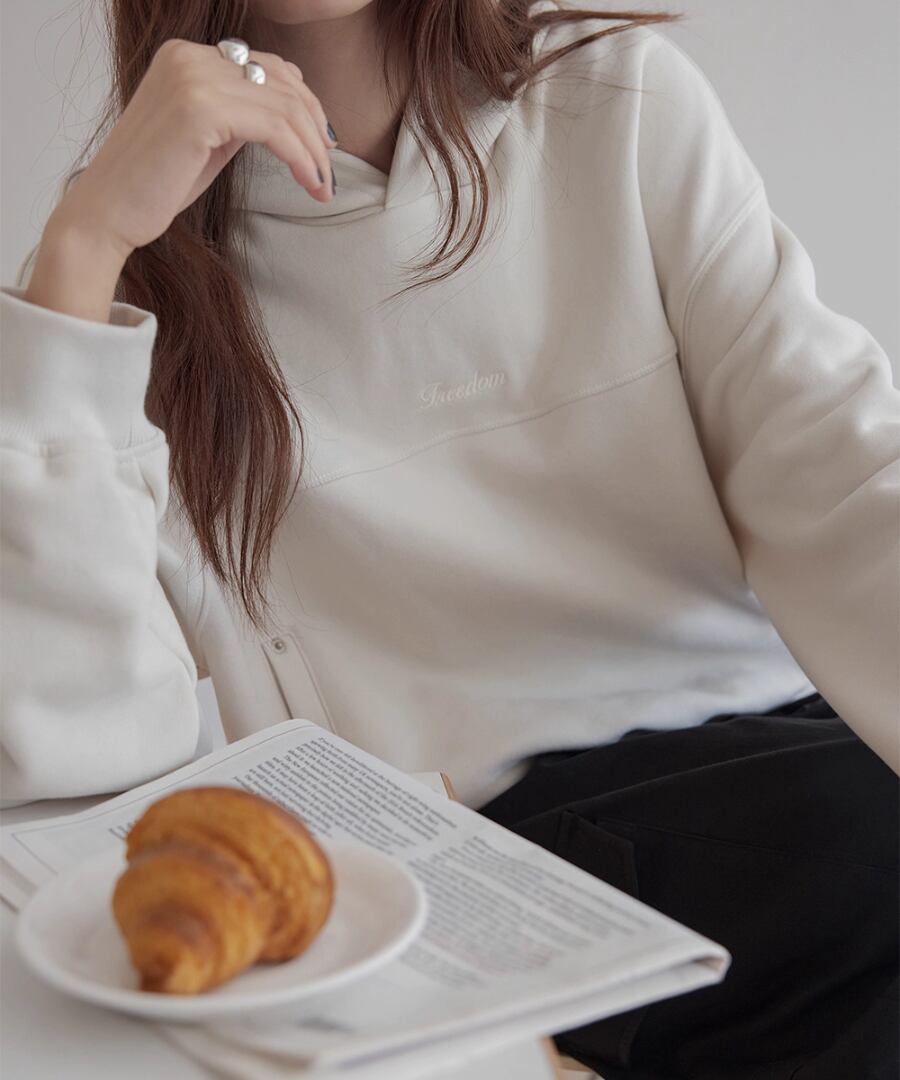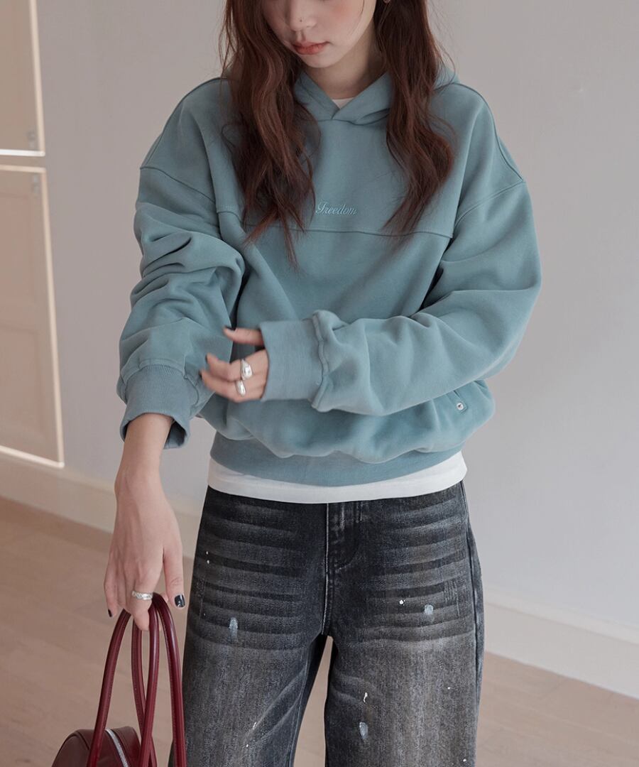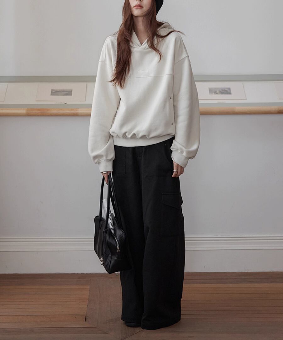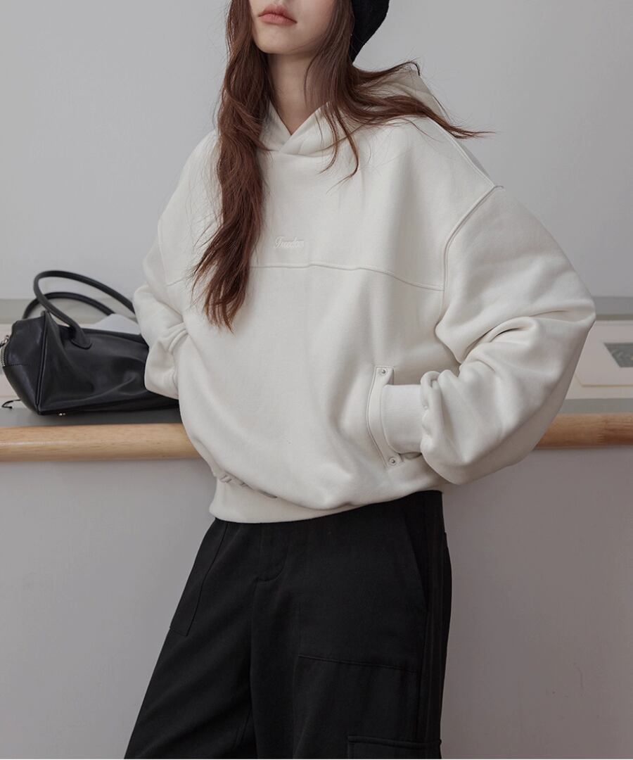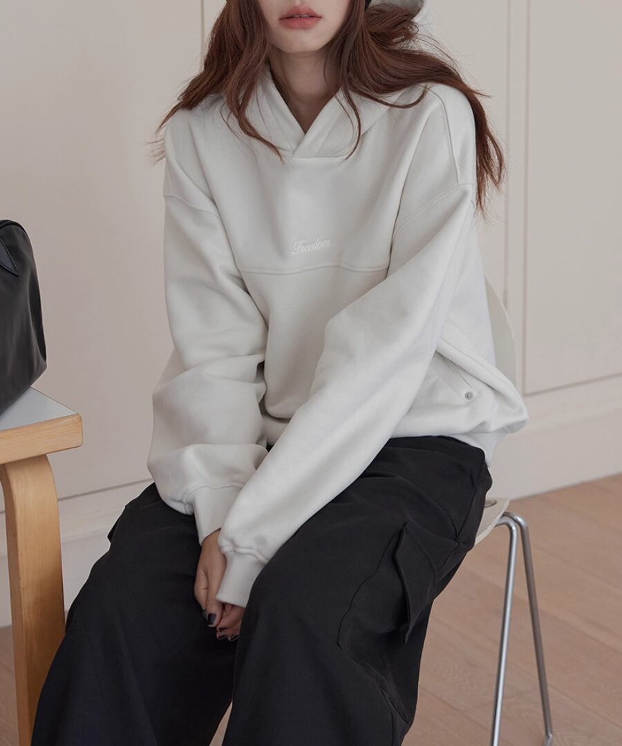 裏起毛の柔らかな素材感で、寒い季節でも心地よい暖かさを提供するスウェットパーカー。
