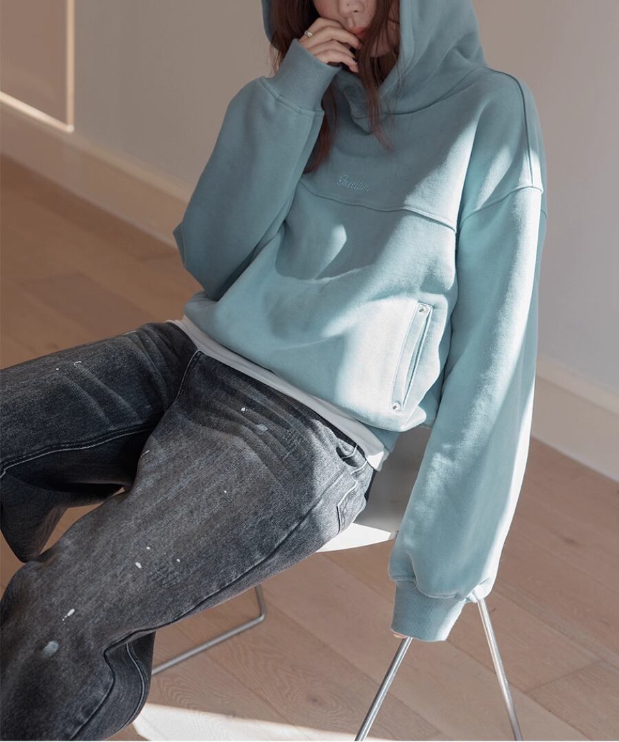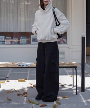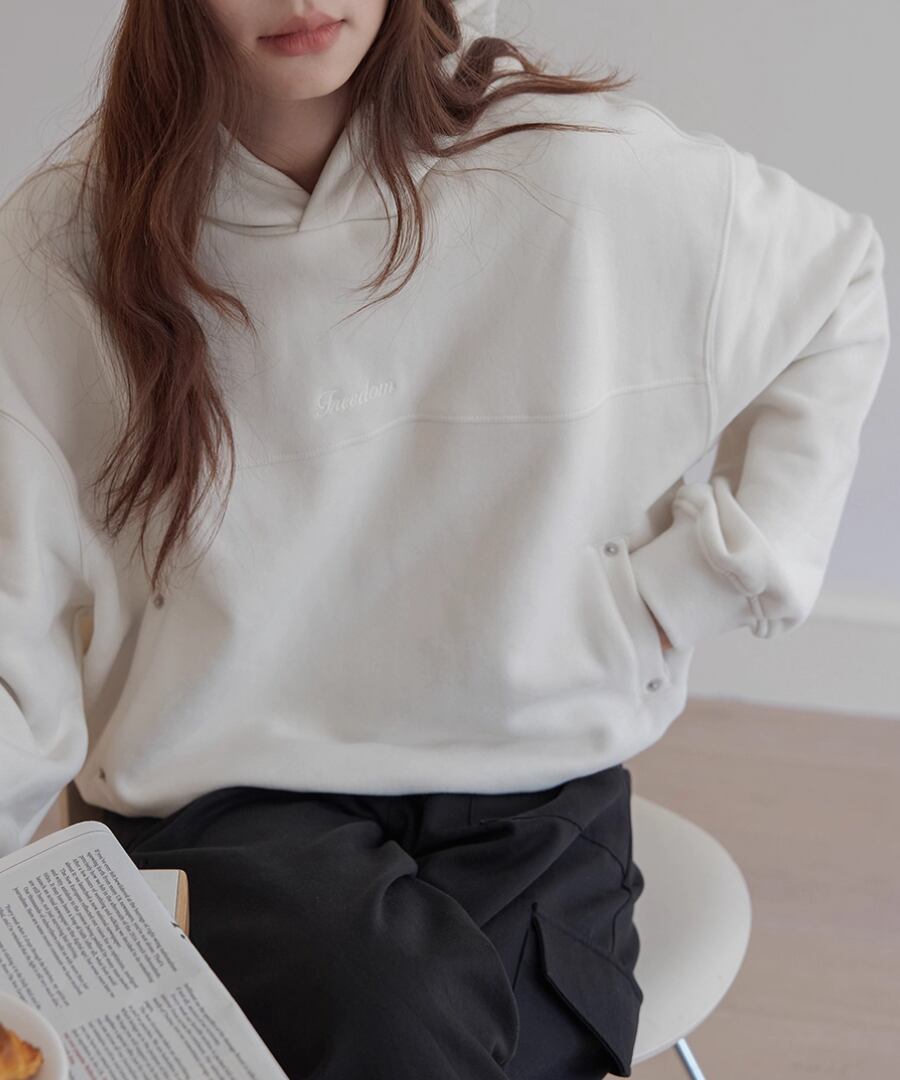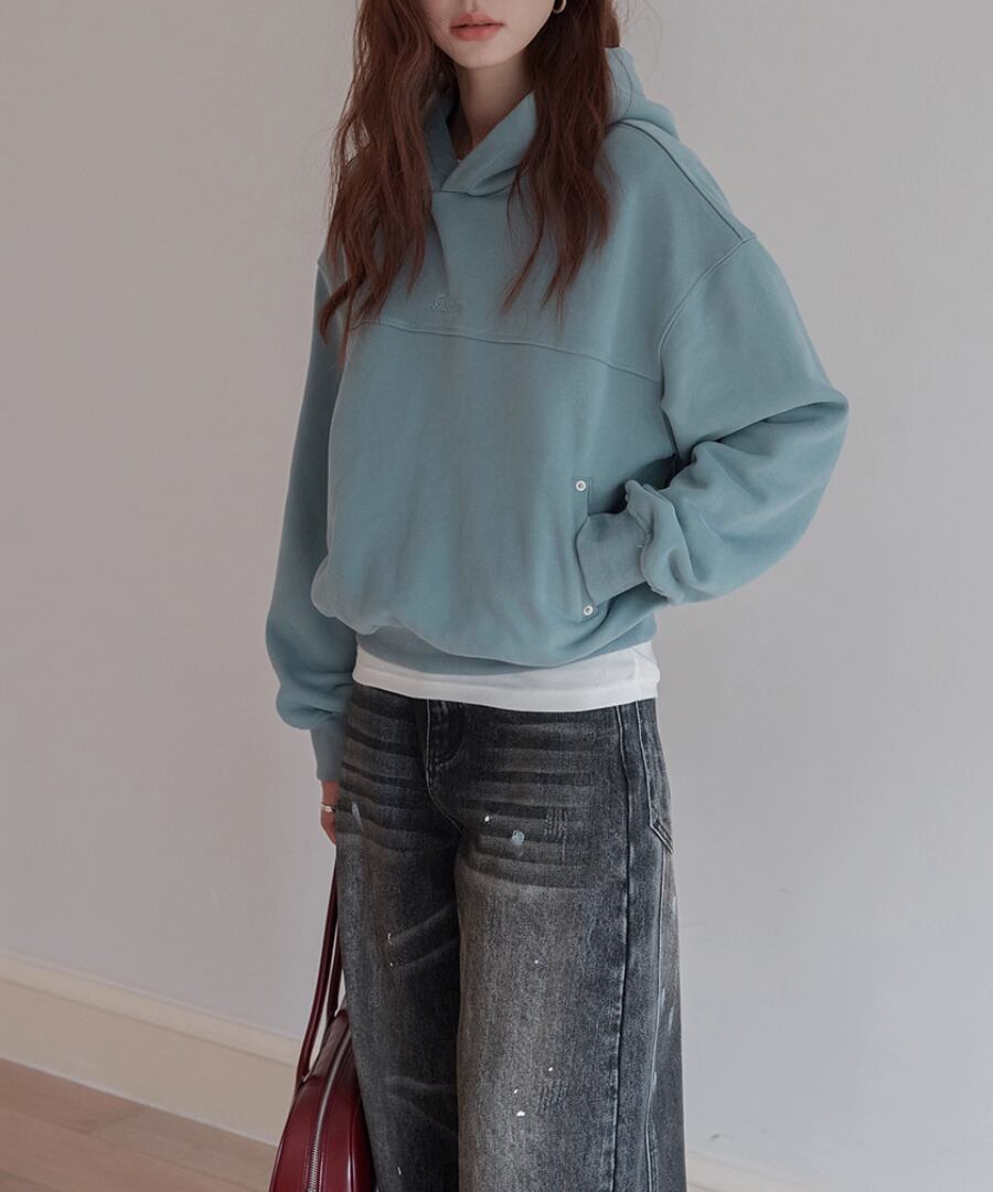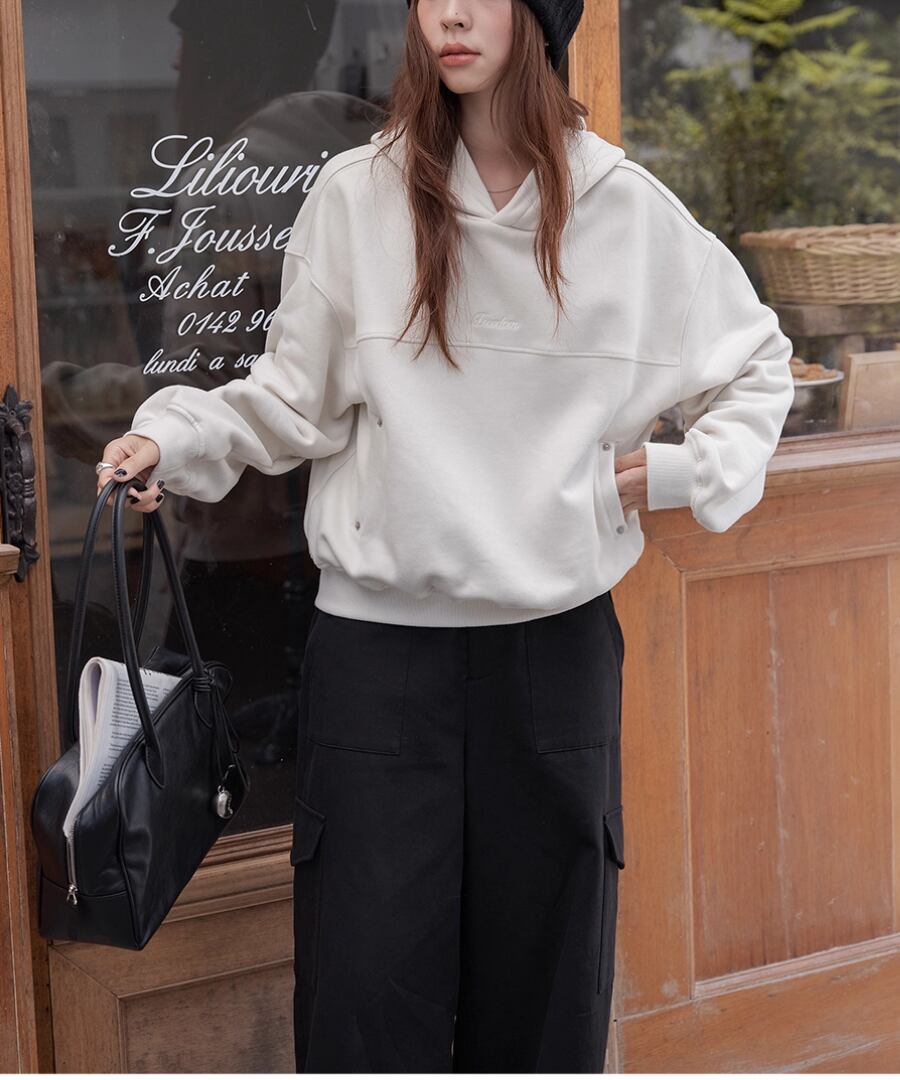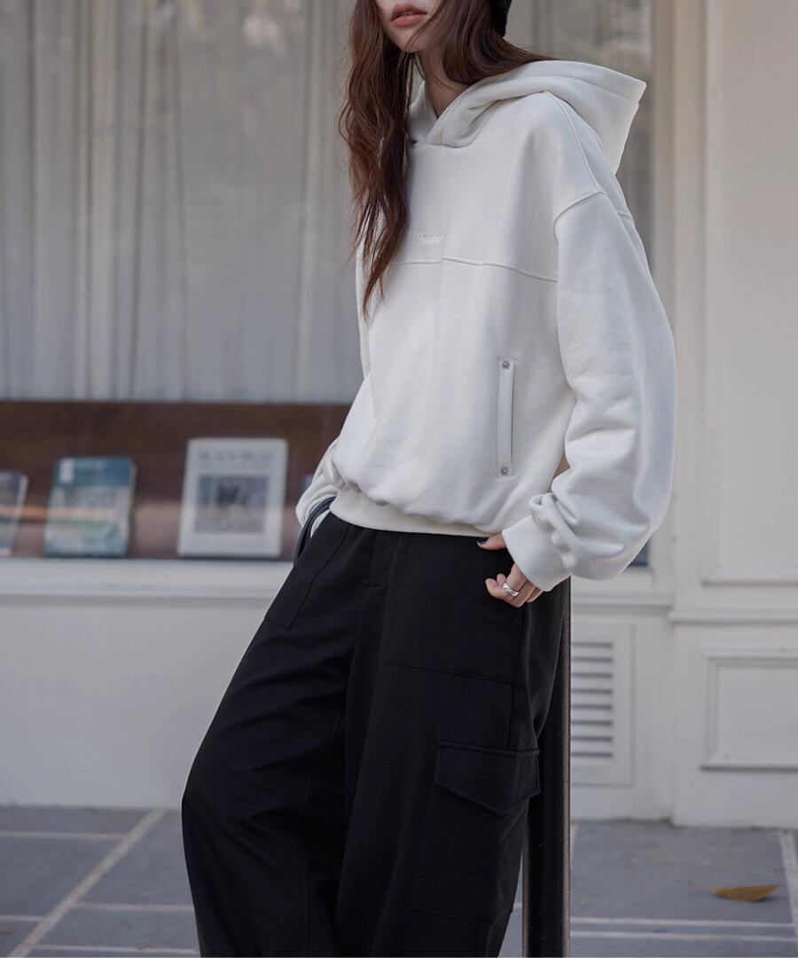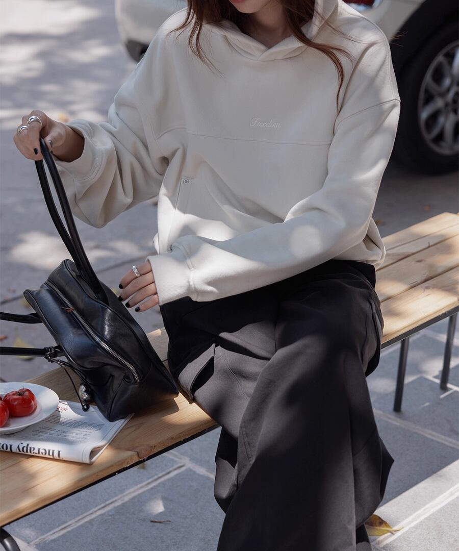 裏起毛の柔らかな素材感で、寒い季節でも心地よい暖かさを提供するスウェットパーカー。