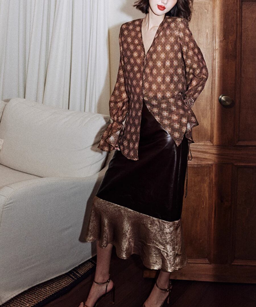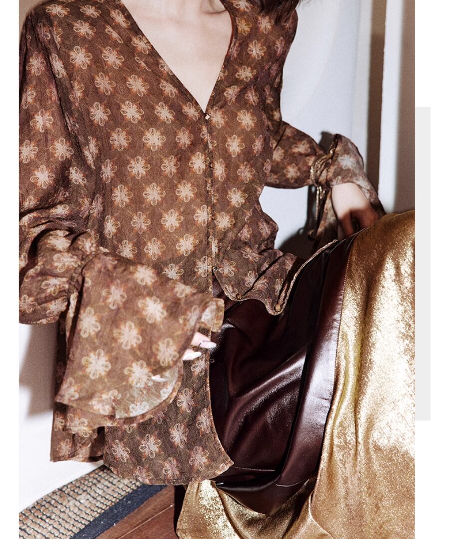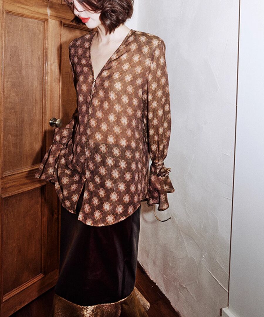 優雅なレトロジャカードが魅力的なVネックフラワータイブラウス。