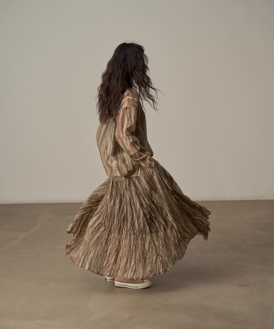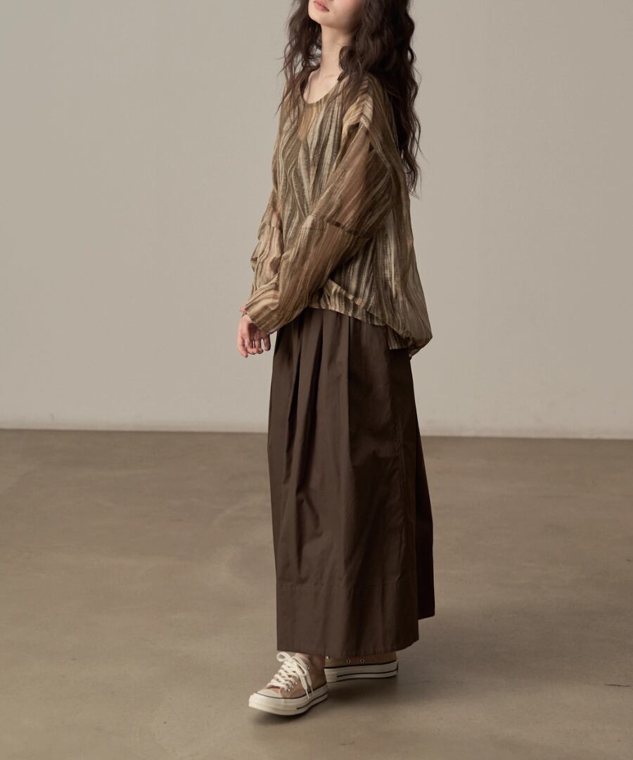 ブラウンカラーが落ち着いた雰囲気をかもし、ボディラインを拾わないシルエットで着心地も快適です。