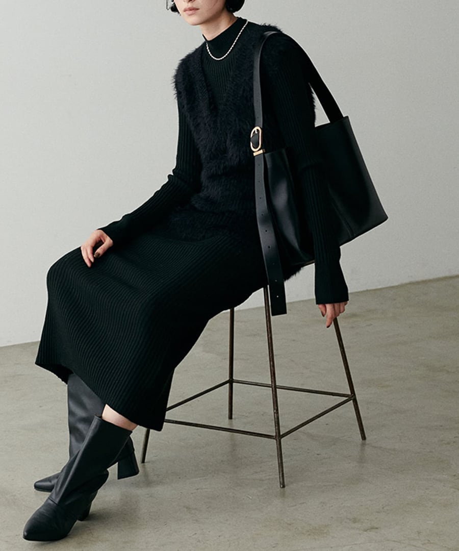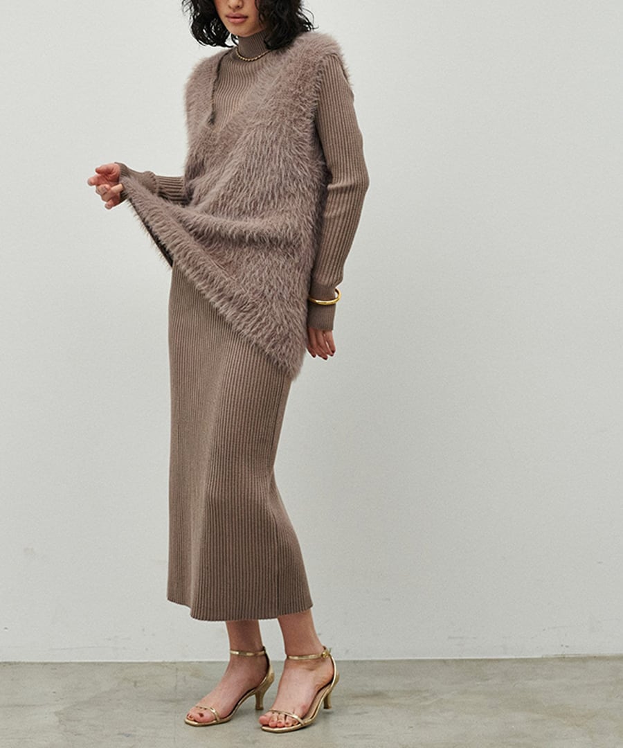 季節感あふれるリブニットワンピース&ファーベストのセットアップ。