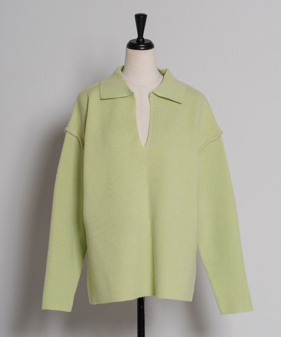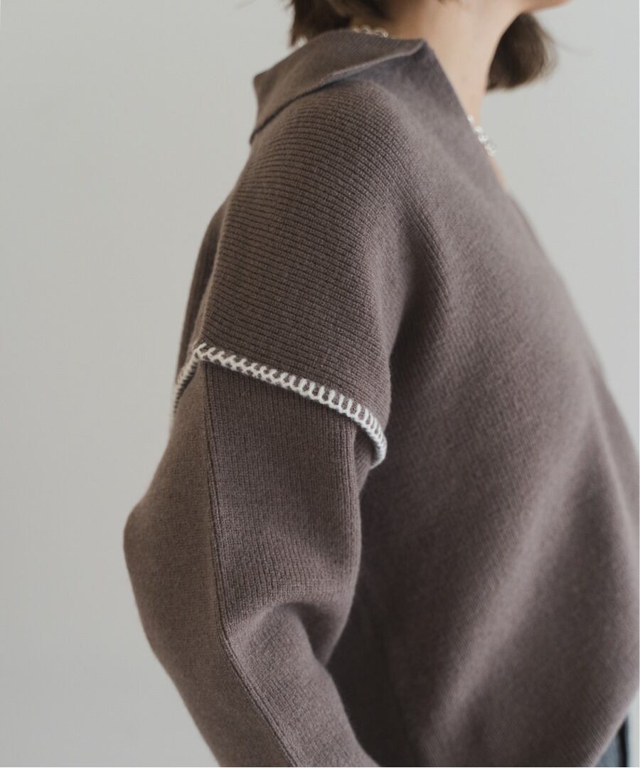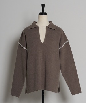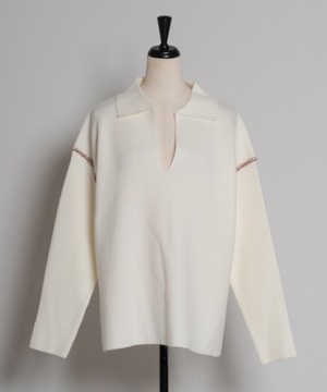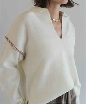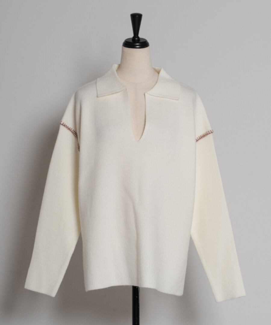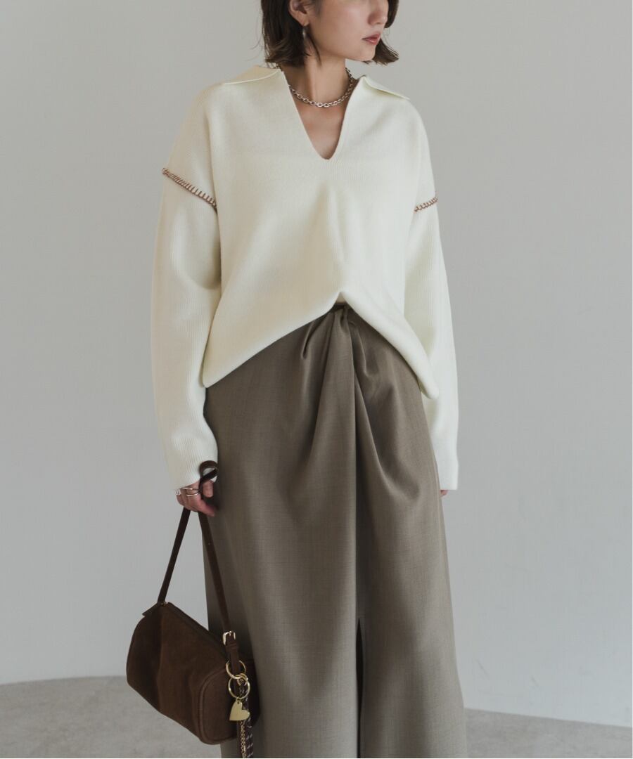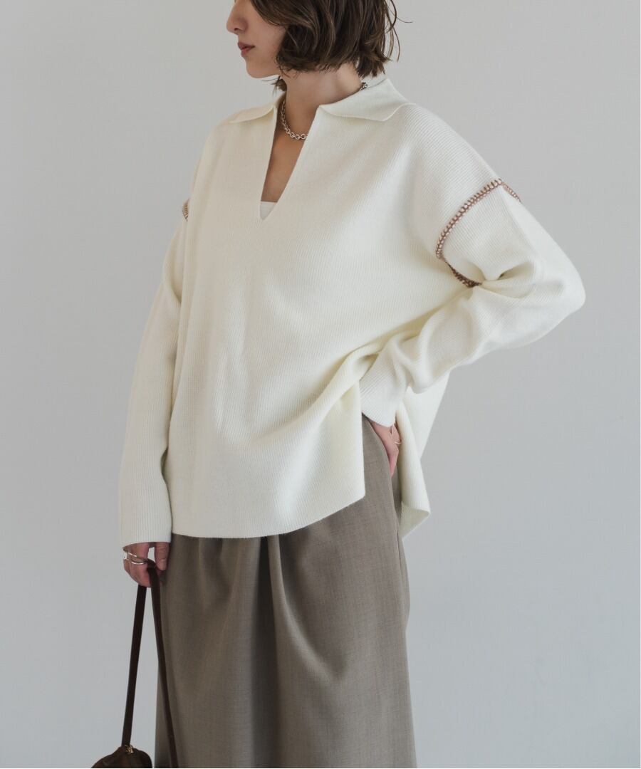 襟付きデザインとスキッパーネックが抜け感を演出するニットプルオーバー。