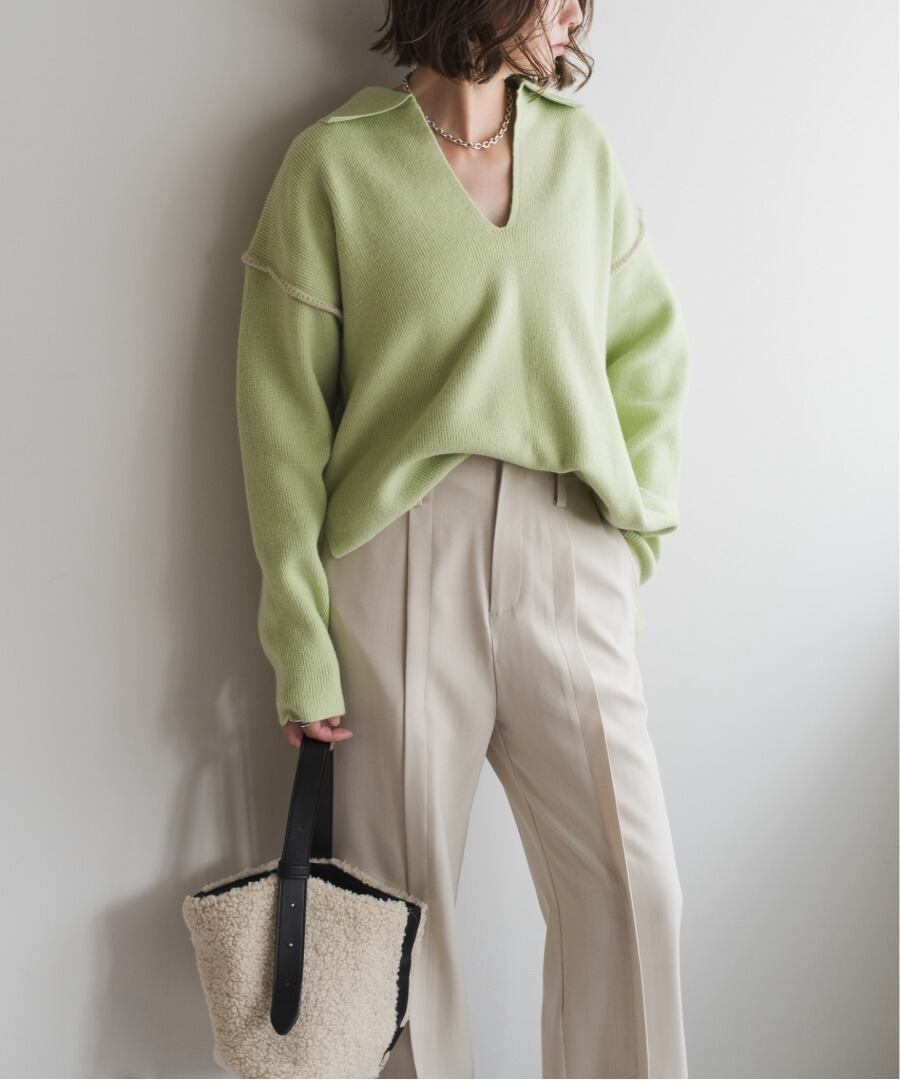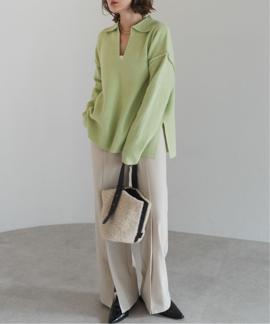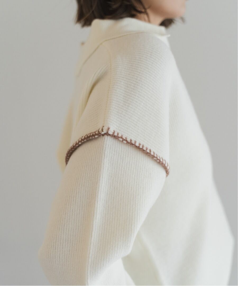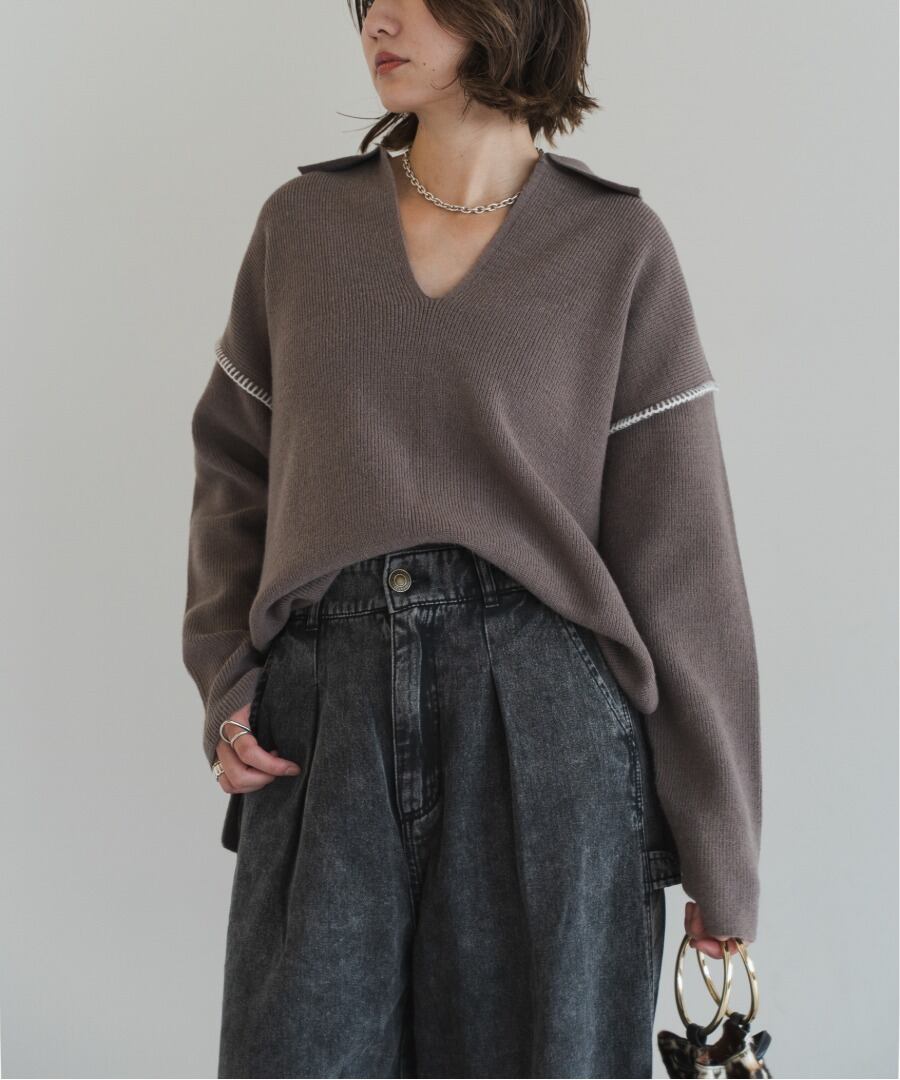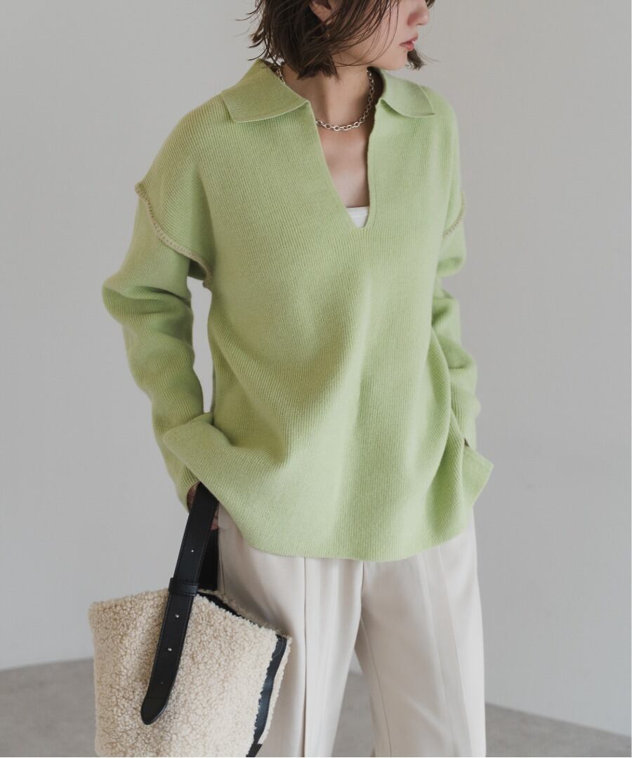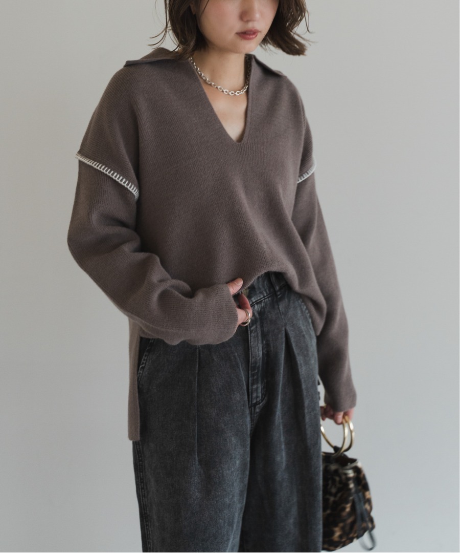 襟付きデザインとスキッパーネックが抜け感を演出するニットプルオーバー。