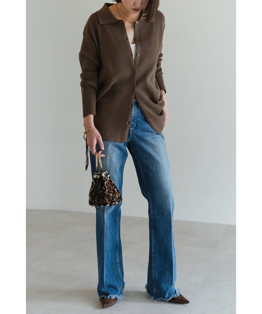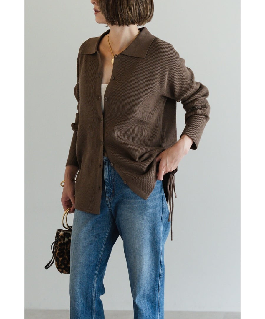 トップスはポロ襟デザインがクラシックな印象のカーディガン。