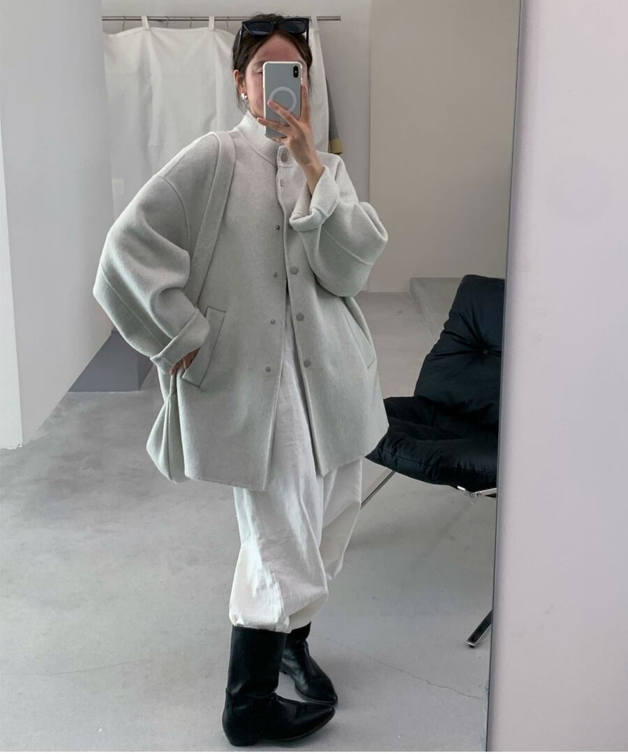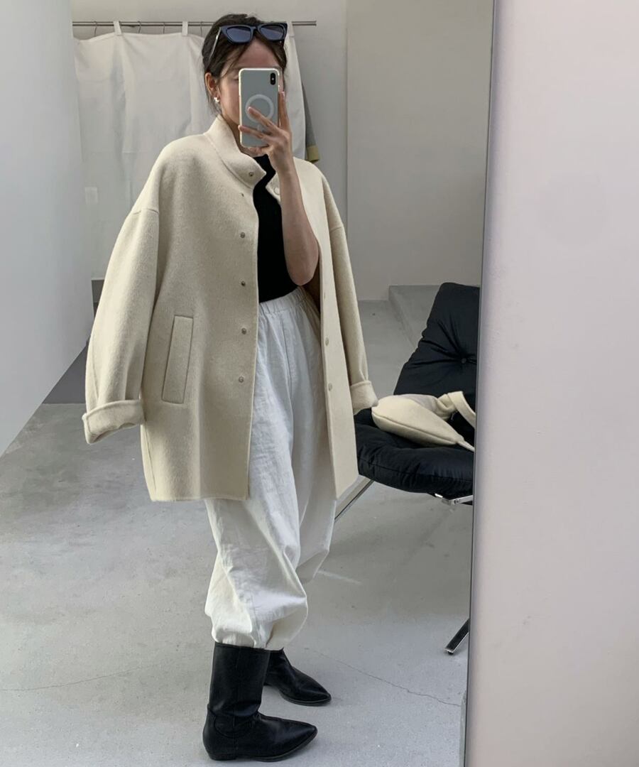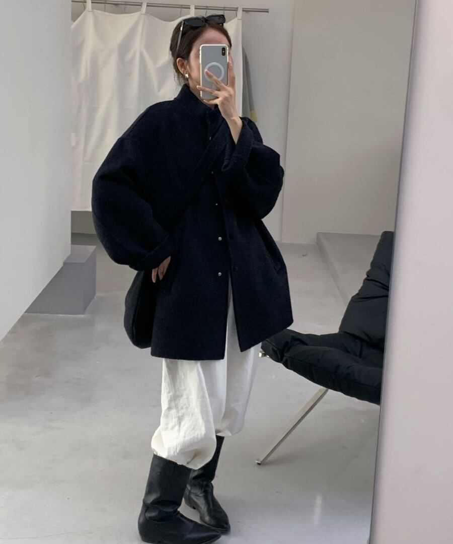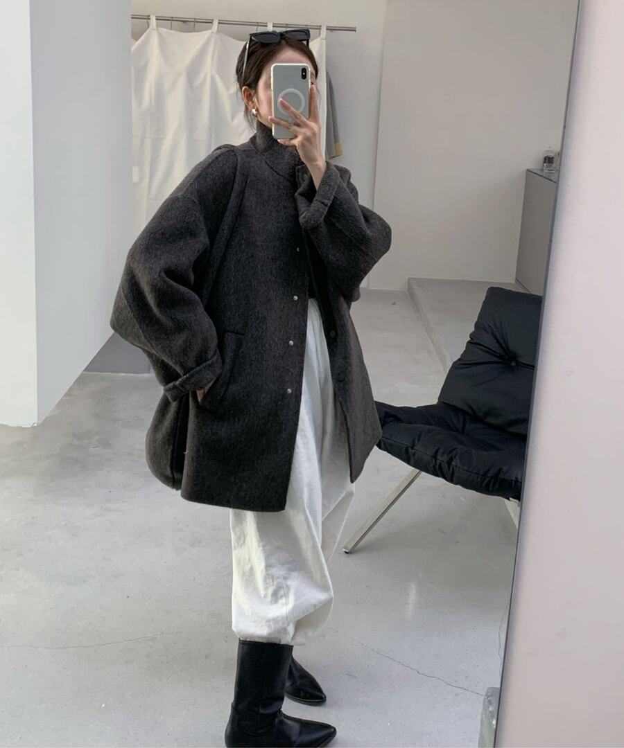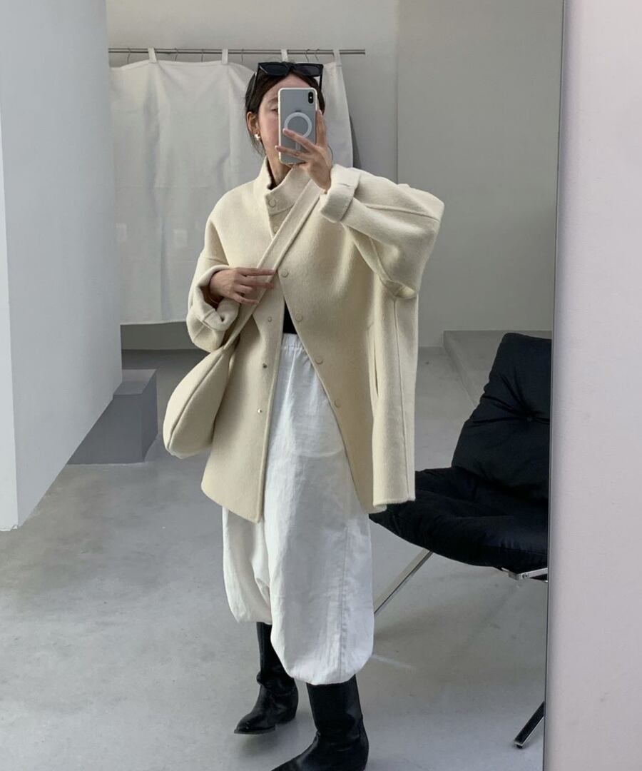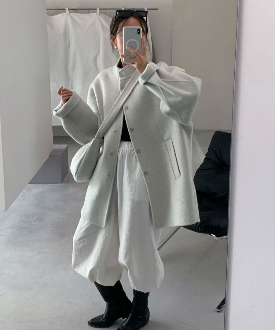 コクーンシルエットが特徴のミドルコートとスタイリッシュなバッグのセット。
