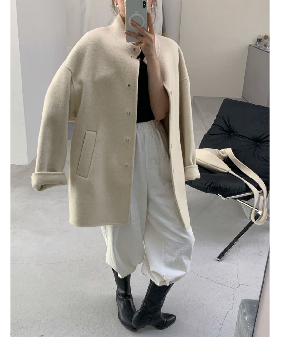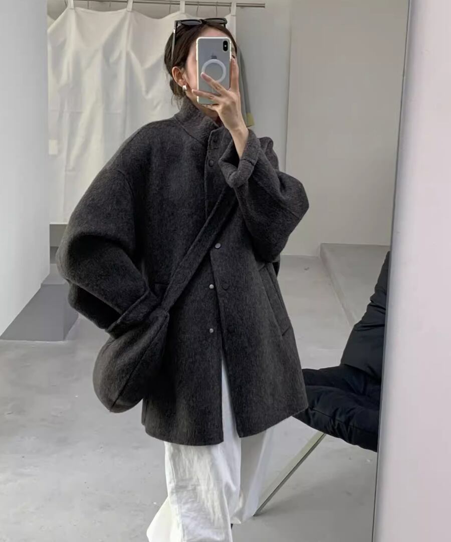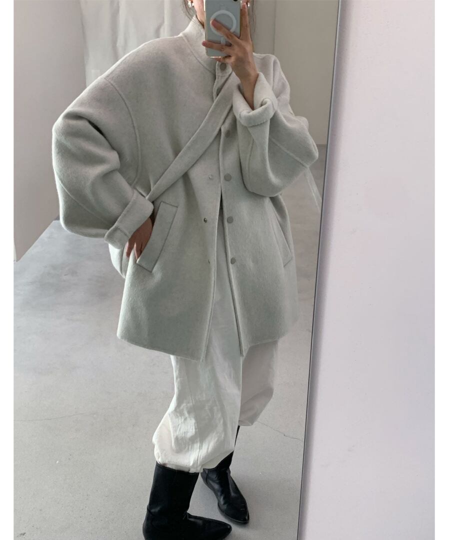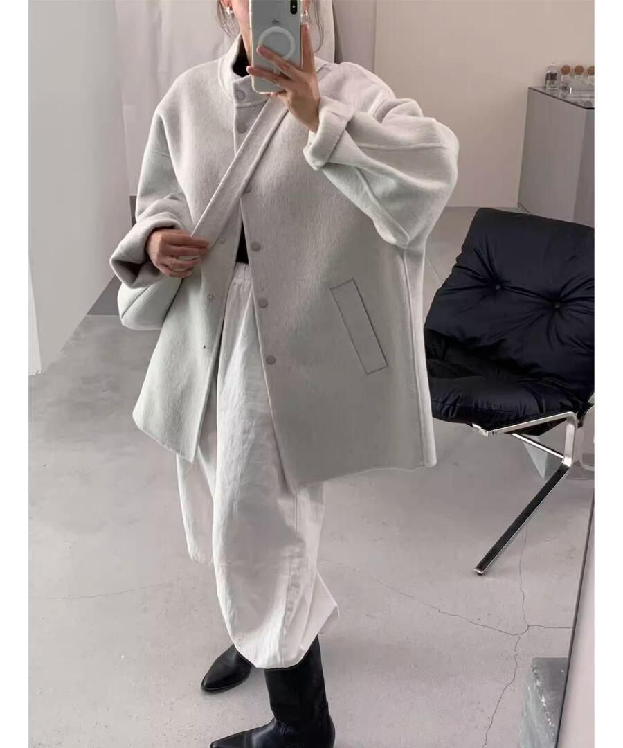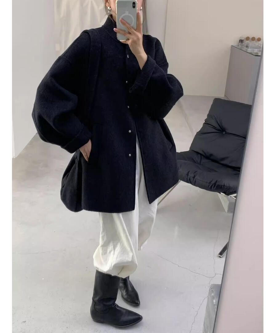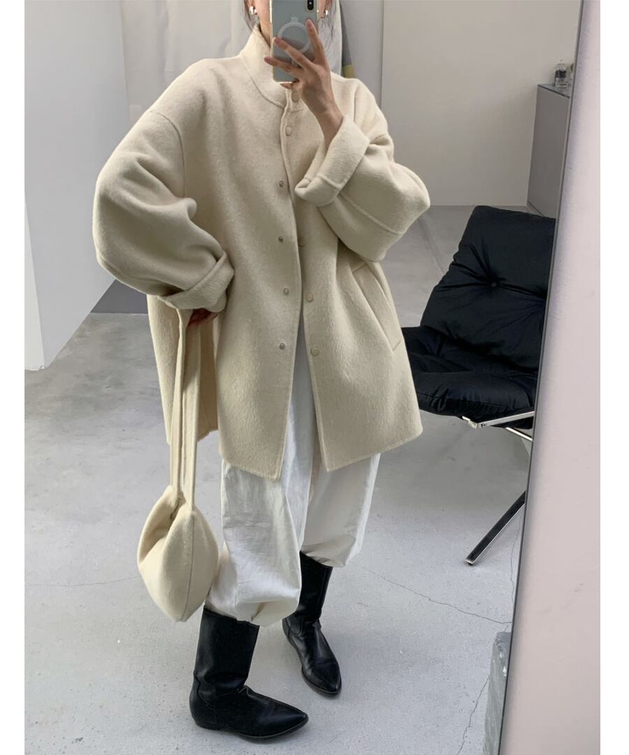 コクーンシルエットが特徴のミドルコートとスタイリッシュなバッグのセット。