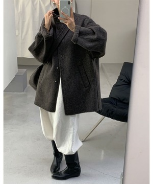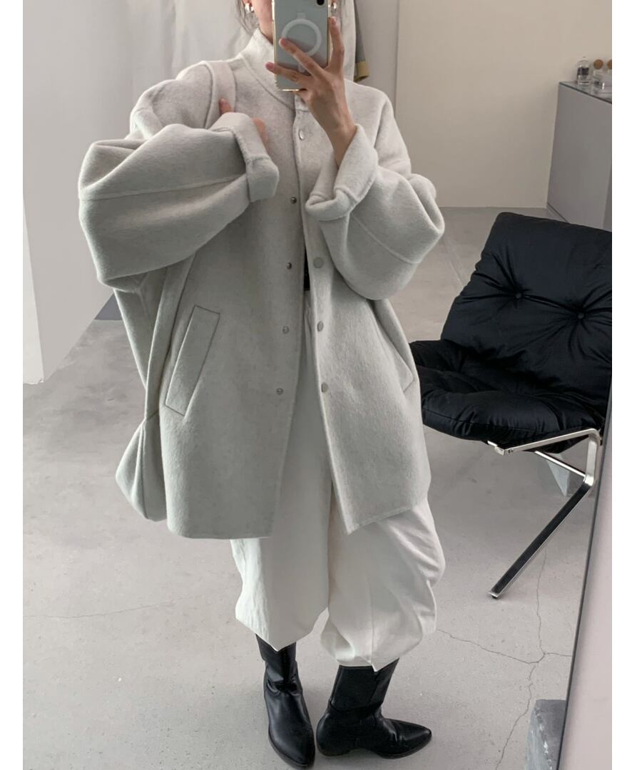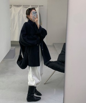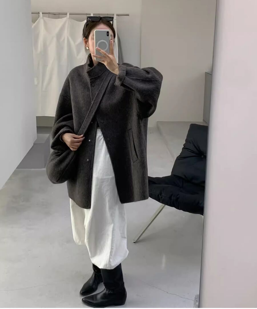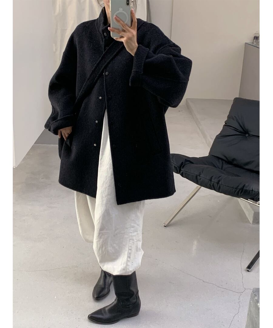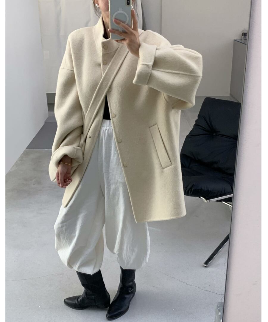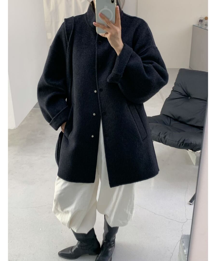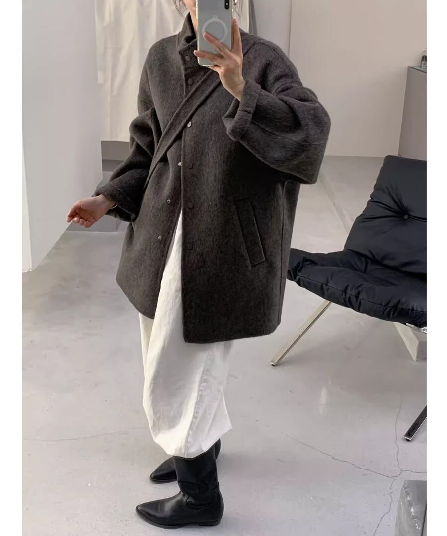 コクーンシルエットが特徴のミドルコートとスタイリッシュなバッグのセット。