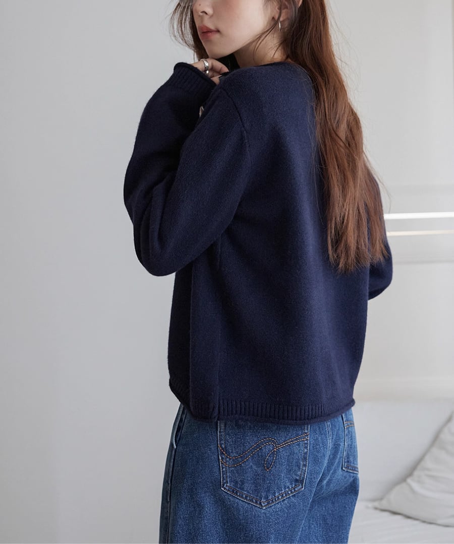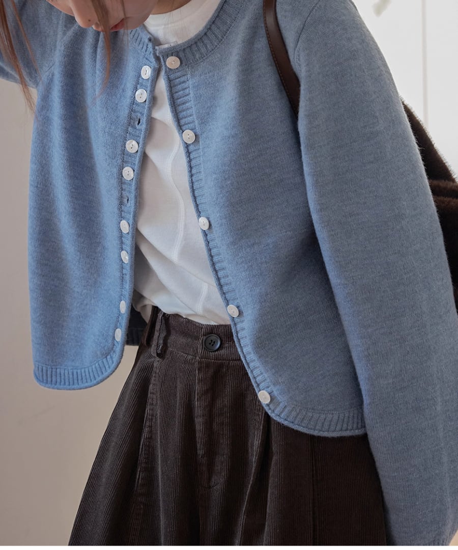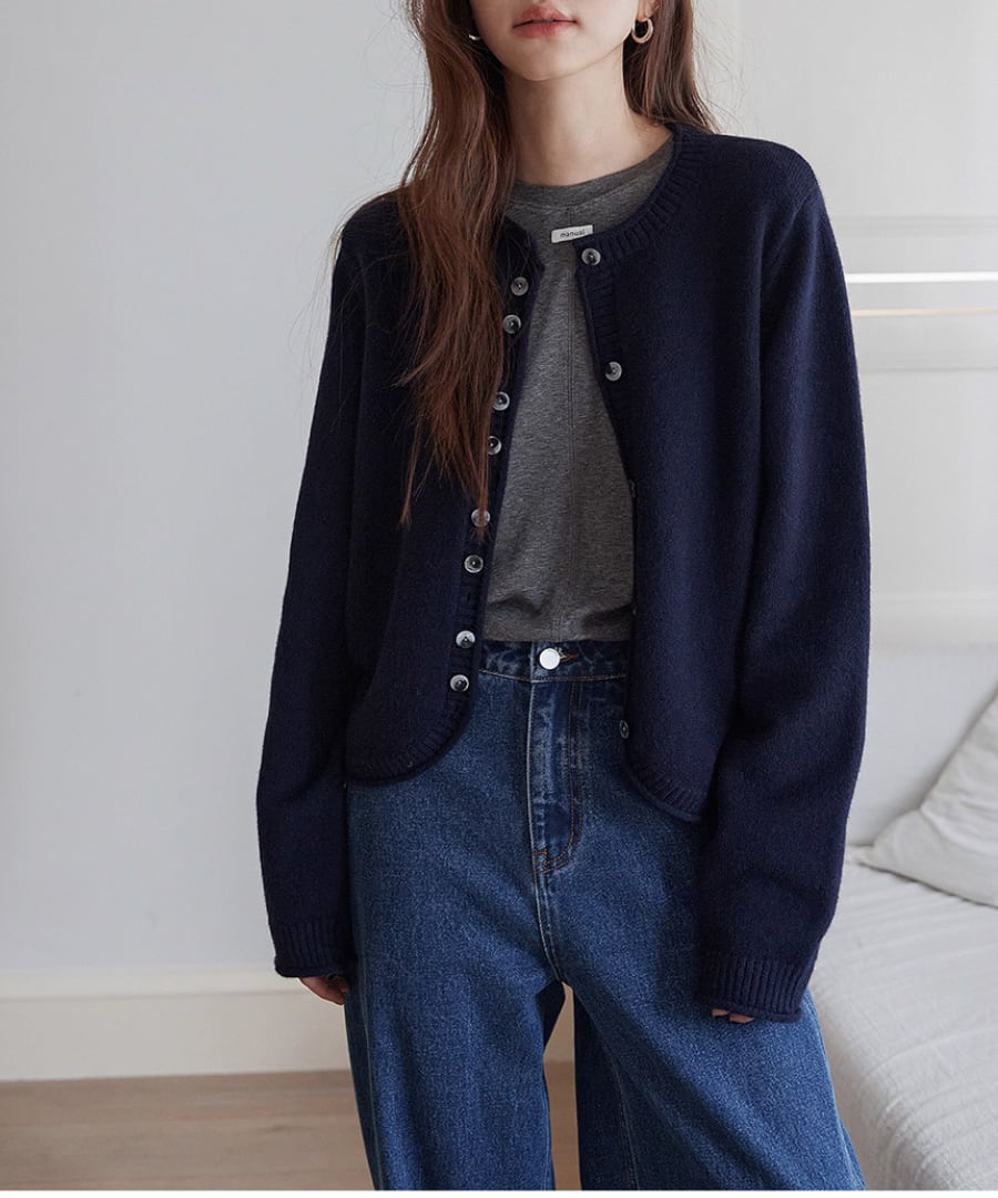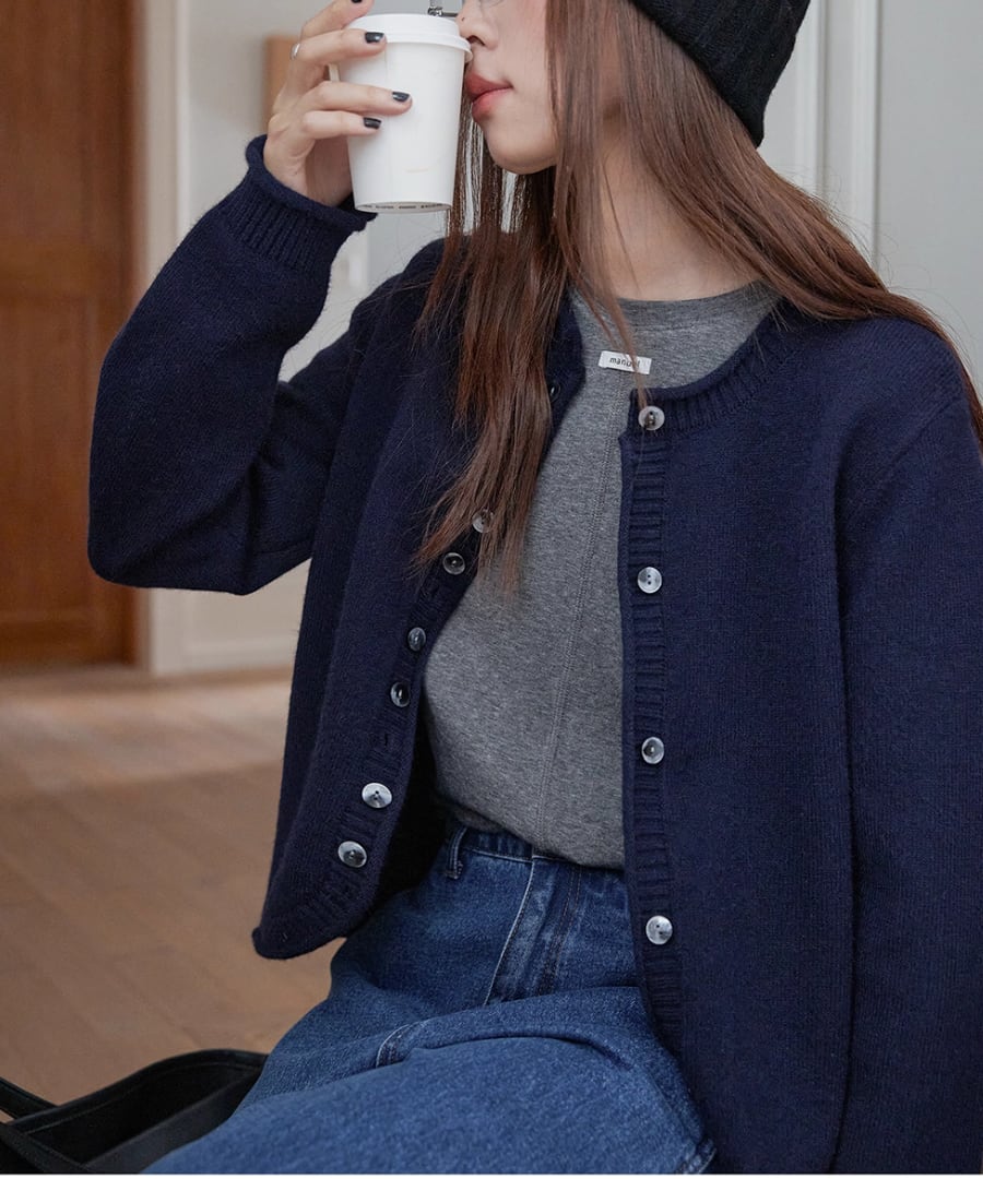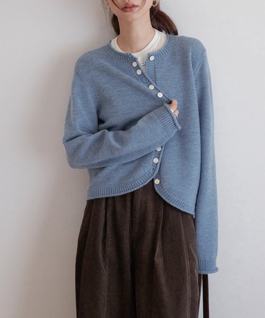 美しく精巧な螺鈿ボタンが並ぶ、アイリスブルーとネイビーブルー2collarのニットカーディガン。