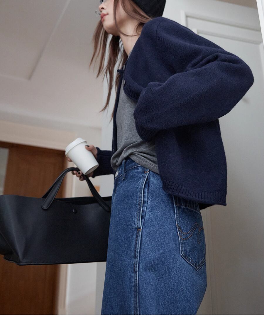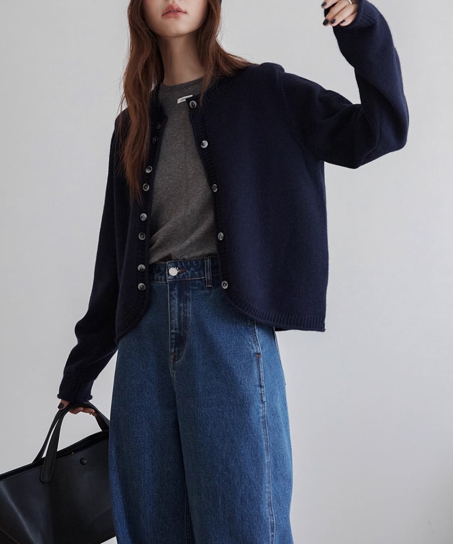 ウール混紡生地は軽い着心地で、クルーネックやクロップドスタイルにマッチ。