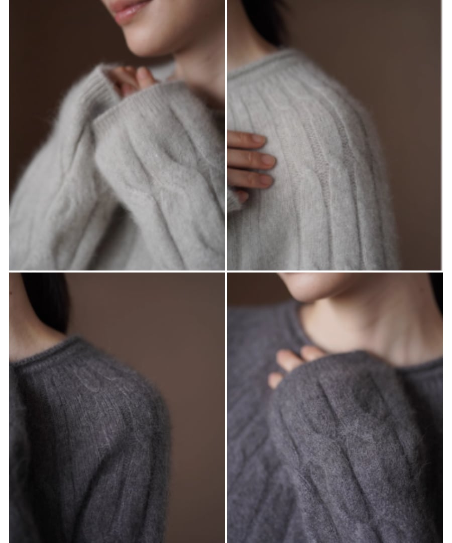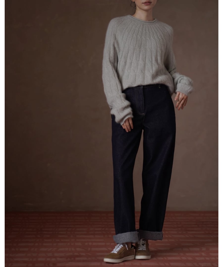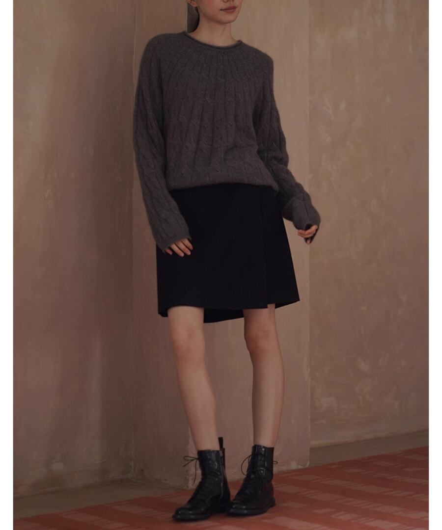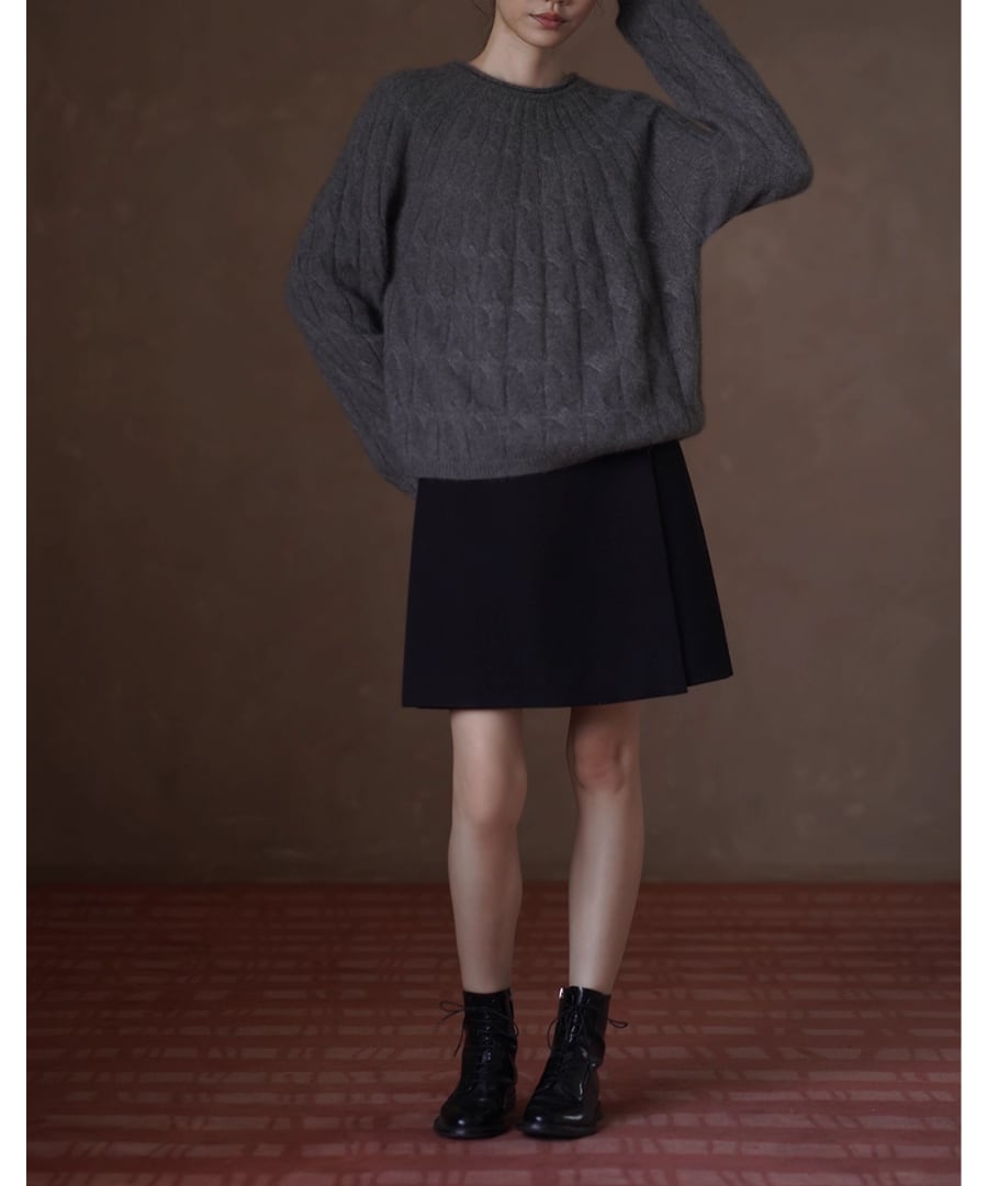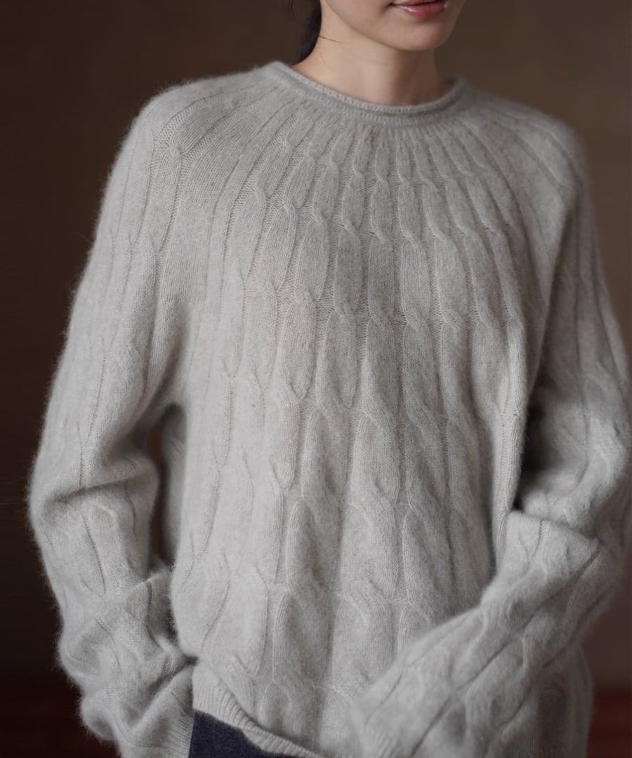 ふんわりとしたウール混の素材が心地よさを提供する、丸襟デザインのゆったりケーブルニット。