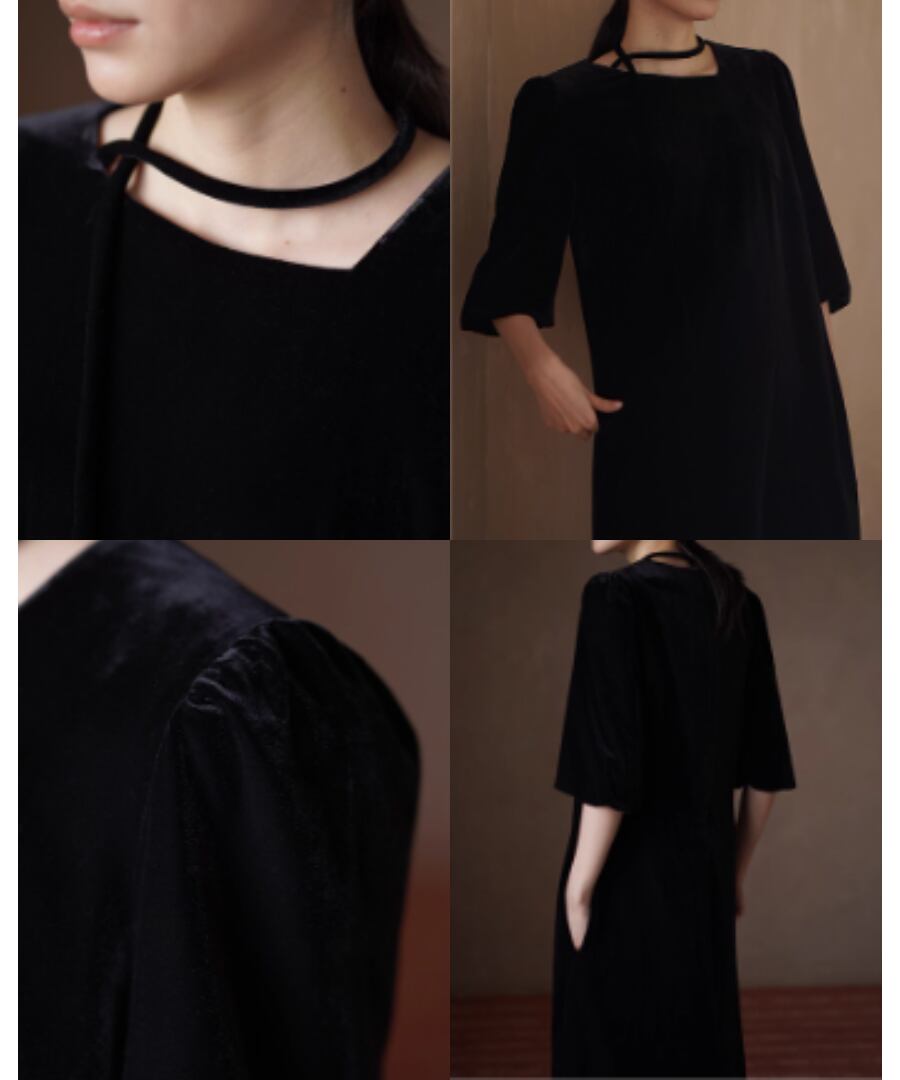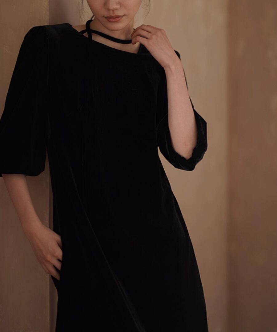 洗練されたアシンメトリーネックラインデザインのベルベットワンピース。