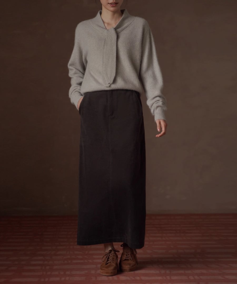 ネック部分はややスタンドネックになっており、品のあるきちんとした印象にし首を優しく包み込みます。