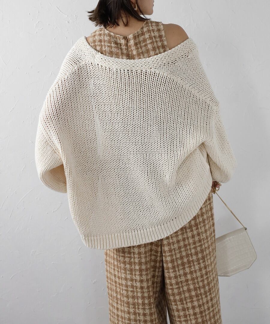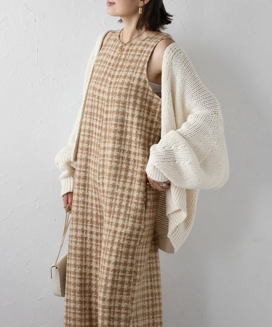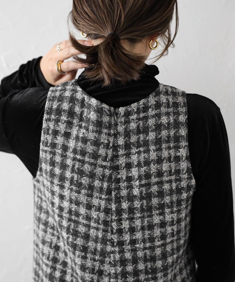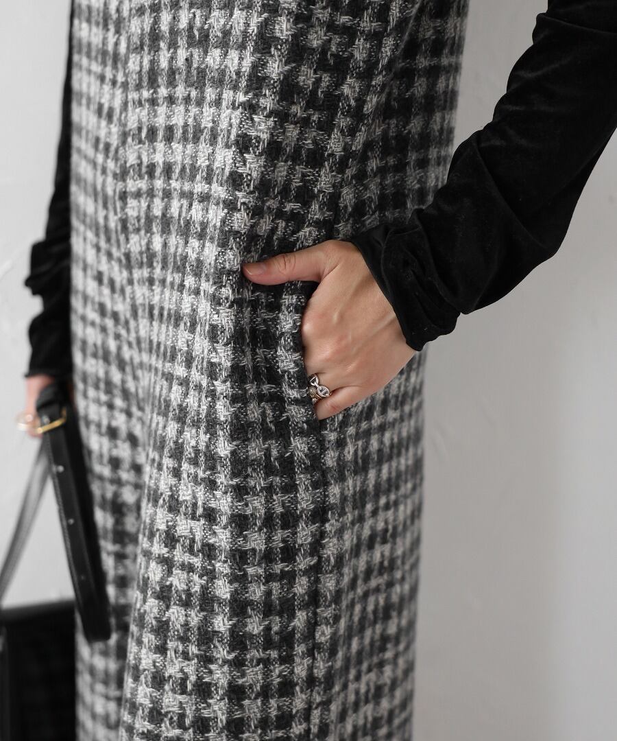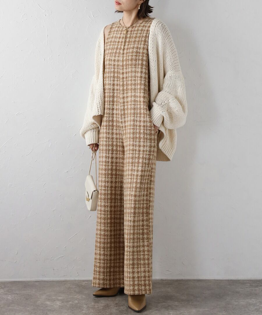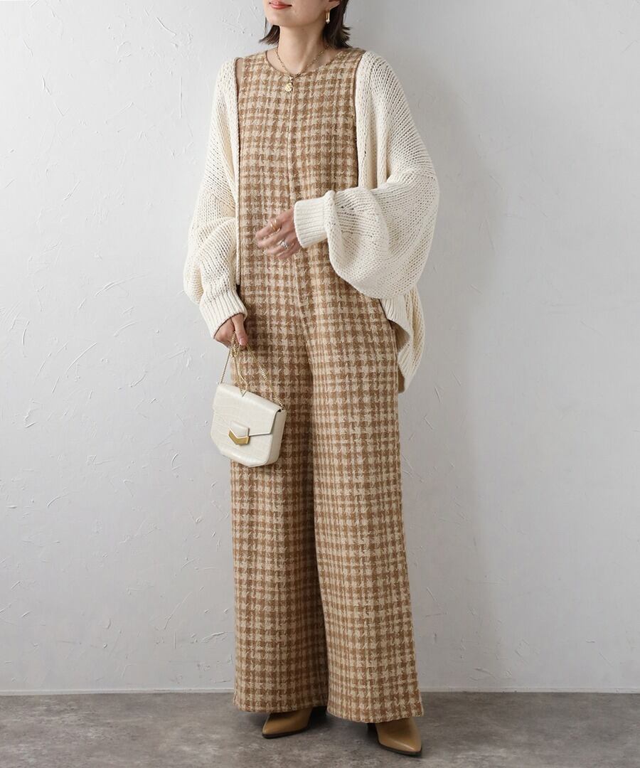 立体感のあるチェック柄が映える。洗練されたツイードオールインワン
