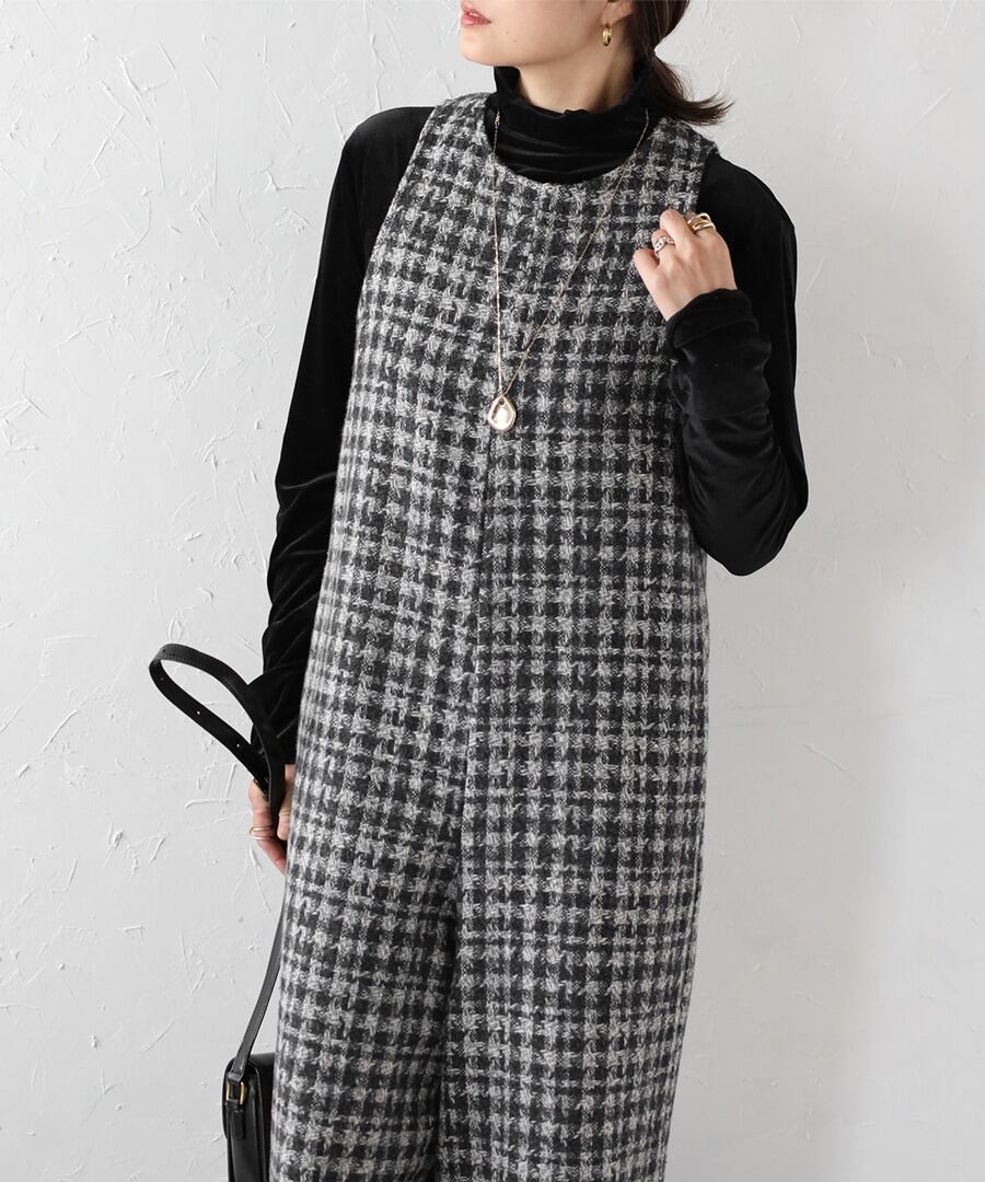クラシックなチェック柄がシンプルながらスタイリッシュに演出してくれるツイードオールインワン。