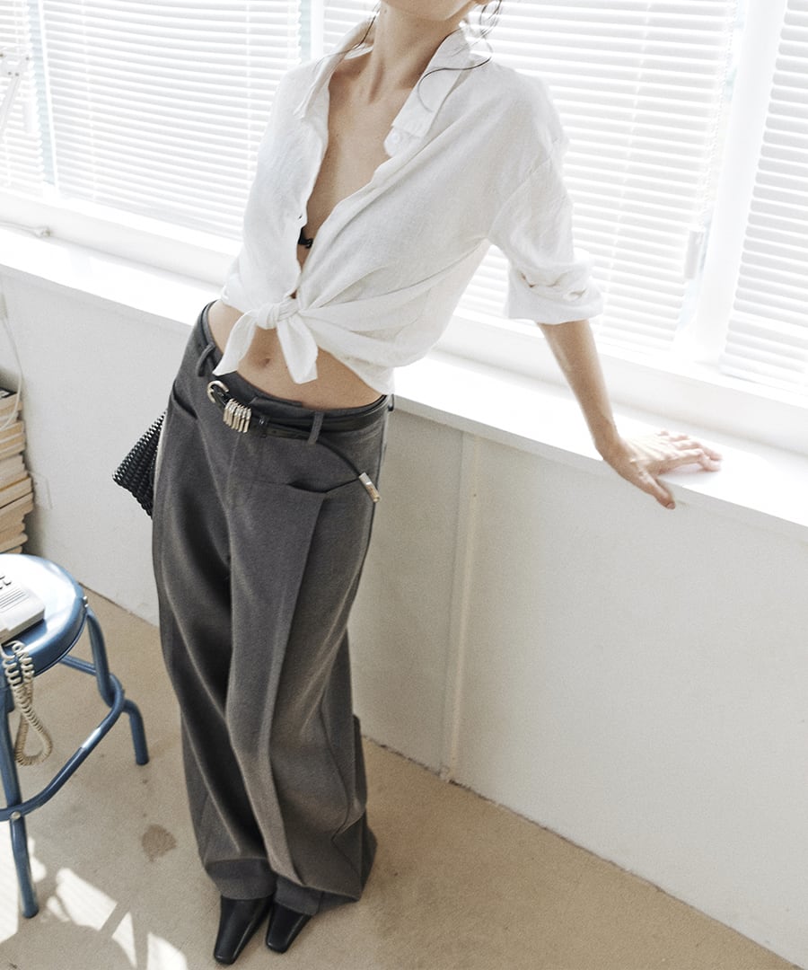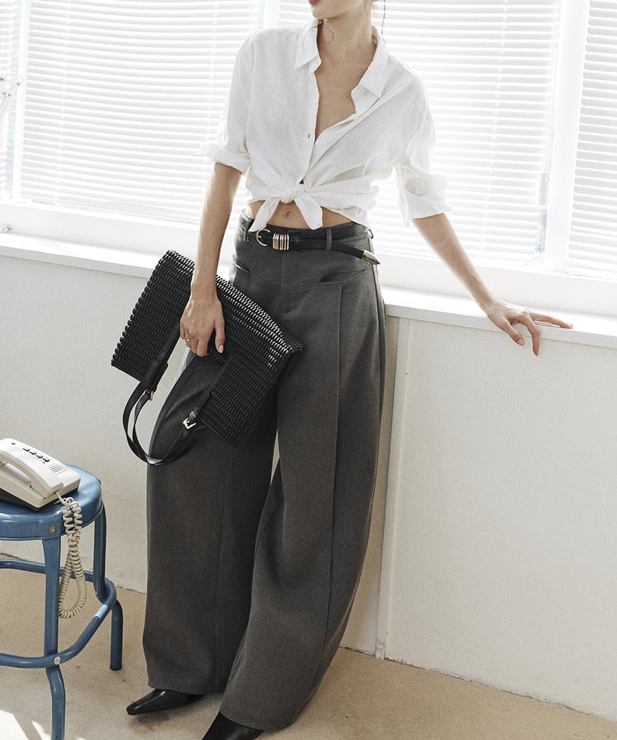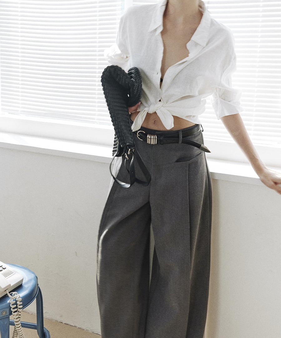 フロントポケットがスタイリッシュな印象を与えるワイドスーツパンツ。
