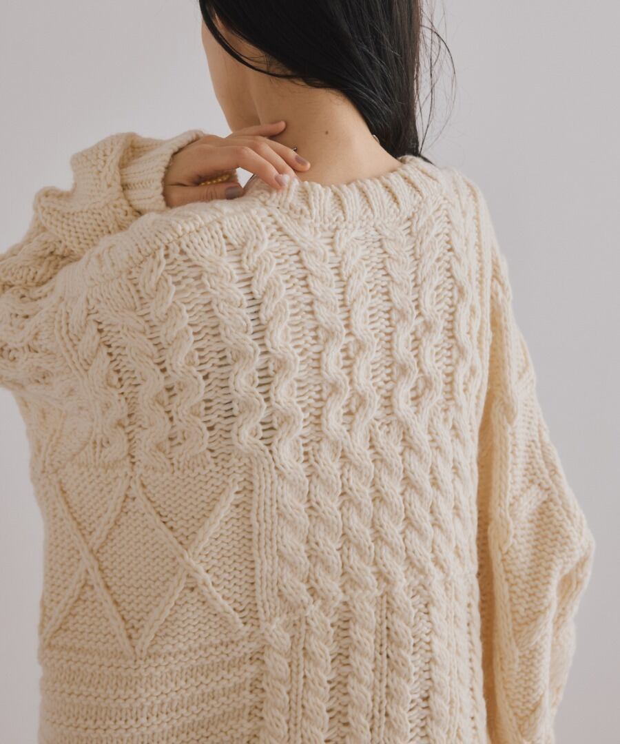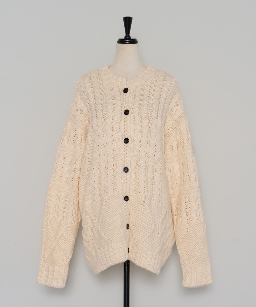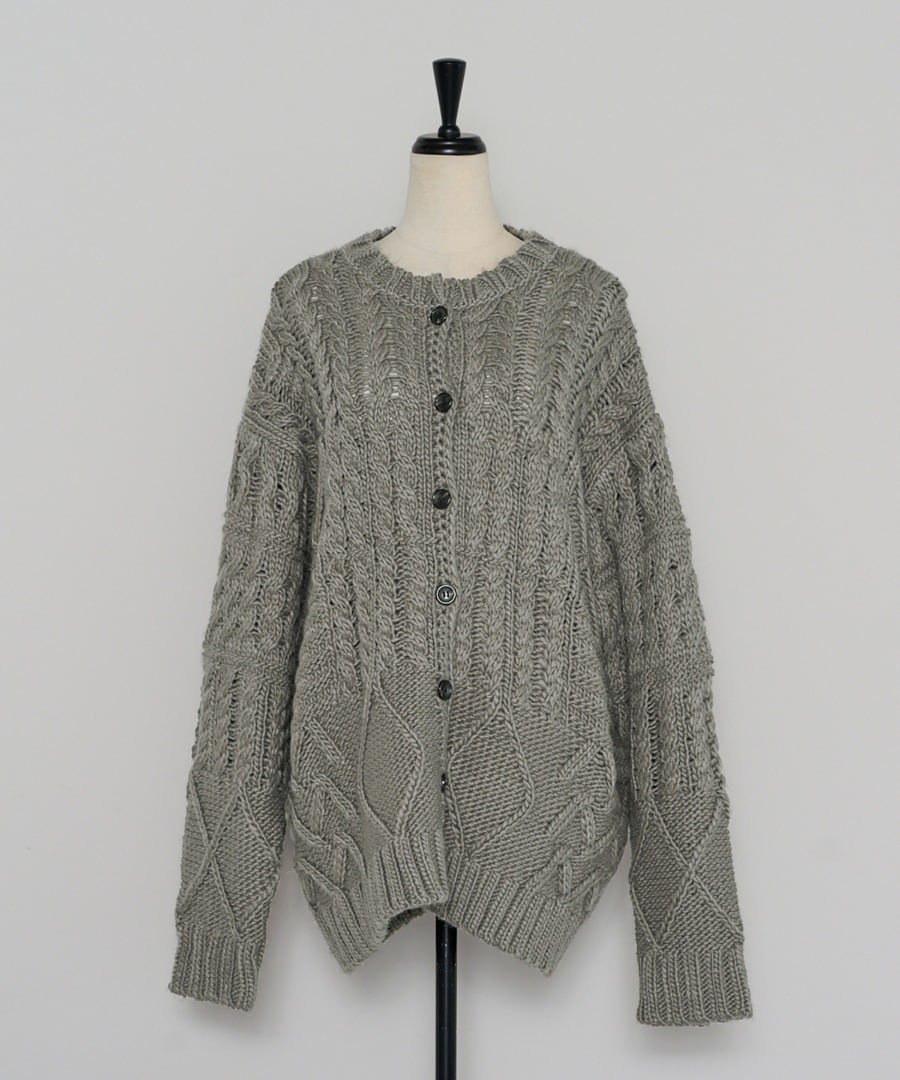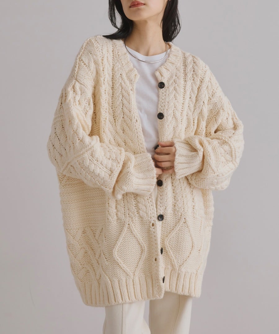 複数の編み柄を組み合わせた立体的な表情が特徴のニットカーディガン。