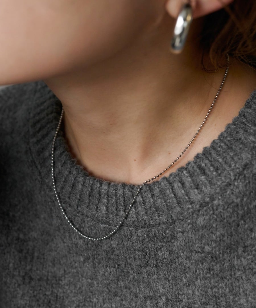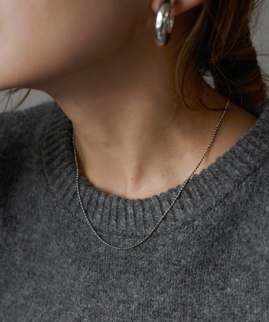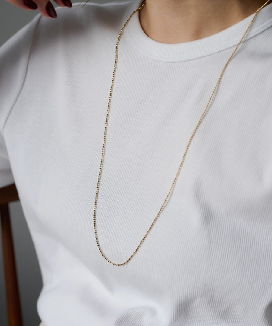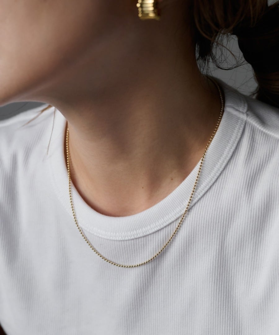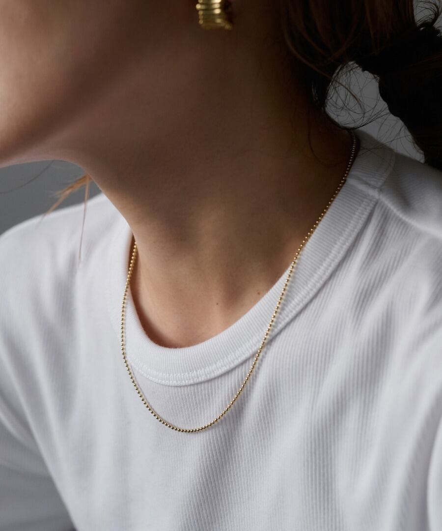 細かな球体を連ねたボールチェーンが、控えめながら上品な輝きを放つネックレス。
