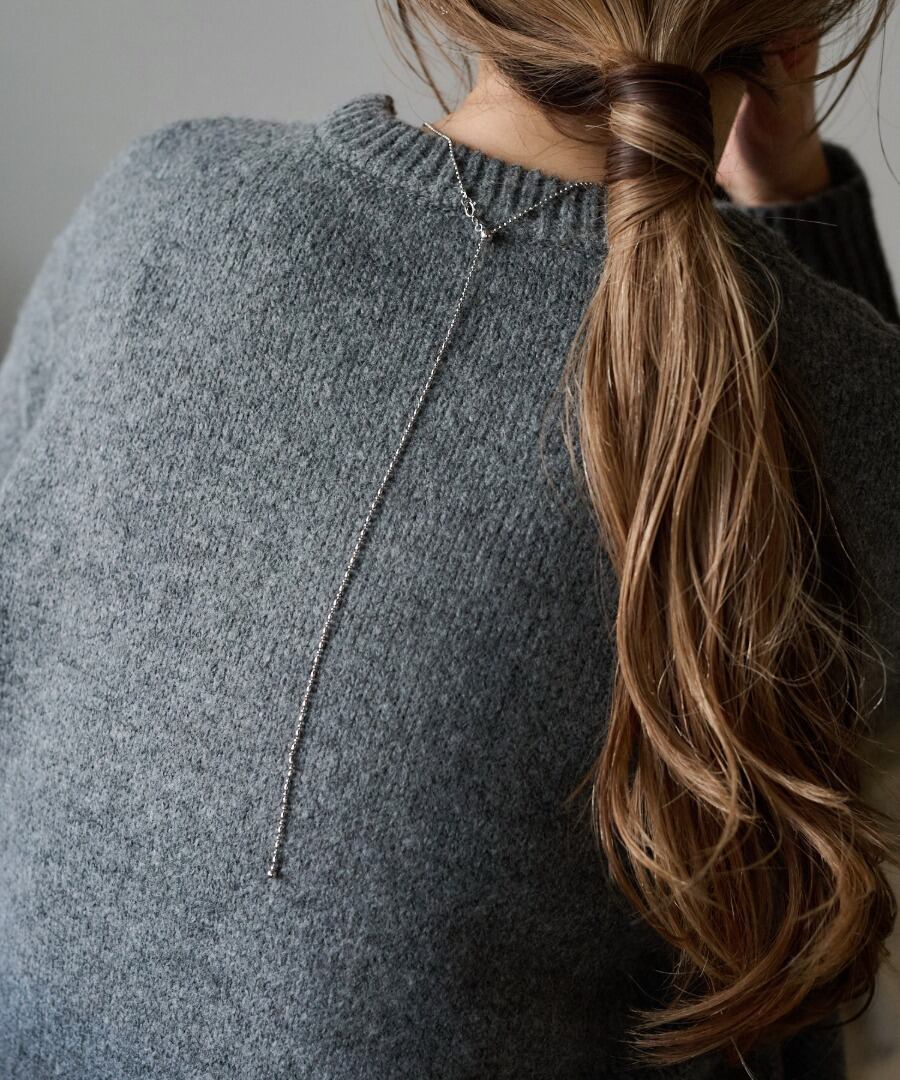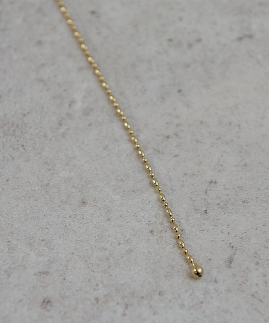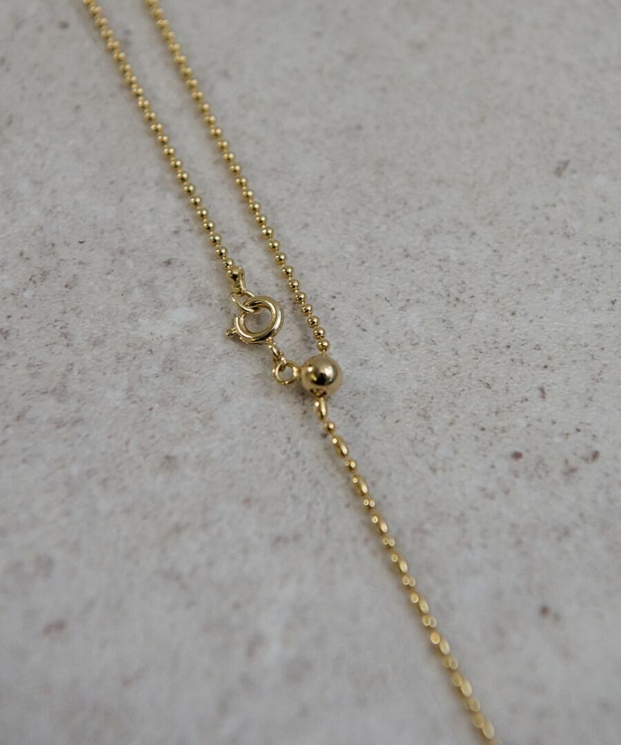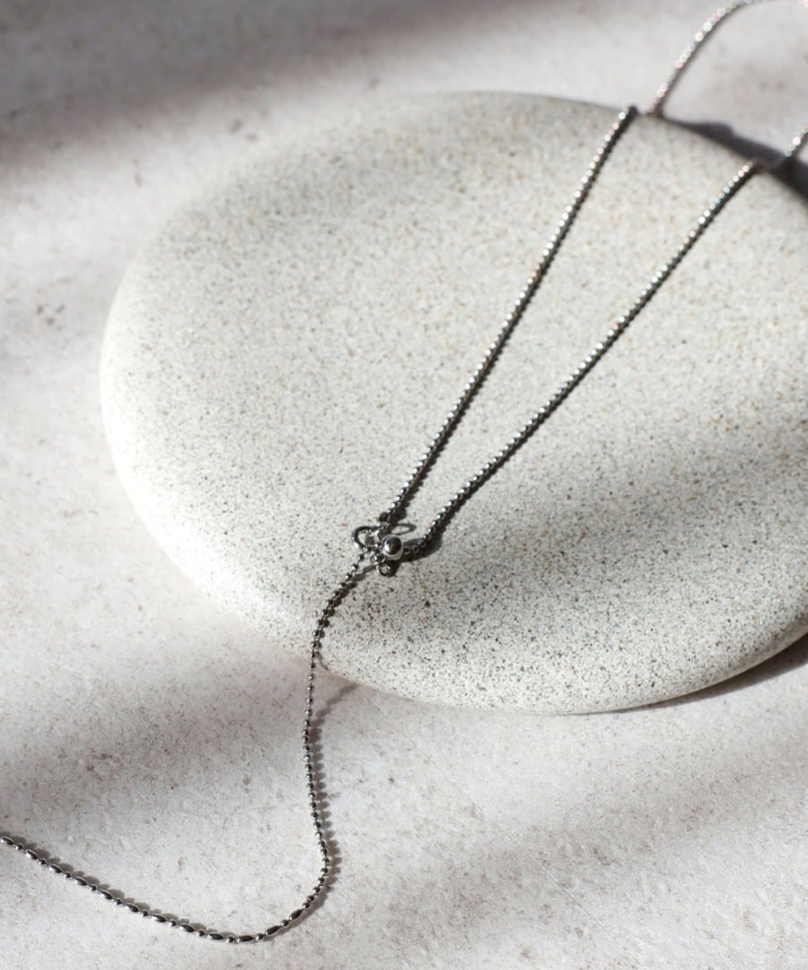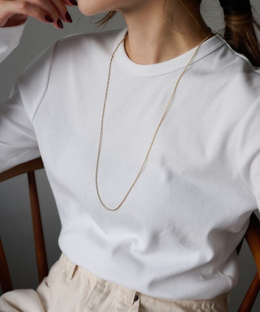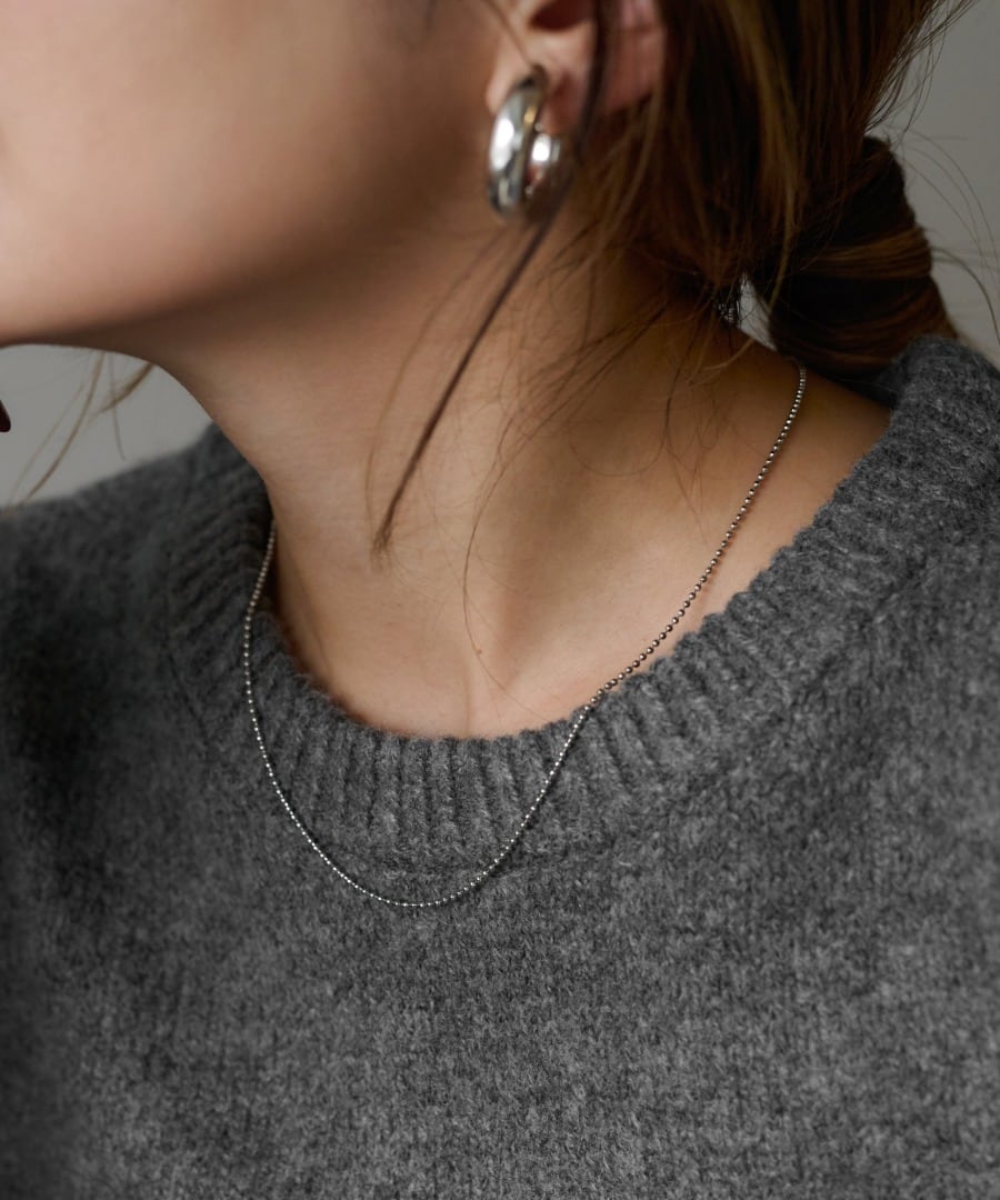 細かな球体を連ねたボールチェーンが、控えめながら上品な輝きを放つネックレス。