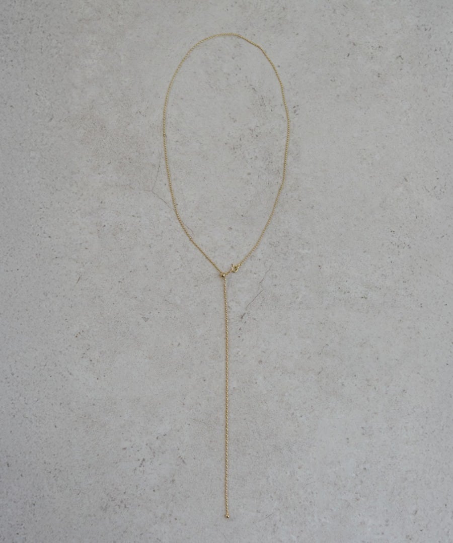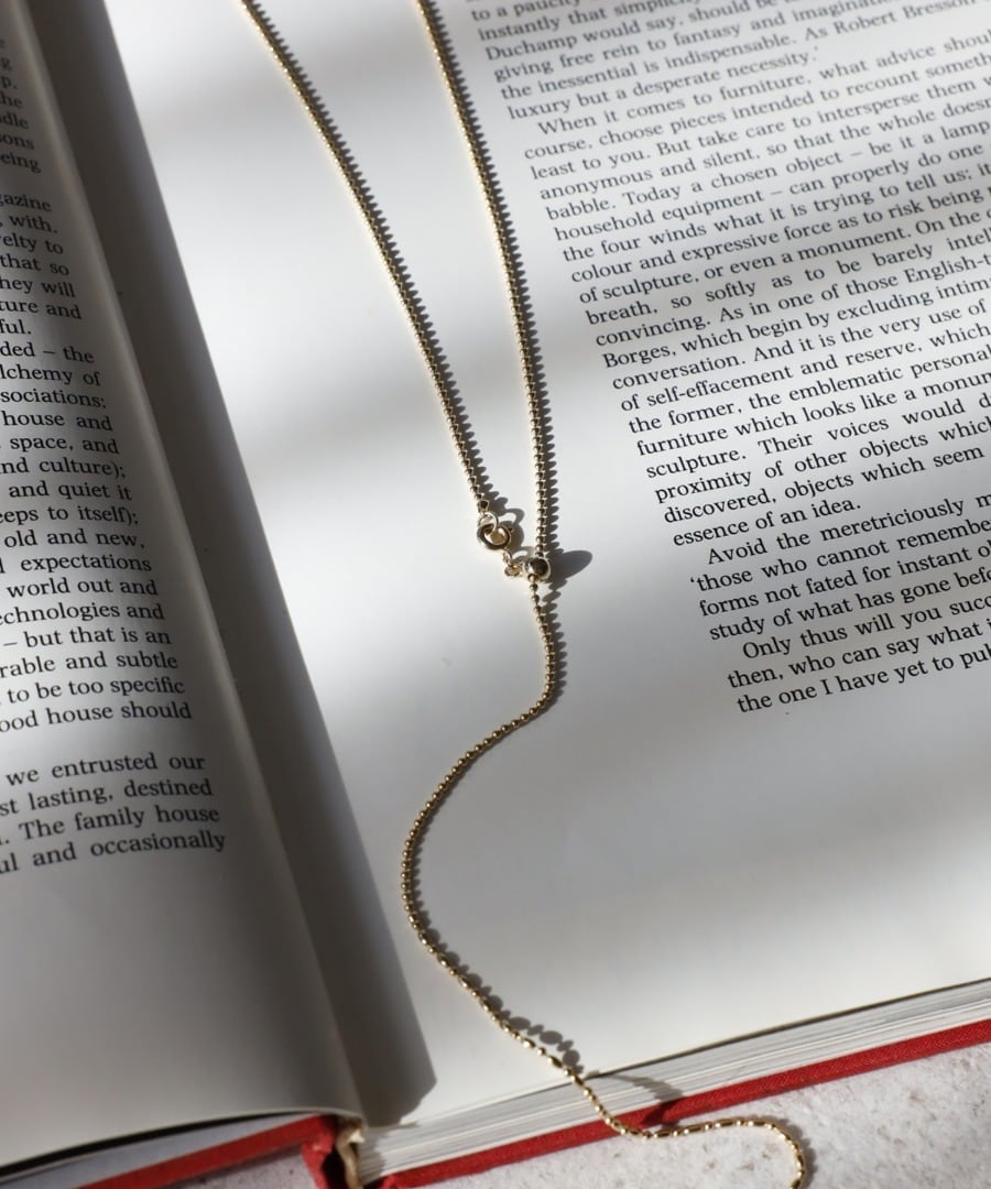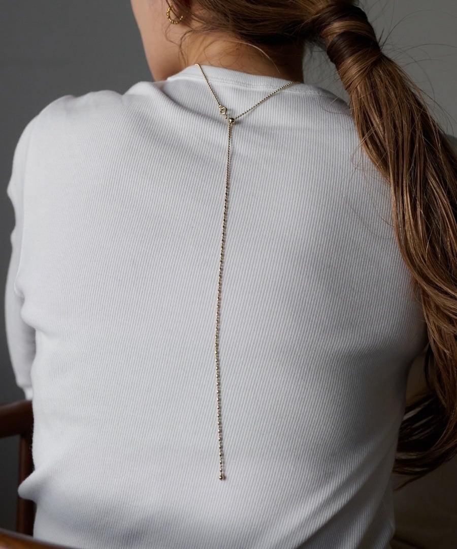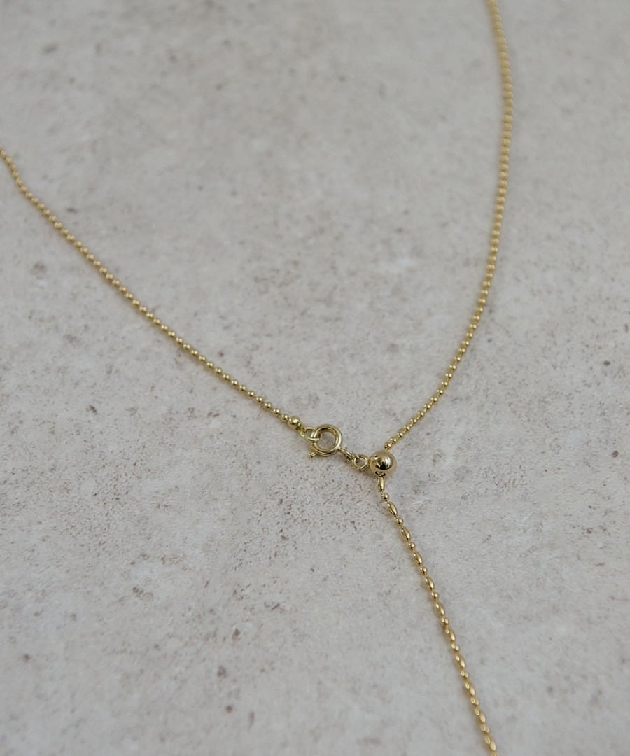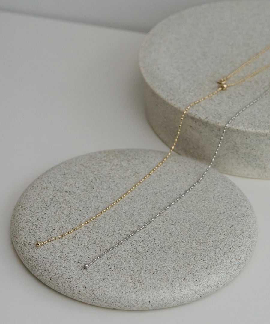 細かな球体を連ねたボールチェーンが、控えめながら上品な輝きを放つネックレス。
