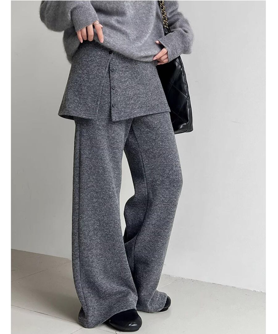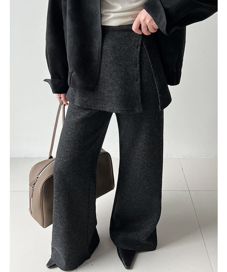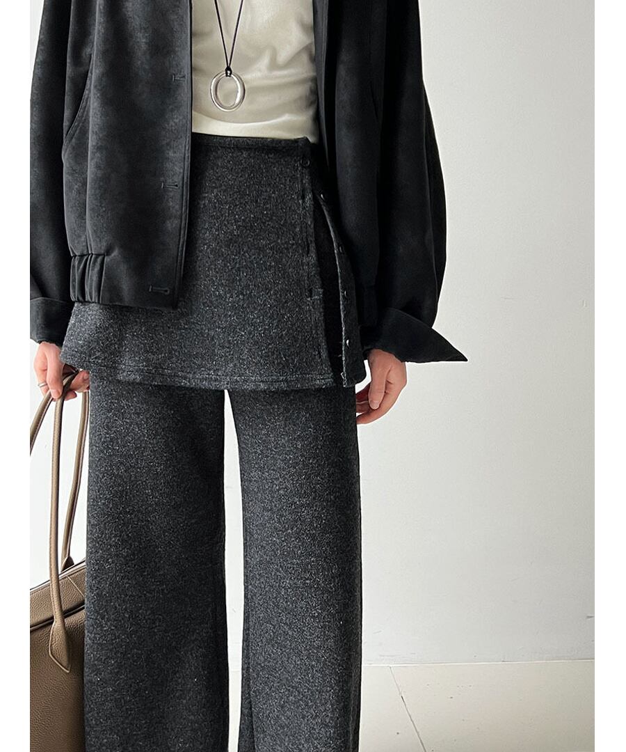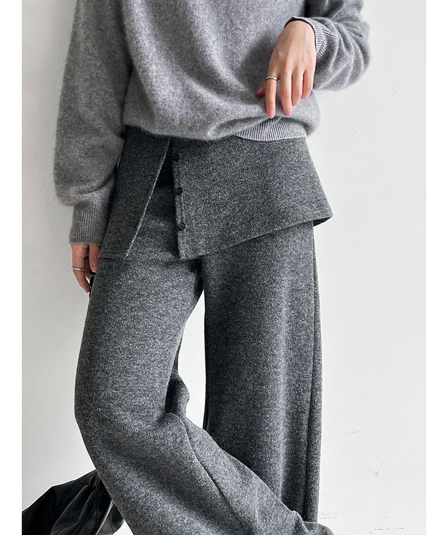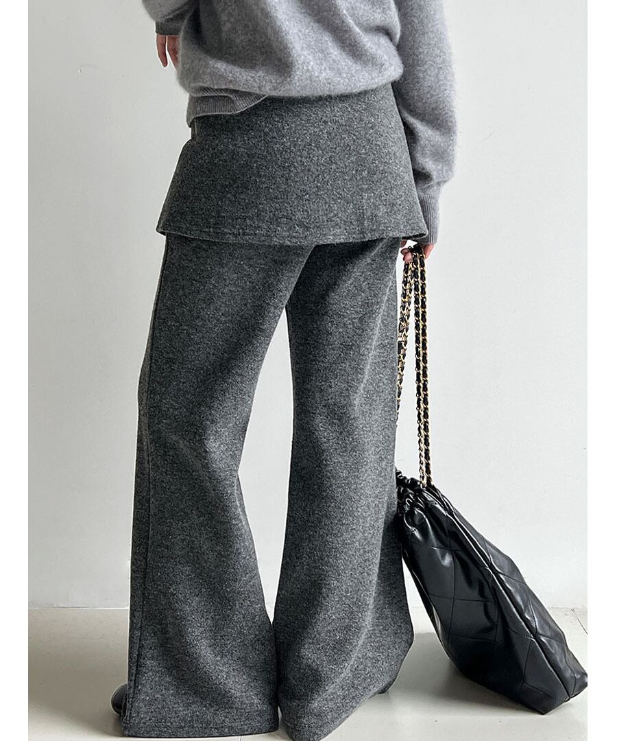 トレンド感満載のニットパンツに、スカートを重ねたようなリラックス感のあるセット。
