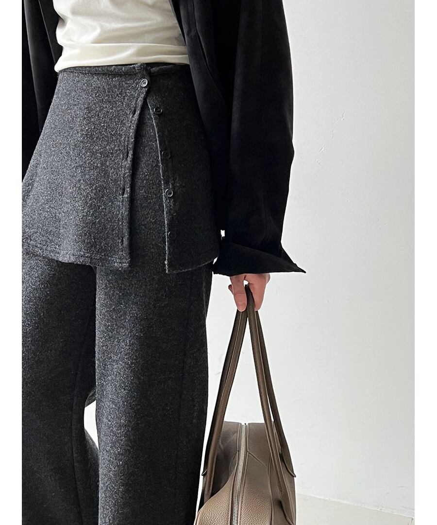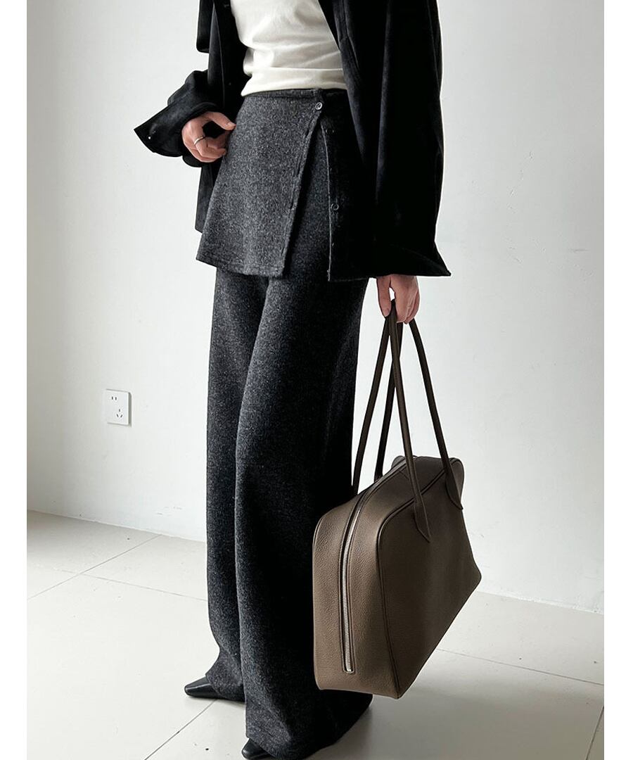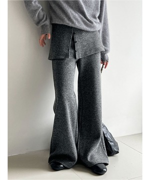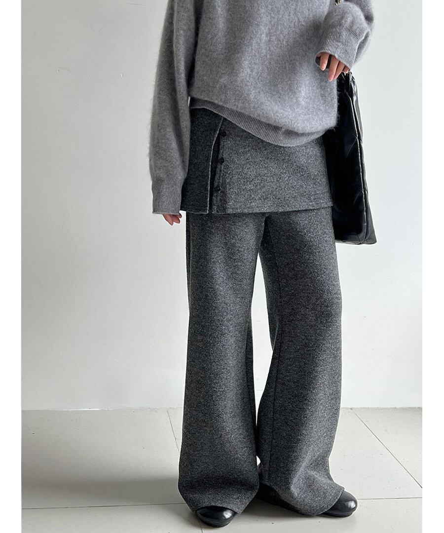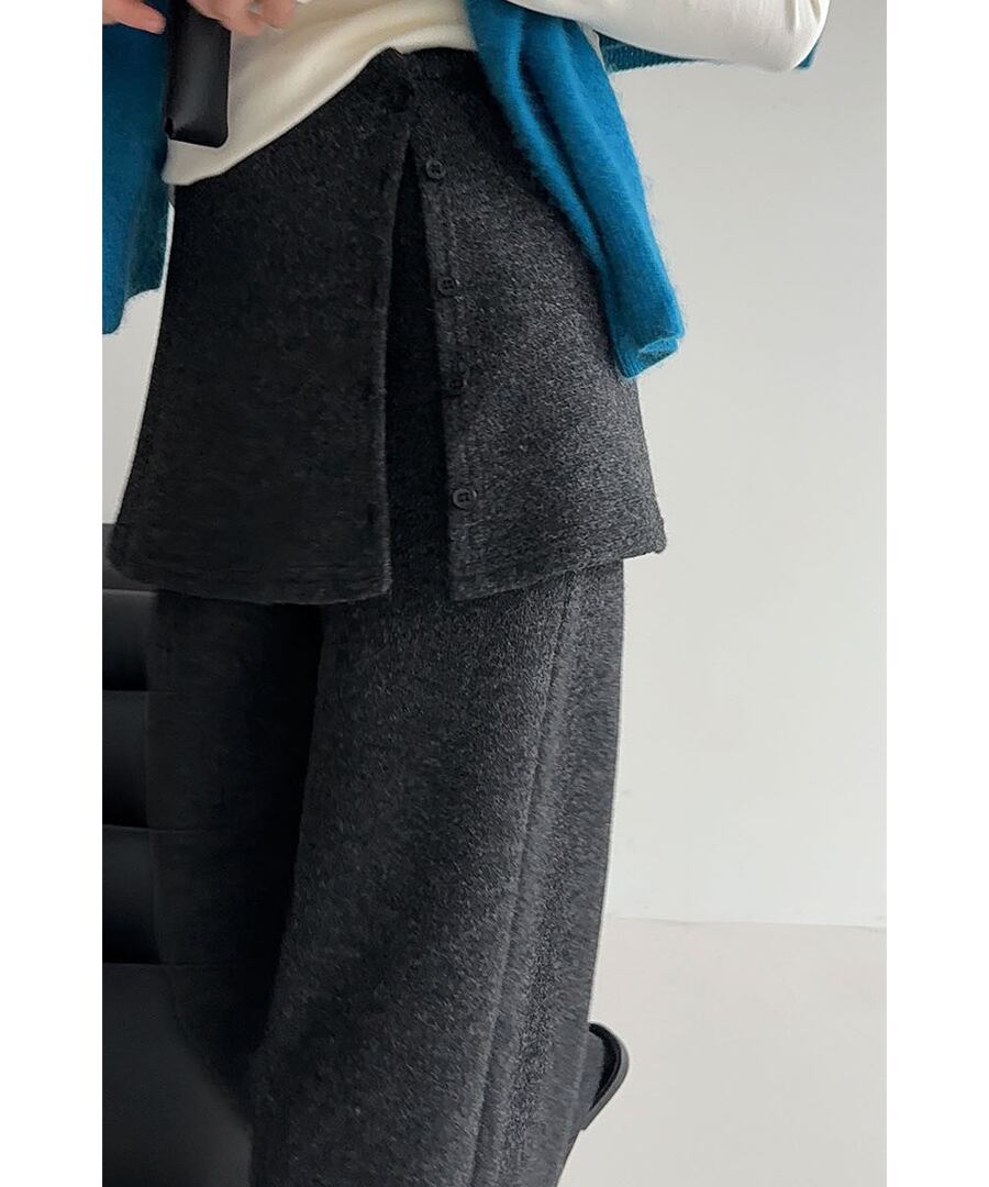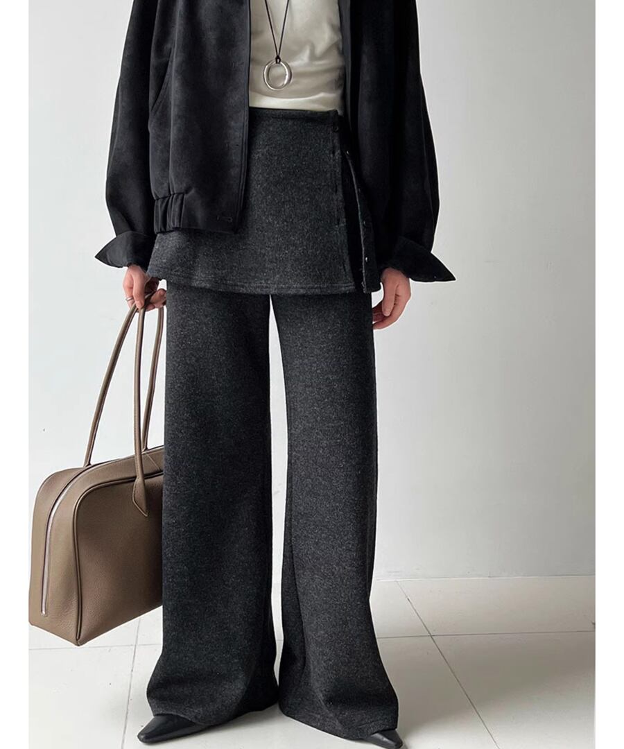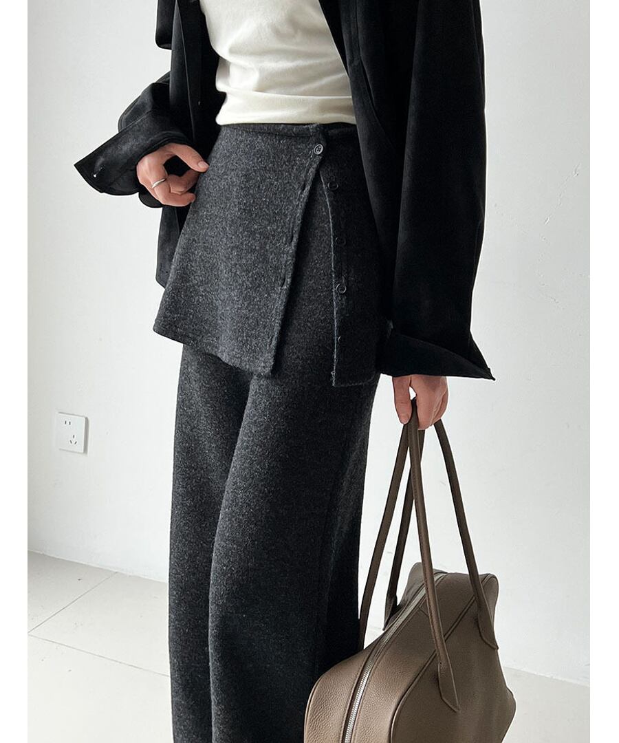トレンド感満載のニットパンツに、スカートを重ねたようなリラックス感のあるセット。