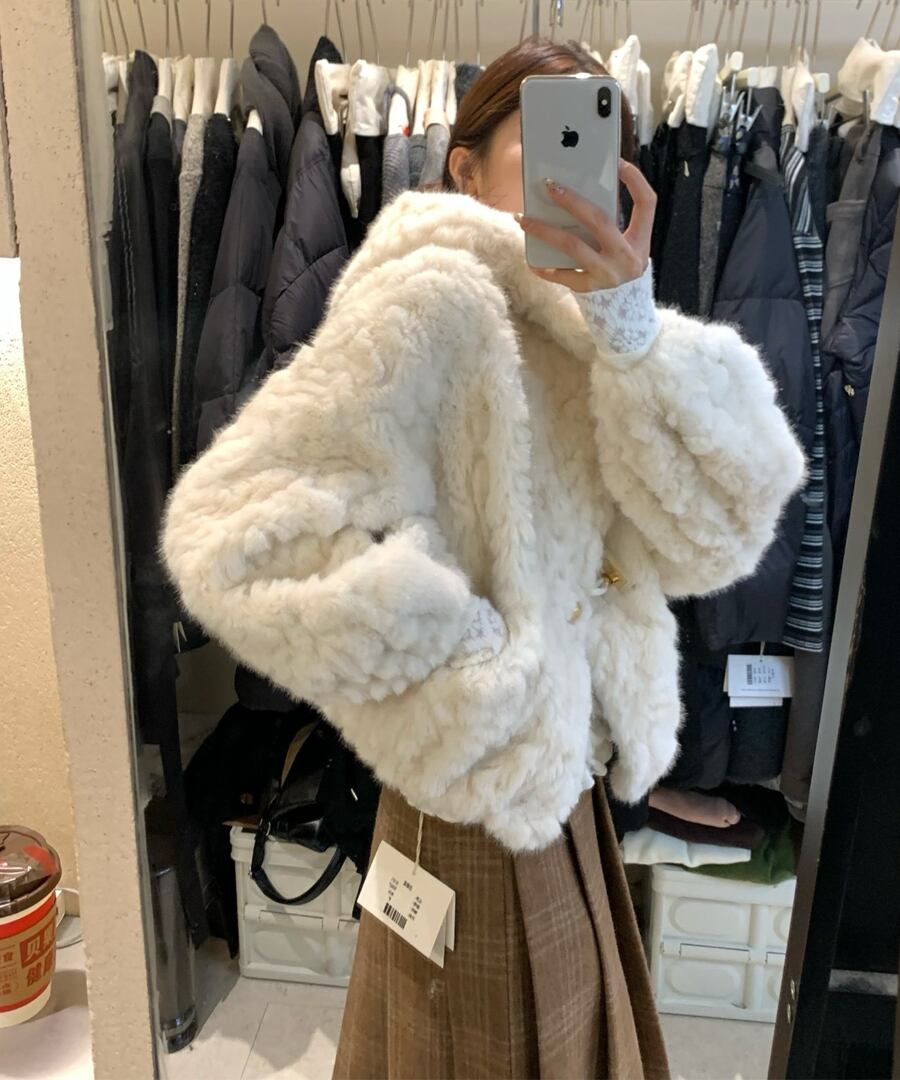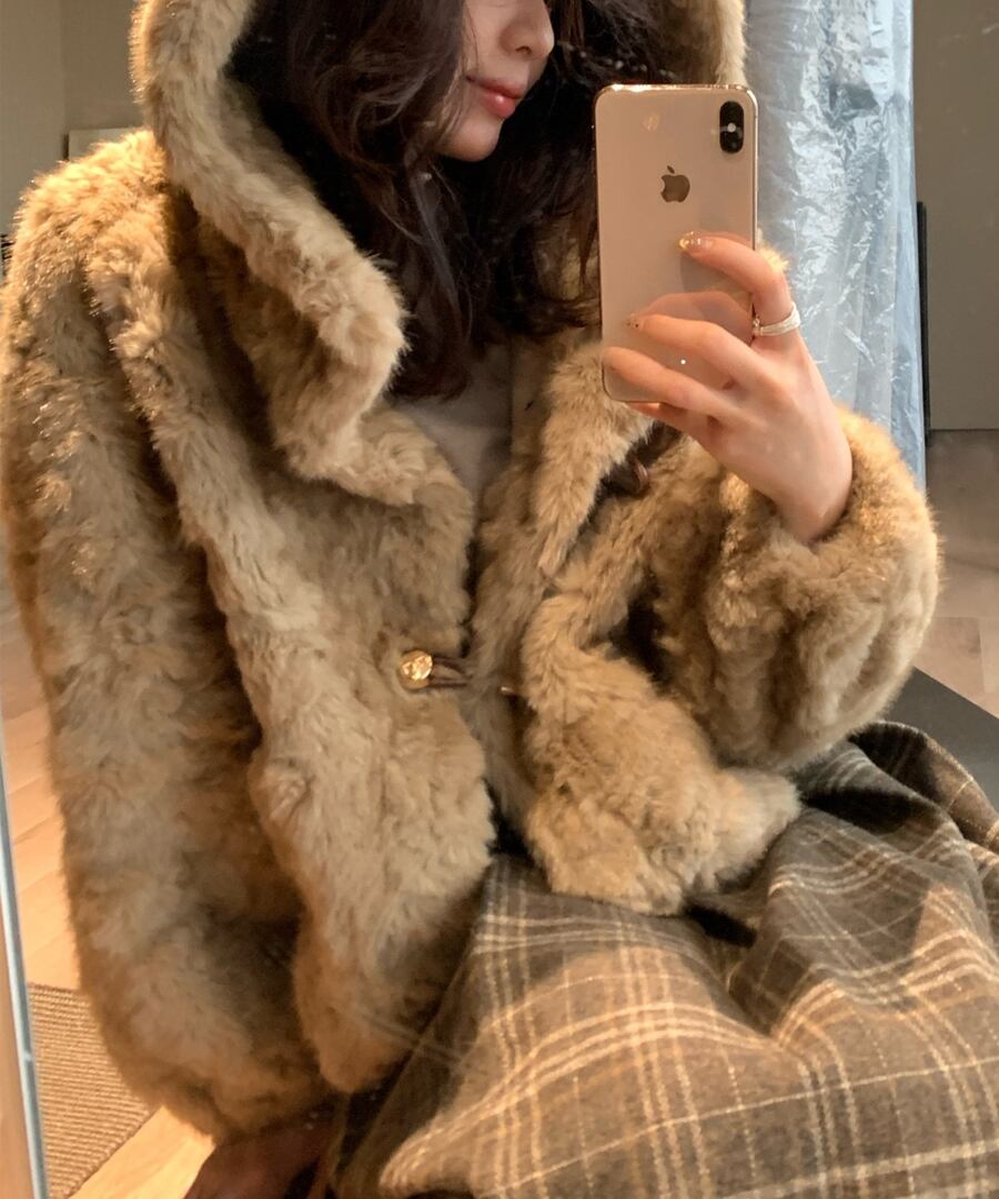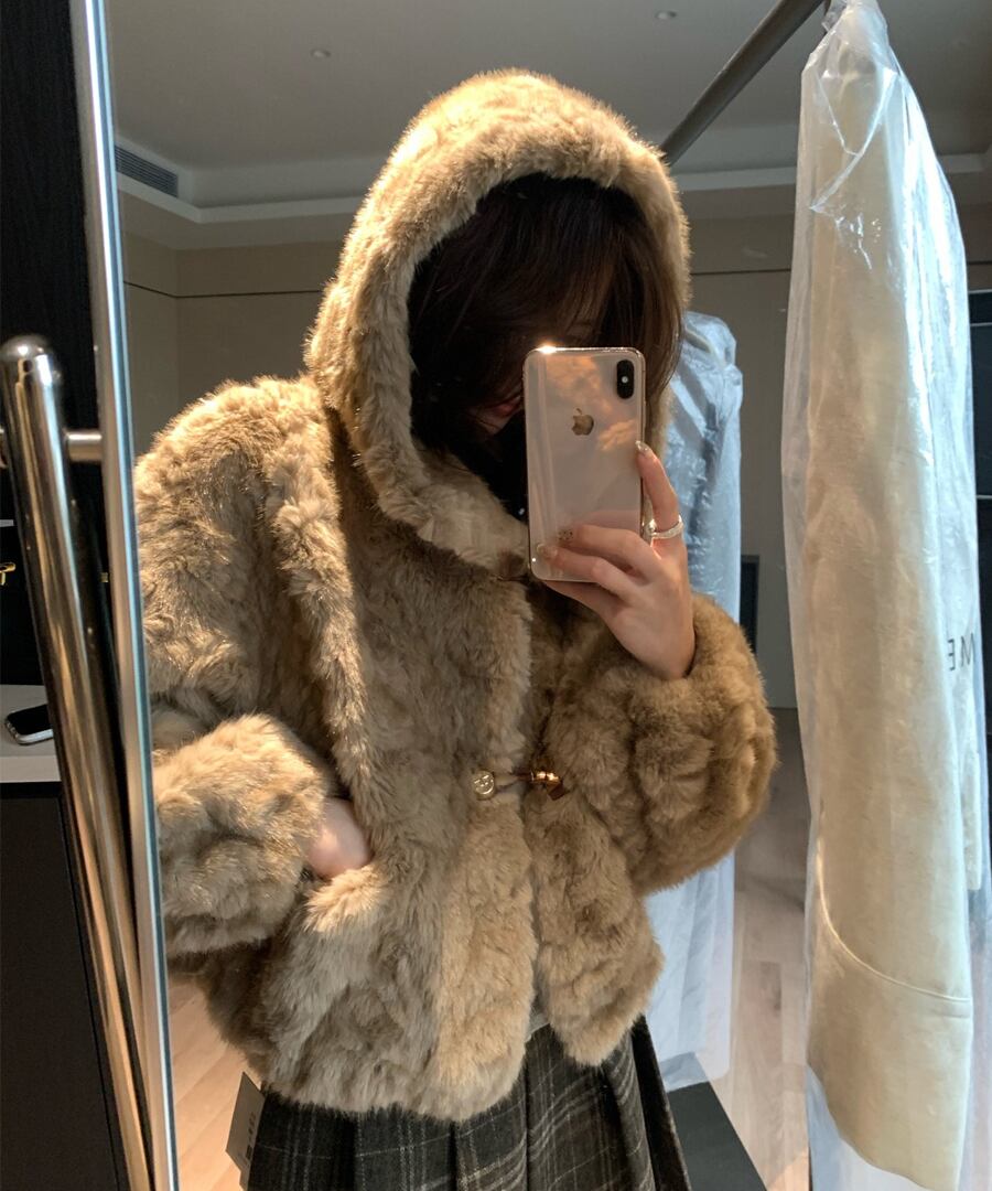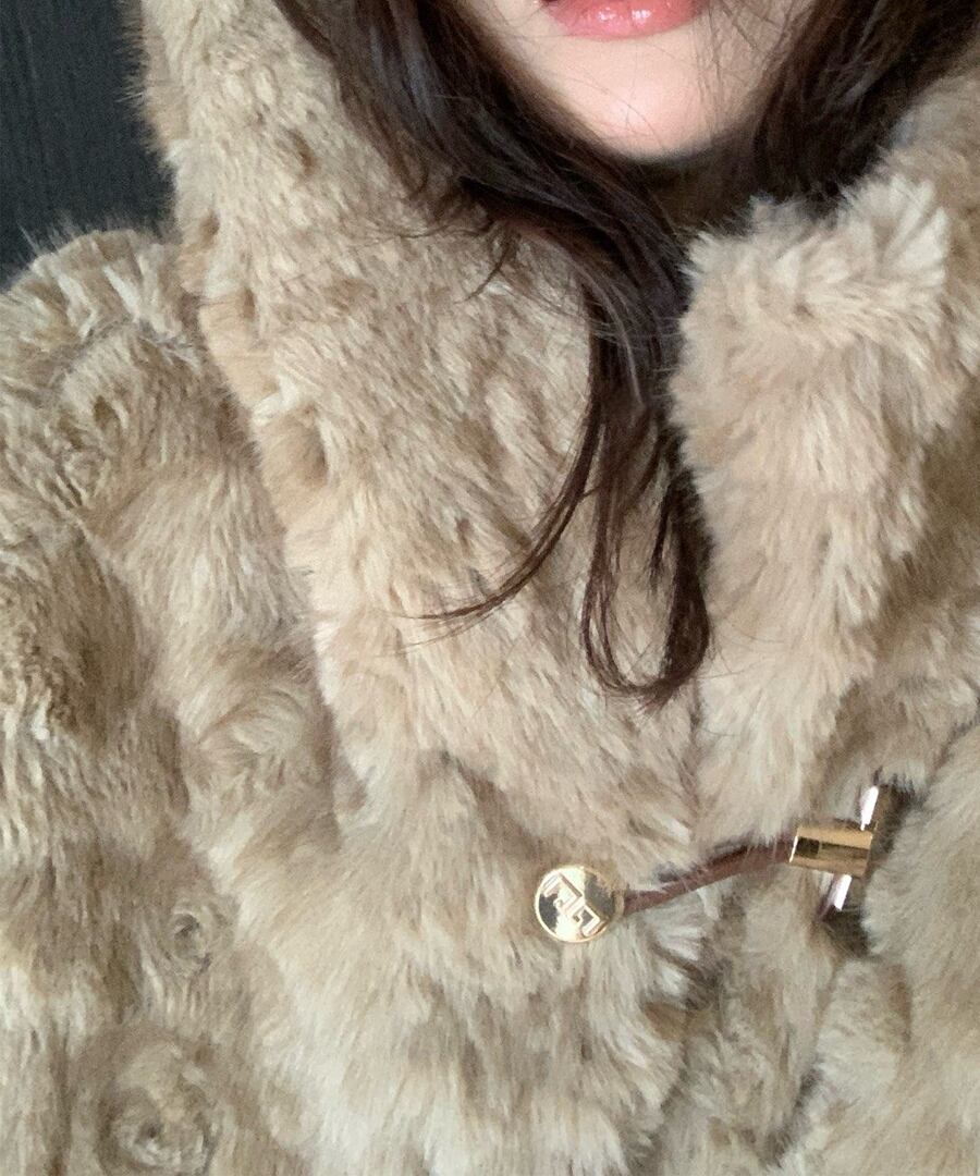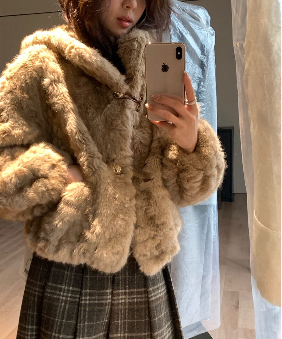 寒い季節にぴったりの魅力的なフェイクファーのフードショートコート。