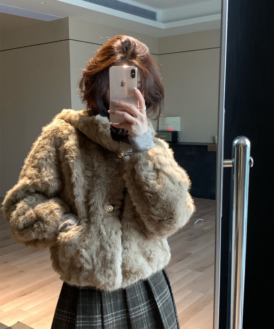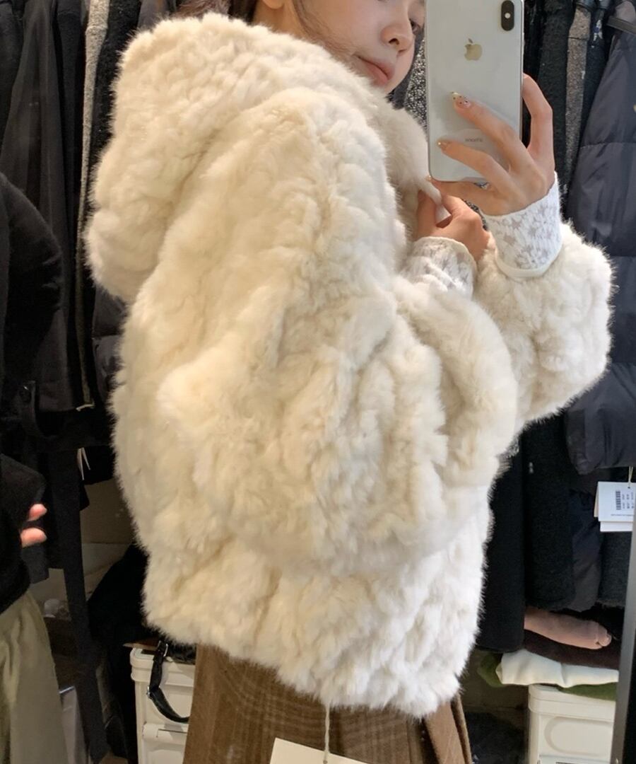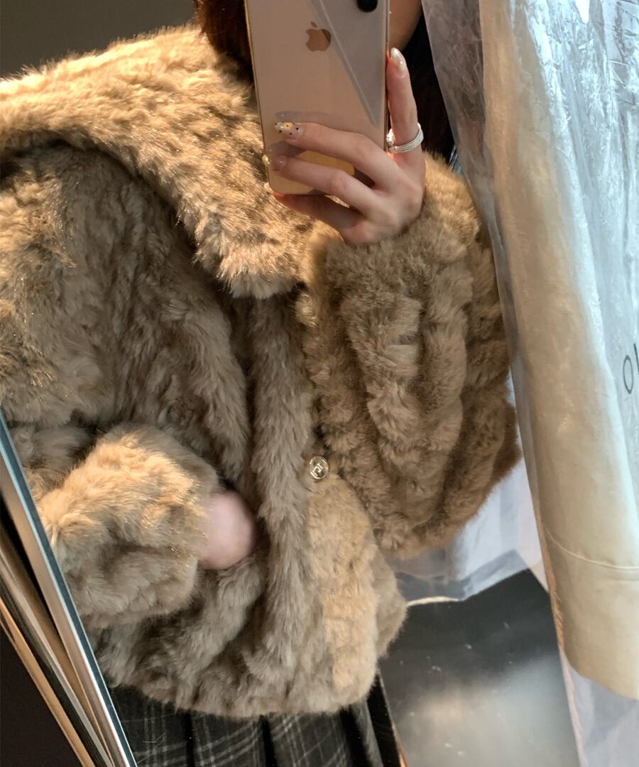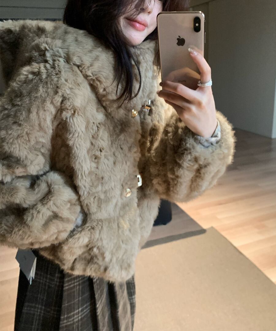 寒い季節にぴったりの魅力的なフェイクファーのフードショートコート。