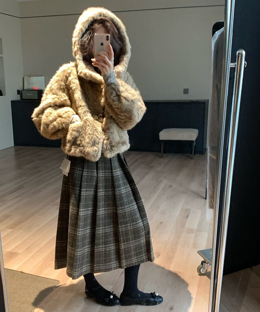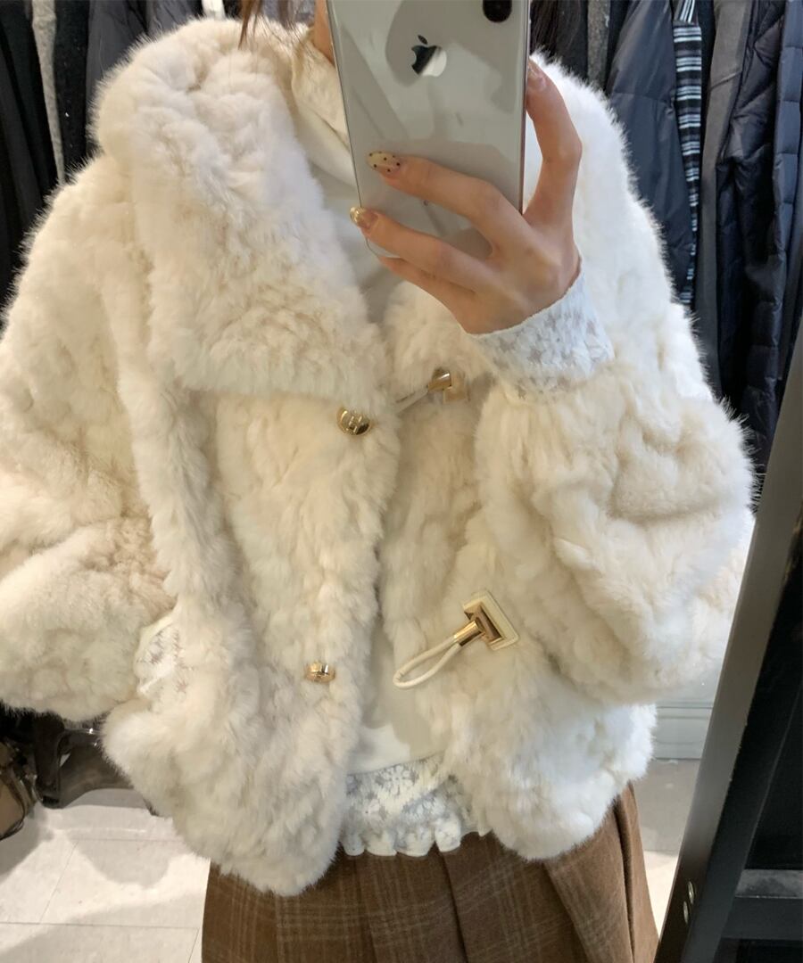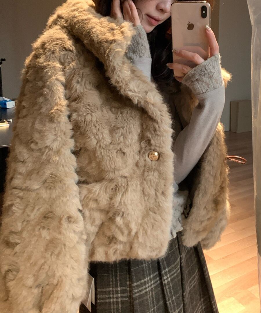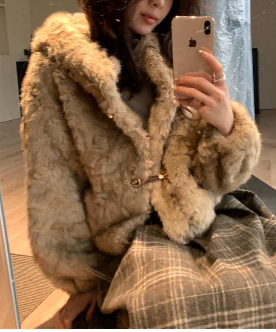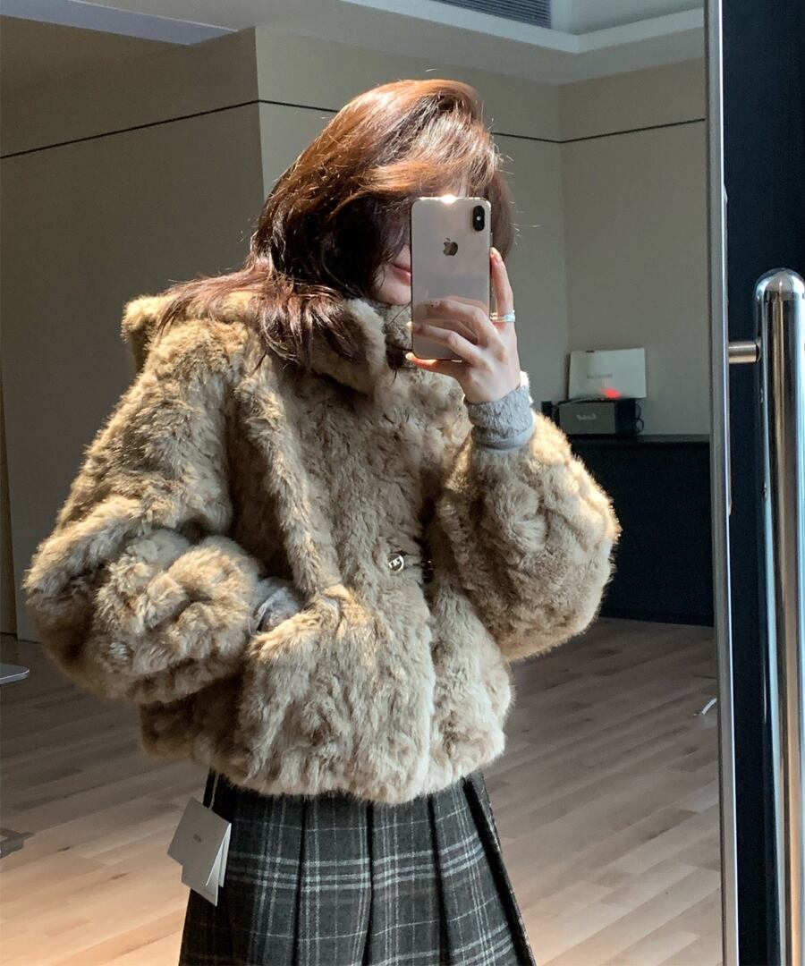 寒い季節にぴったりの魅力的なフェイクファーのフードショートコート。